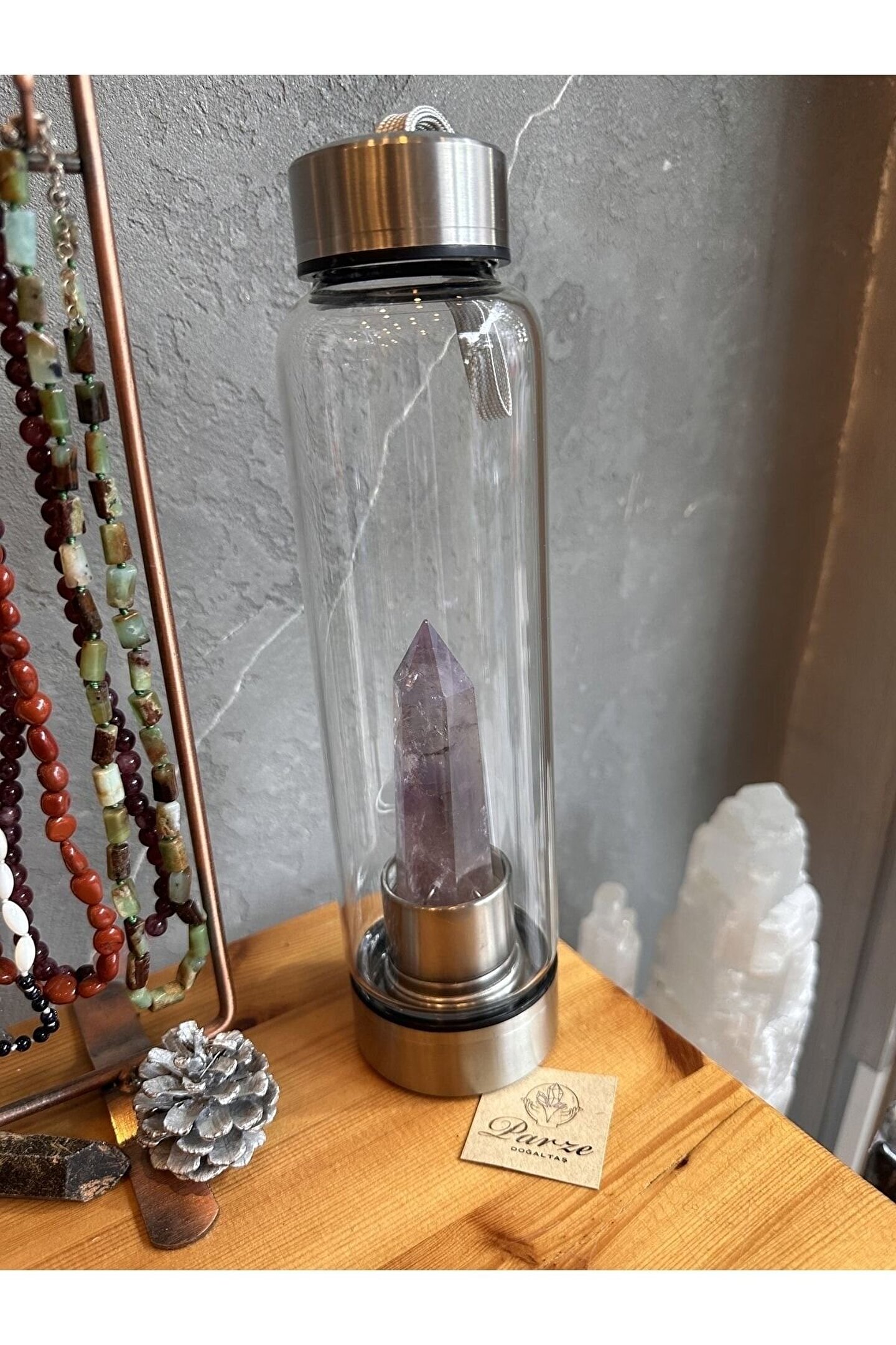 Doğal ametist taşı ile süslenmiş, şık ve zarif bir tasarıma sahip; Cam malzemesi sayesinde dayanıklı ve uzun ömürlü kullanım sunar; Su şişesi olarak tasarlanmış olup, içeceklerinizi taze ve sağlıklı bir şekilde saklamanızı sağlar; Ametist taşı, hem estetik görünümü hem de enerji verici özellikleri ile dikkat çeker;