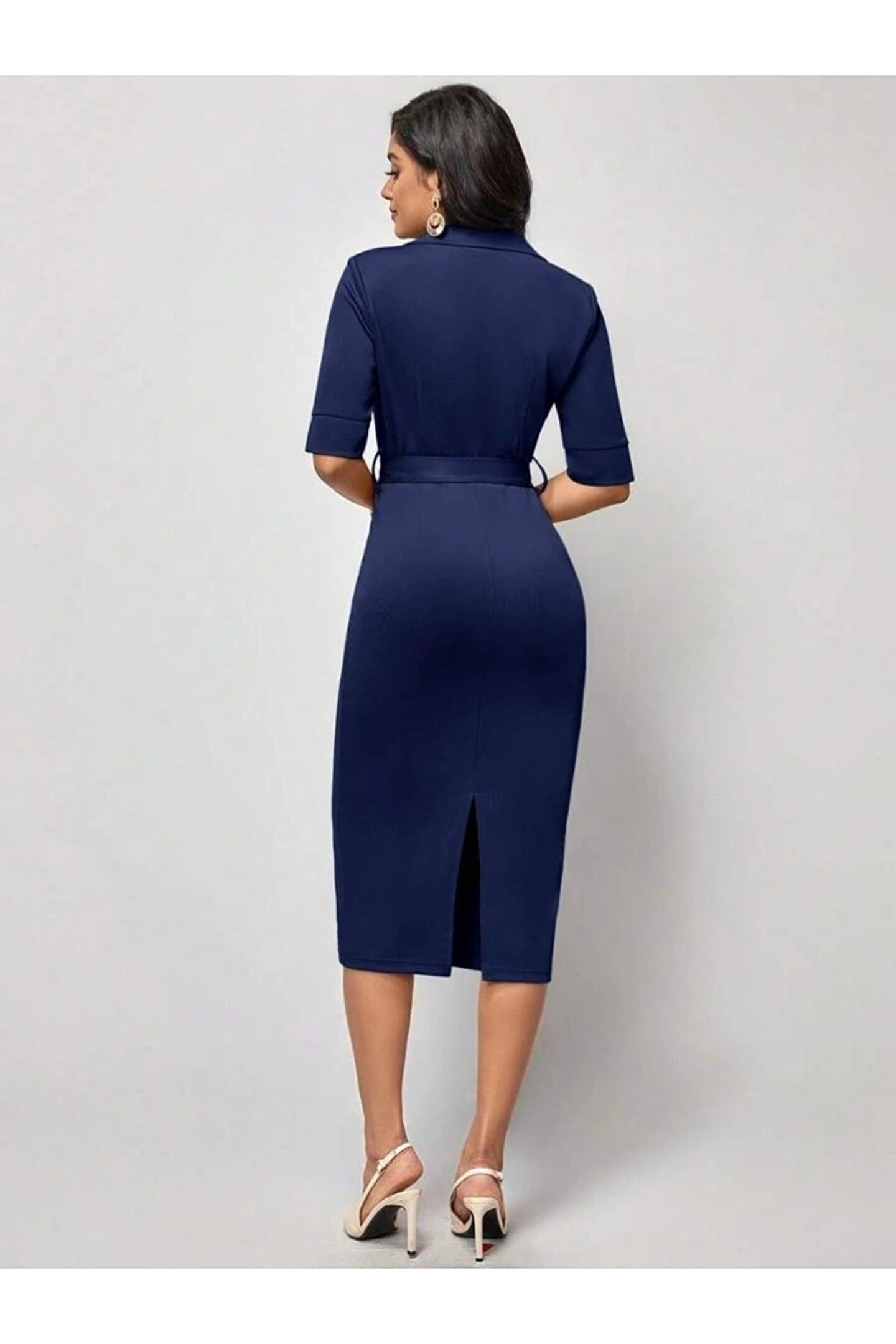 Kadın Kısa Kollu Yakalı Kruvaze Yakalı Beli Kemerli Midi Modal Elbise