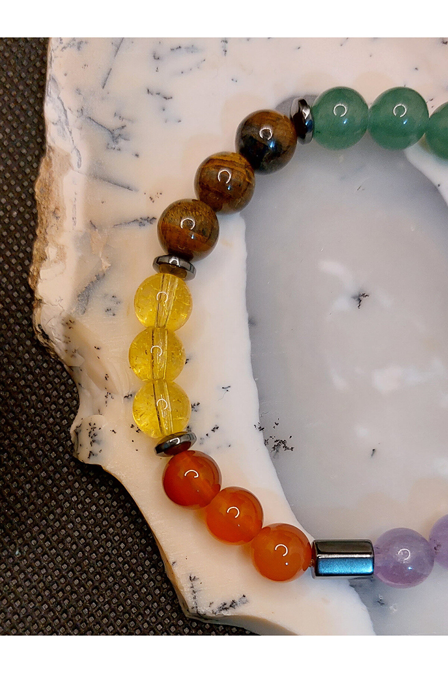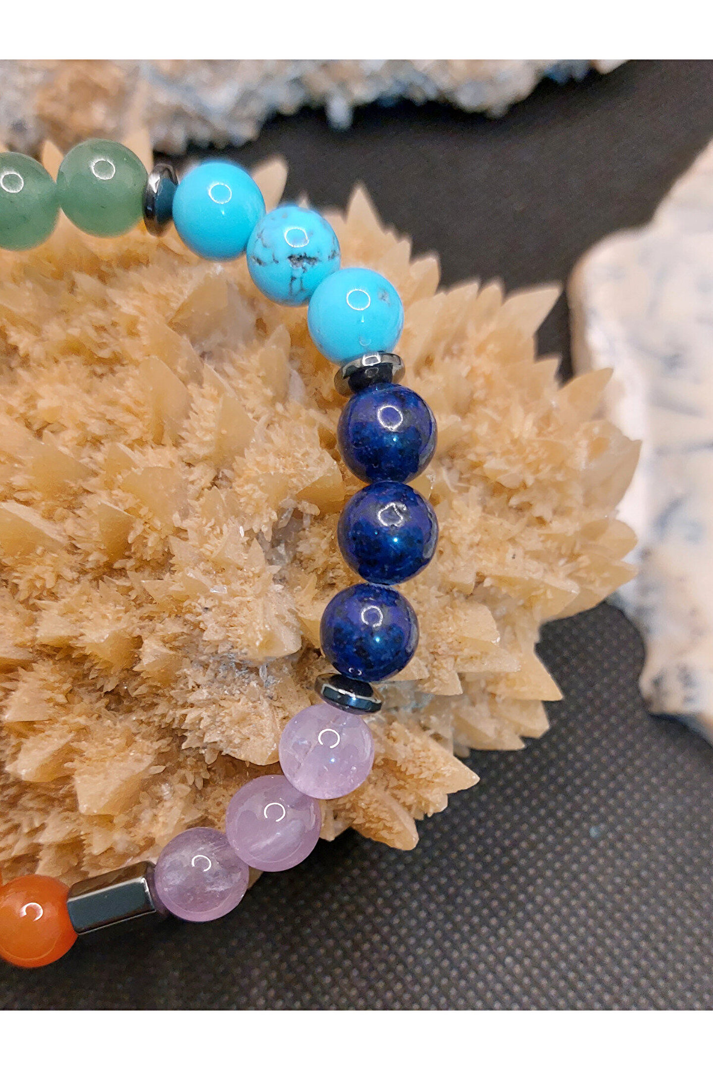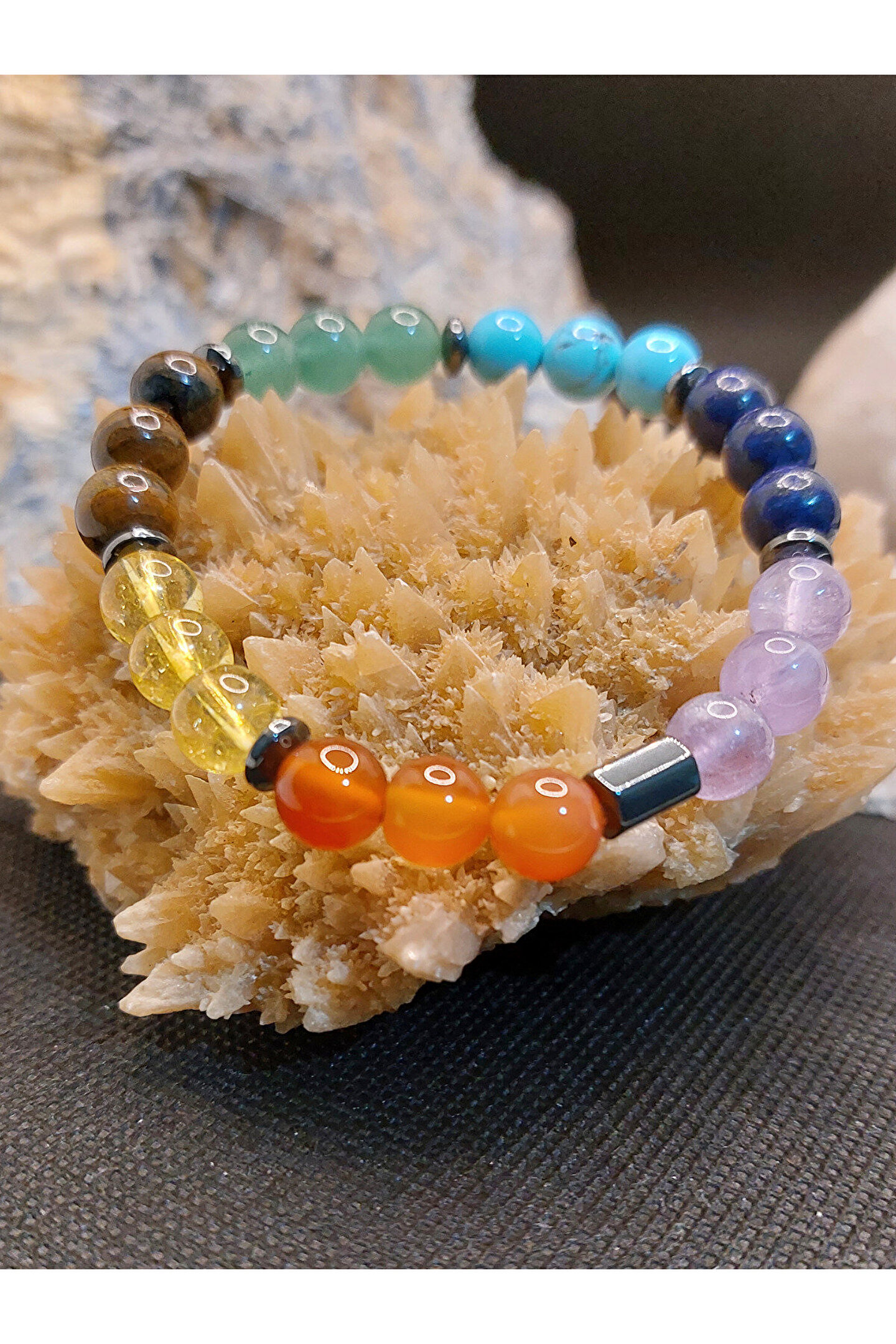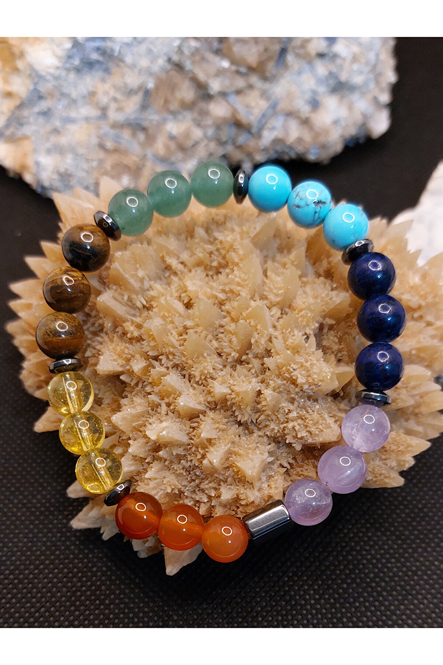 Çakra taşları ya da şifa kristalleri, bu enerji tekerlekleriyle en çok etkileşime girebilen taşlardır. ; Bu taşların yaydığı titreşimler çakraların hizalanmasına yardımcı olur. ; Çakra taşları, çakranın doğal iyileşme sürecini destekleyen, çeşitli renklerde farklı taş türleridir. ; Size sunmuş olduğumuz ÇAKRA BİLEKLİK, 7 farklı renge sahip gerçek değerli doğal taşların birleştirilmesi sonucu hazırlanmış eşsiz bir üründür. ; Siz değerli takipçilerimize, isteğiniz doğrultusunda göndereceğimiz ÇAKRA bilekliğinde mevcut olan değerli doğal taşların özellikleri aşağıda sıralanmıştır. ; Ametist: Ametist, birkristal taşıdır ve genellikle mor renkte bulunur. ; Ametist, kristal yapısınedeniyle özellikle enerji düzenleme, meditasyon ve kişisel gelişim içinkullanılır. ; Aynı zamanda, ametist taşı , stresi azaltmaya, dikkat vekonsantrasyonu arttırmaya ve duygusal dengeyi sağlamaya yardımcı olur. ; Lapis Lazuli: Lapislazuli, doğru iletişimi ve anlayışı geliştirmeye yardımcı olur. ; Bukristalle çalışmak kişinin sezgilerini güçlendirirken, içsel düşünce veduygularınızla bağlantı kurmayı sağlar. ; Antik Mısır ve Roma'da güçlü bir tılsımolduğu, ruhu kötülüklerden arındırdığına inanılırdı. ; Turkuaz: Kişiye şansve uğur getirdiği bilinmektedir. ; Kaygı duygusuna karşı etkilidir. ; Başarıgetirir. ; Nazara karşı koruyucu etkisi vardır. ; Tansiyonu dengeler. ; Kalphastalıklarına karşı koruyucu etkisi vardır. ; Takı olarak kullanıldığı takdirdeetkisi daha da artmaktadır. ; Aventurin: Aventurintaşı, kuvars ailesinden bir taş olup, birçok faydası vardır. ; Taşın en önemlifaydaları arasında duygusal dengeleme, zihin açıklığı ve fiziksel sağlık bulunur.Aventurin taşı, stresi azaltmak ve ruh halini dengelemek için kullanılabilir.Ayrıca, zihni sakinleştirmeye ve odaklanmaya yardımcı olur. ; Kaplangözü: Kaplan gözü kişiyeazim, denge, cesaret ve sezgisel yetenekleri arttırmada güç verir. ; Motivasyonsağlar ve hem iç hem de dış huzuru ortaya çıkarmada destek olur. ; Korku,kıskançlık gibi duyguları dengelemeyi sağlar. ; Endişe ve stres gibi faktörlerinüstesinden gelmek için faydalıdır. ; Sitrin: Bolluk vebereketi kendisine çektiğine inanılır. ; Özgüven problemi yaşayanlar içinidealdir. ; Kişiye ilham ve motivasyon verir. ; Güneşle ilişkilendirilmesindendolayı, yaşam enerjisi ve mutluluğun taşıdır. ; Etrafına pozitif enerji yayar. ; Başarınıntaşıdır. ; Zihni arındırarak, hedefe odaklanmayı sağlar. ; Akik: NegatifEnerjilerden Korur. ; Akik taşı, insanları negatif enerjilerden korumak içinkullanılan bir taştır. ; Stresi Azaltır. ; Güçlü Bir Enerji Verir. ; İletişimiArtırır. ; . ; Kendine Güveni Artırır. ; ZihinselNetliği Artırır. ; Şık ve eşsiz Görünüm Sunar. ; Önemli not:Doğal taşlar yapıları gereği farklı renk ve ebatlarda olabilmektedir. ; Ürünlerimiz, gerçek doğal taşlardan özenle hazırlanmaktadır. ; Müşteri memnuniyeti, önceliğimizdir..;
