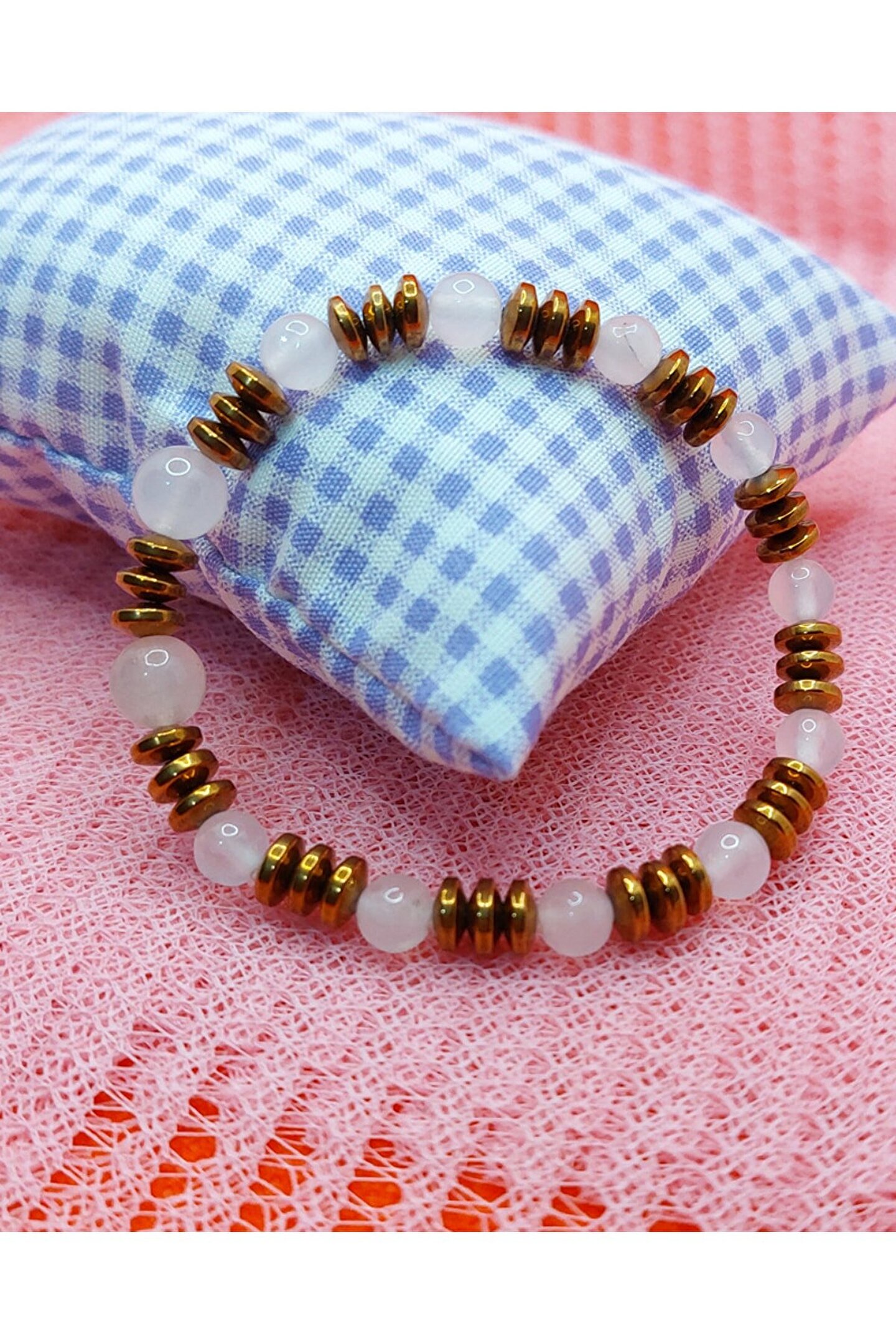 Pembe kuvars , kalp çakrasının taşıdır ve taşıyan kişiyi duygusal anlamda şifalandırır. ; Bulundurulduğu ortama sevgi, aşk, mutluluk ve huzur getirir. ; Olumsuz düşünceleri temizler, koşulsuz aşka yer açarak güçlenmesini sağlar. ; Romantik bağı teşvik eder. ; Hematit taşı, negatif enerjiyi temizlemeye yardımcı olur, stres ve endişe zamanlarında sakinleşmeyi sağlar . ; Çok koruyucu bir taştır ve topraklanmış kalmaya yardımcı olmak için taşınması çok iyidir. ; Kök Çakra ile çalışmak için de iyidir ve negatif enerjileri daha pozitif bir titreşime dönüştürmeye yardımcı olur. ; Ürünlerimiz, gerçek doğal taşlardan özenle üretilmiştir.;