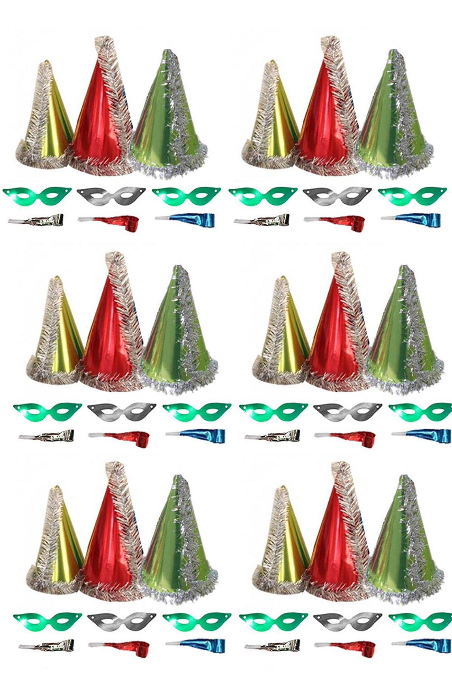 18 Adet Renkli 3'Lü Yılbaşı Katyon Set; Parti Maskesi, Parti Gözlüğü ve Kaynana Dili 1 Adet ''Karışık Renk Metalik Katyon Set'' karışık renklerde gönderilir.''Ebat : 27 cm'' yüksekliğindedir. ; Paket içerisinde Partilerin vazgeçilmez aksesuarı 1 adet kartondan simli parti şapka,1 adet Gözlük ve 1 adet Kaynanadili mevcuttur. ; Malzemesi :Parlak lakeli karton ;