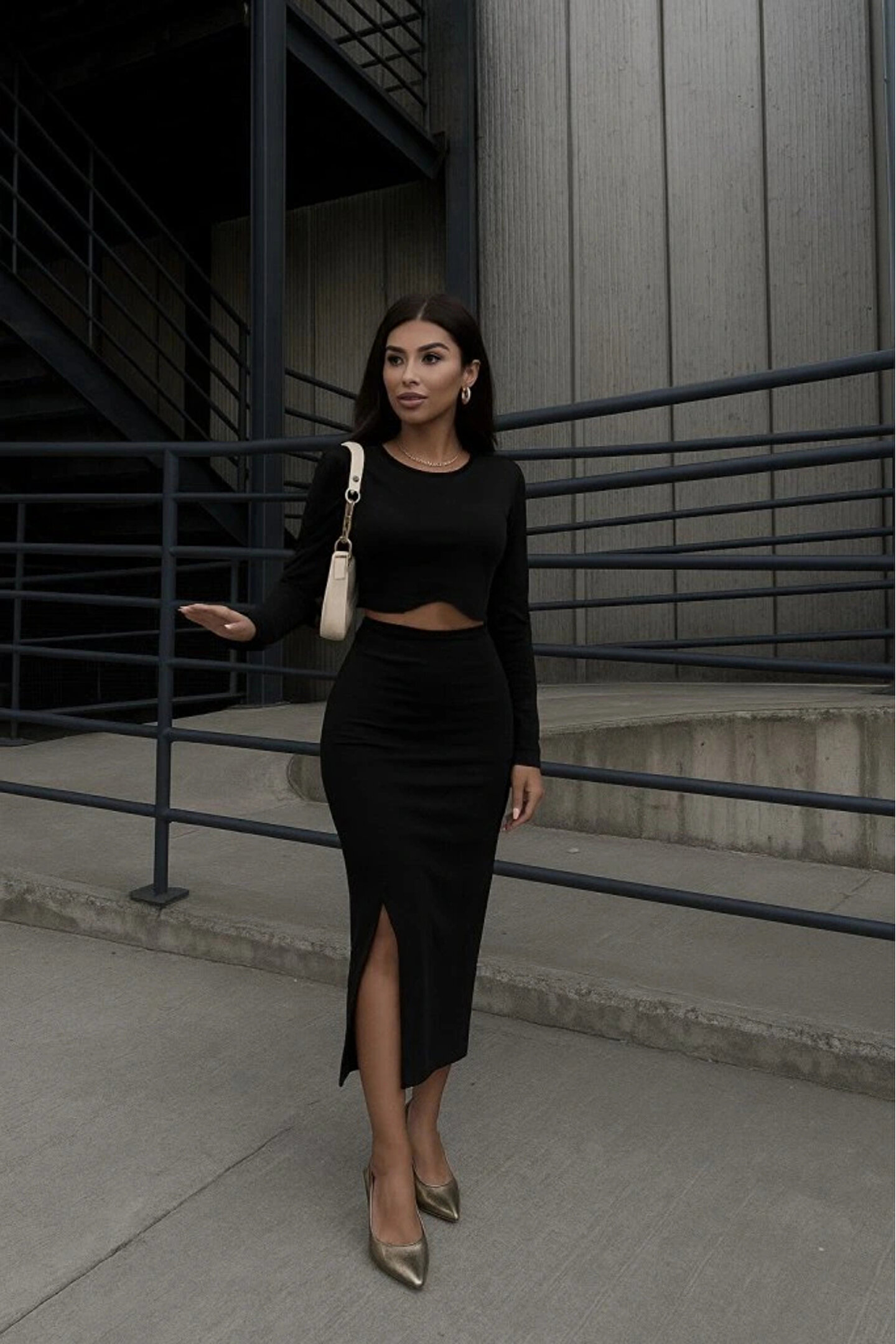 Kadın Uzun Kollu Bisiklet Yaka Kısa Krop Dalgıç Bluz Ile önden Yırtmaçlı Uzun Etek Ikili Takım