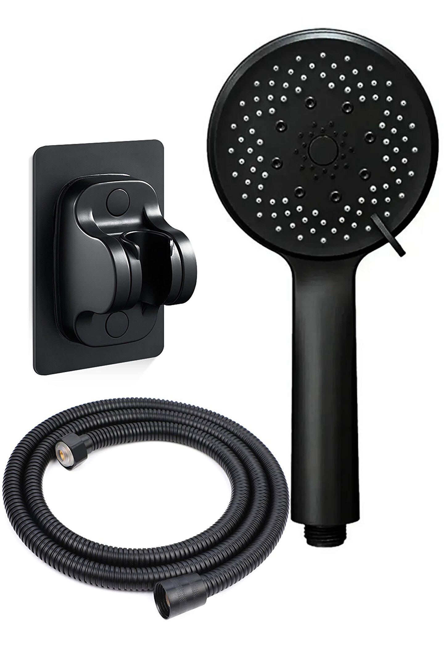 Siyah 5 Fonksiyonlu Yüksek Basınçlı Duş Başlığı Seti Modern siyah tasarımı ile banyonuza şıklık katarken, gelişmiş su çıkış teknolojisi sayesinde çok daha keyifli bir duş deneyimi yaşamanızı sağlar.; ; 5 Farklı Fonksiyon ile Kişisel Duş Deneyimi Yüksek Basınçlı Tazyik Modu Yüksek Basınçlı + Yağmurlu Mod Yağmurlu Mod Full Mod Spray / Sis Modu Her mod, su akışını farklı bir forma dönüştürerek rahatlatıcı ve güçlü bir duş hissi sunar.; ; Dayanıklı ve Şık Siyah Kaplama Sert darbelere karşı dayanıklı malzemeden üretilmiştir.; ; Siyah yüzeyi uzun süre ilk günkü görünümünü korumaya yardımcı olur.; ; 1,5 m Siyah Duş Hortumu 1,5 m uzunluğunda siyah hortum Paslanmaz somunlar Kaliteli sızdırmaz contalar Esnek yapısı sayesinde rahat hareket imkânı sunar ve uzun ömürlü bir kullanım sağlar.; ; Yapışkanlı Nano Duş Askısı – Delme Gerektirmez Kendinden yapışkanlı duş askısı Parlak ve temiz yüzeylere kolayca uygulanır Kırma, delme, çakma gibi montaj işlemlerine ihtiyaç yoktur Sudan etkilenmeyen nano yapışkan madde kullanılmıştır Bu sistem, klasik vidalı ve zamanla bozulan duş askılıklarını ortadan kaldırarak pratik ve sağlam bir çözüm sunar.; ; Yenilikçi ve Konforlu Kullanım Sizi yeni nesil duş sistemleriyle tanıştırmaktan memnuniyet duyuyoruz.; ; Farklı duş modları, dayanıklı yapısı ve delme gerektirmeyen montajı ile banyonuza hem konfor hem de modern bir görünüm kazandırır.; ;