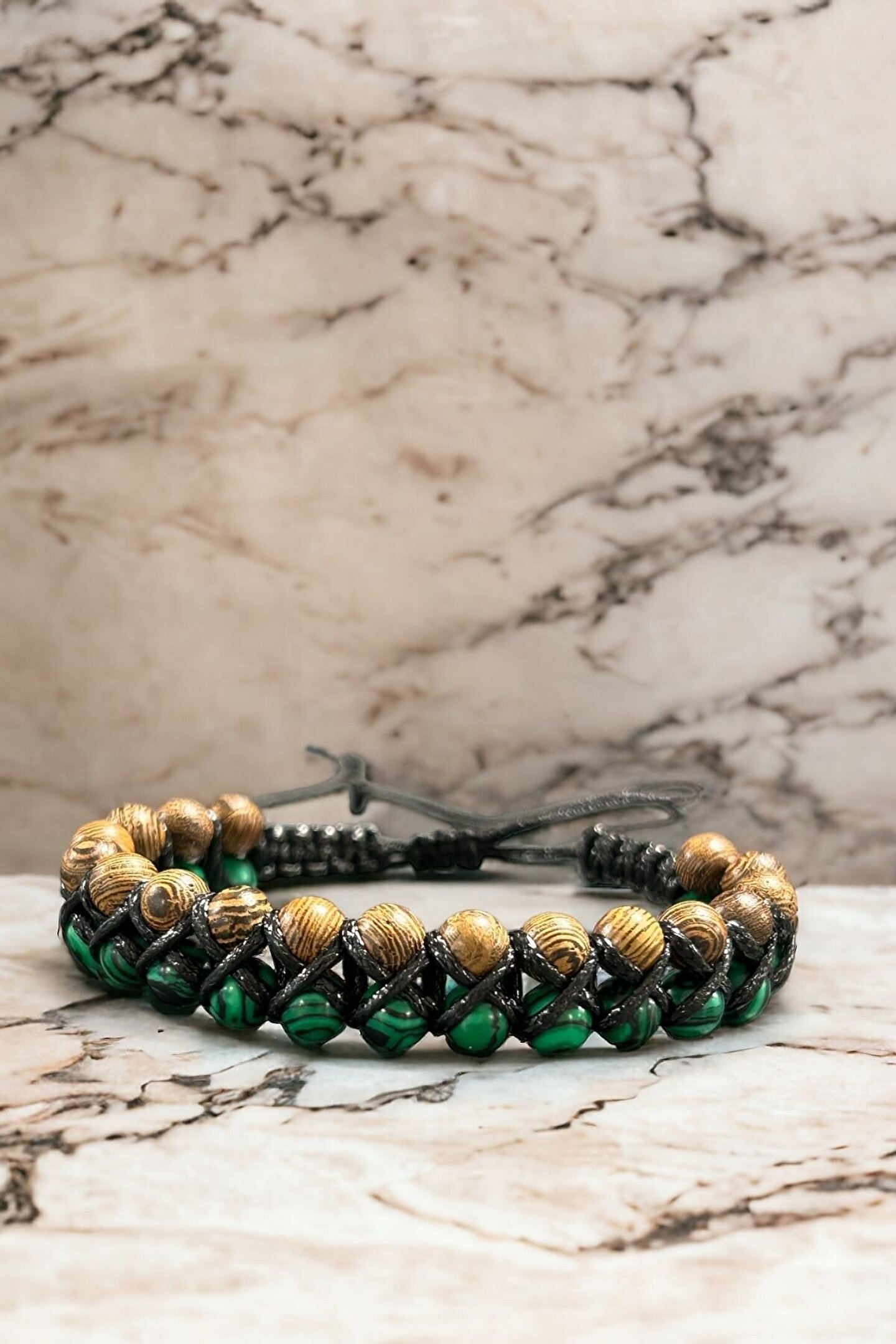 Aa kalite 6mm malahit taşı ve ud ağacı kullanılarak yapılmıştır. Tamamen el yapımıdır. Ayarlanabilir unisex bir bilekliktir. Her bileğe uygundur. 36 adet taş kulanılmaktadır. UD AĞACI: Öd ağacı uzun yıllardan beri varlığını sürdüren, ikiçenekliler sınıfına ait bir türdür. Ağaç Thymelaeaceae familyasına aittir. Meyveleri armut biçimindedir ve keskin bir kokusu vardır. Bu koku gövde ve dallarda çok daha yoğundur . Malahit taşı: Takı sektörü tarafından sıklıkla tercih edilen malakit taşının; sakinleştirici etkisi vardır ve negatif duyguları pozitife çevirmesiyle bilinir. Ayrıca vücudu rahatlatma, uykuya rahat dalma; suçluluk, korku, cesaretsizlik gibi duygulardan arınma, hafızayı güçlendirme, ağrıları kesme gibi özelliklere de sahiptir