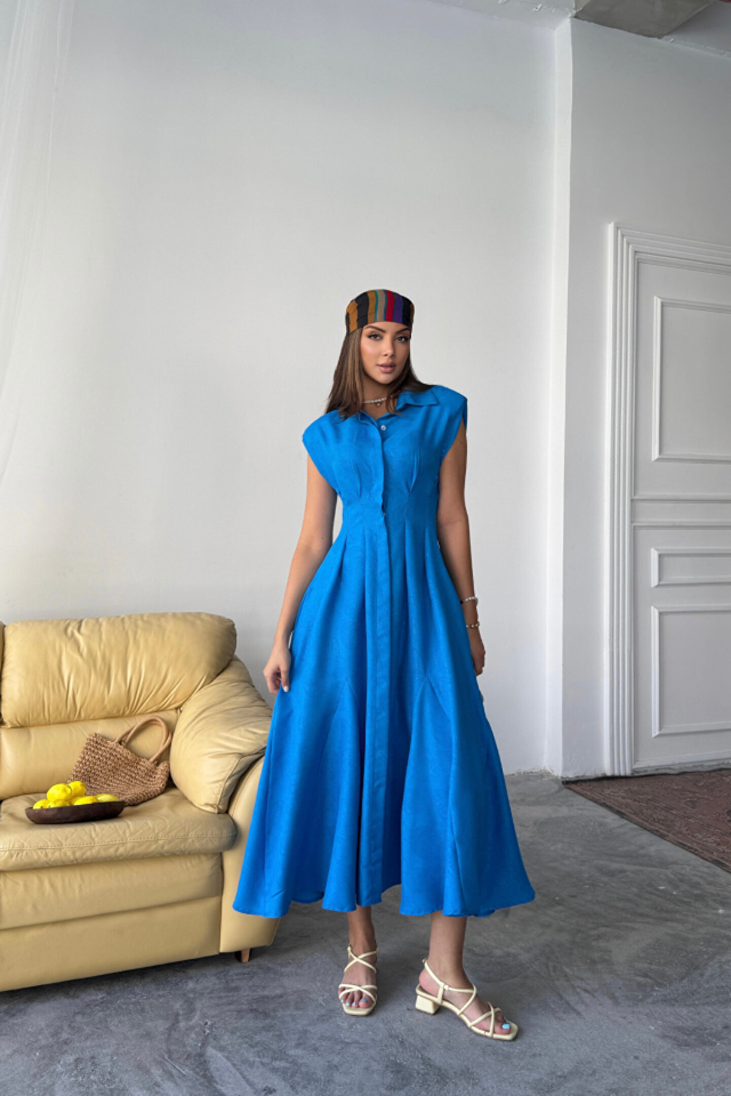 POLEXP JAKARLI KETEN ELBİSE ÖNDEN YIRTMAÇLI CEPLİ - Saks