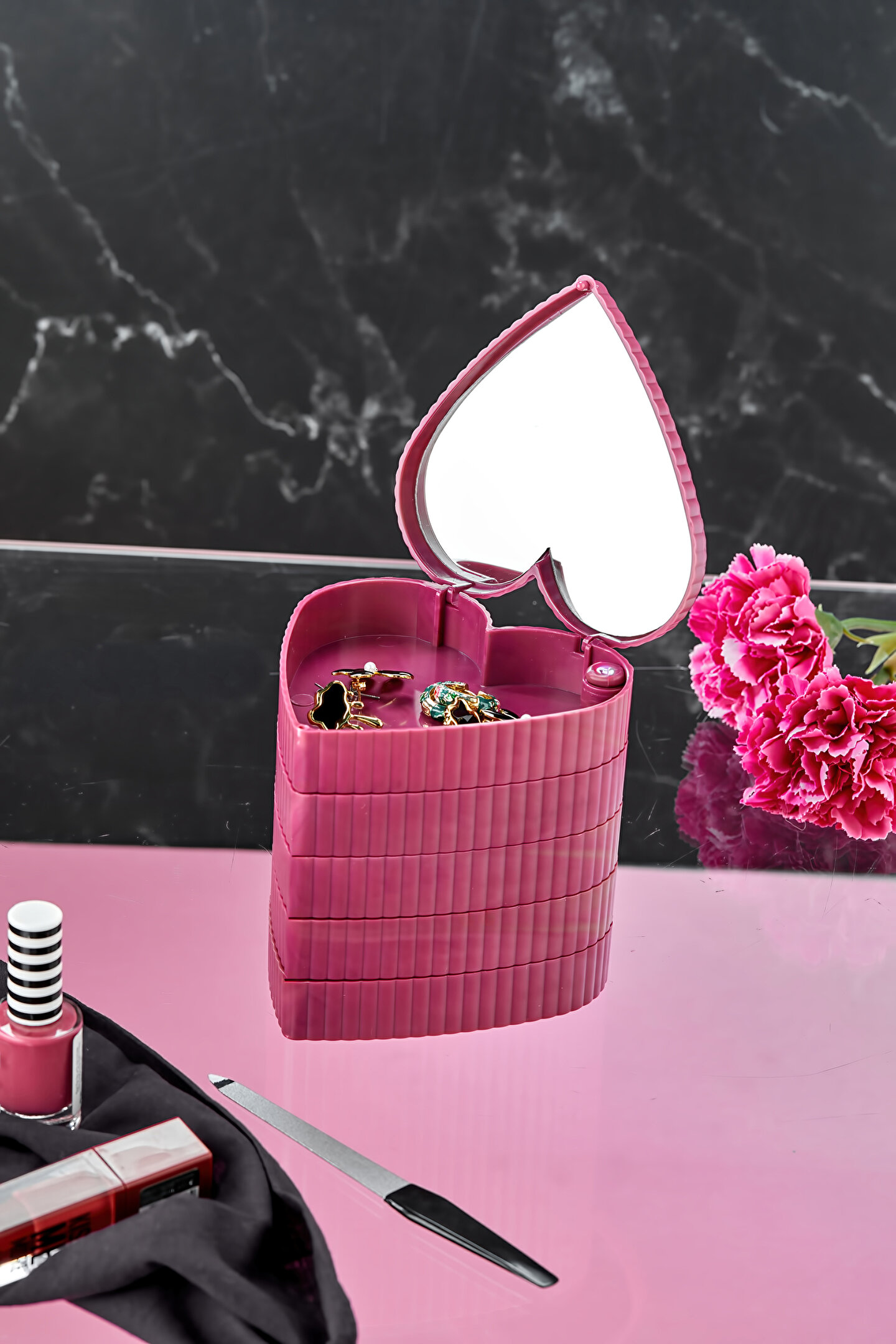 5 Katlı Aynalı Kalp 360 Derece Dönebilen Takı Organizer Kutusu Seyahat tipi taşınabilir aynalı organizer. ; Makyaj Aynalı ; Size pratik ve güvenli bir depolama alanı sunar. ; Boyutu sayesinde hem çok yer kaplamaz hem de şık bir dekorasyon eşyası olarak kullanılabilir. ; 360 derece dönebilen 4 katlı pratik bir üründür. ; Yüzük, küpe, saat, toka vb eşyalarınızı saklamak için ideal bir üründür. ; Takılarınız tozdan kirden uzak durur. ; Takılarını daha iyi muhafaza etmenizi sağlar. ; Ürün Ölçüleri: ; 11cm x 11cm x 12,4cm ; ok