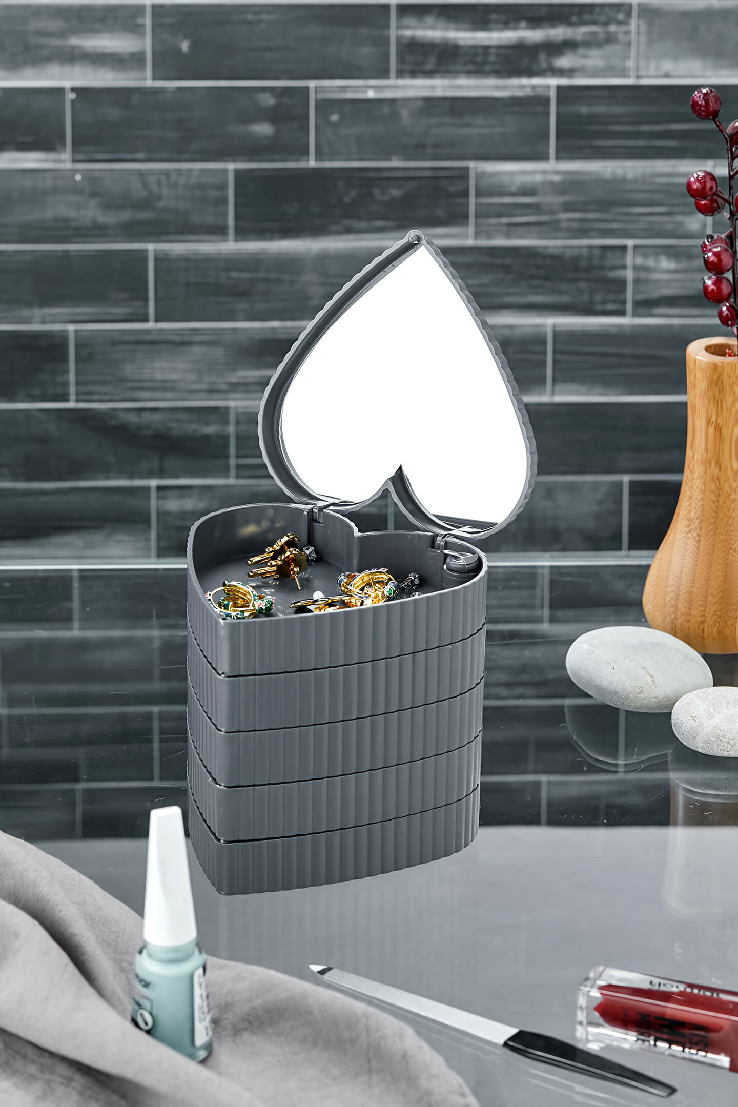 Mücevher, takı ve aksesuarlarınız için ideal saklama çözümü sunar; düzenli ve şık bir görünüm sağlar; Akrilik materyali sayesinde dayanıklı ve uzun ömürlü kullanım vaat eder; Tek parça halinde gelen bu organizer, kolayca monte edilebilir ve pratik bir şekilde kullanılabilir;