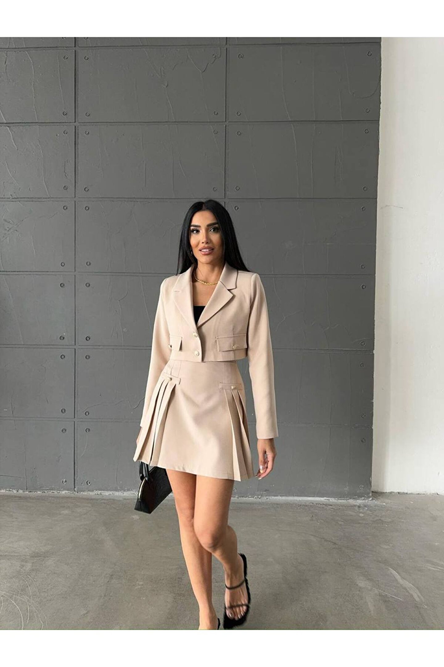 Modern ve şık tasarımıyla dikkat çeken Atlas kumaştan üretilmiş crop ceket, pileli etekle tamamlanan bu takım, genç ve dinamik tarzınızı yansıtmanız için idealdir.; Slim kalıp sayesinde vücut hatlarınıza mükemmel uyum sağlayarak feminen siluetinizi ön plana çıkarır.; Crop ceketin kısa boy tasarımı, modern ve trend bir görünüm kazandırırken, pileli eteğin hareketliliğiyle kombinlerinizde canlı bir etki yaratır.; Dokuma kumaşı sayesinde dayanıklı ve kaliteli malzeme kullanımı, uzun süreli kullanım için idealdir.; Her yaş grubuna hitap eden geniş yaş aralığına sahip olan bu takım, gençlerin enerjik ruhunu yansıtırken aynı zamanda tüm yaş gruplarına da uyum sağlayarak geniş bir kullanıcı kitlesi sunar.;