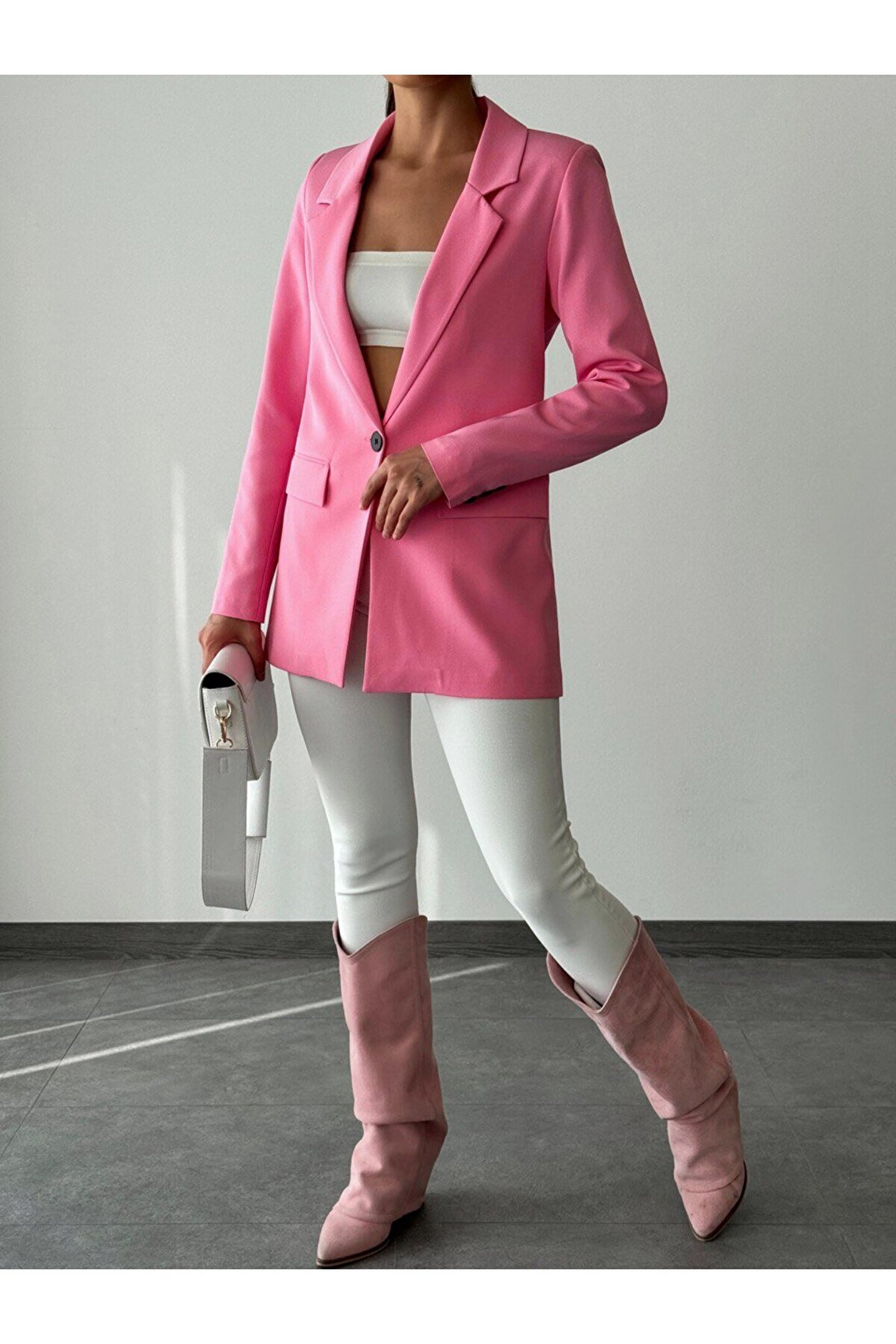popibutik Atlas Kumaş Tek Düğmeli Pembe Blazer ceket