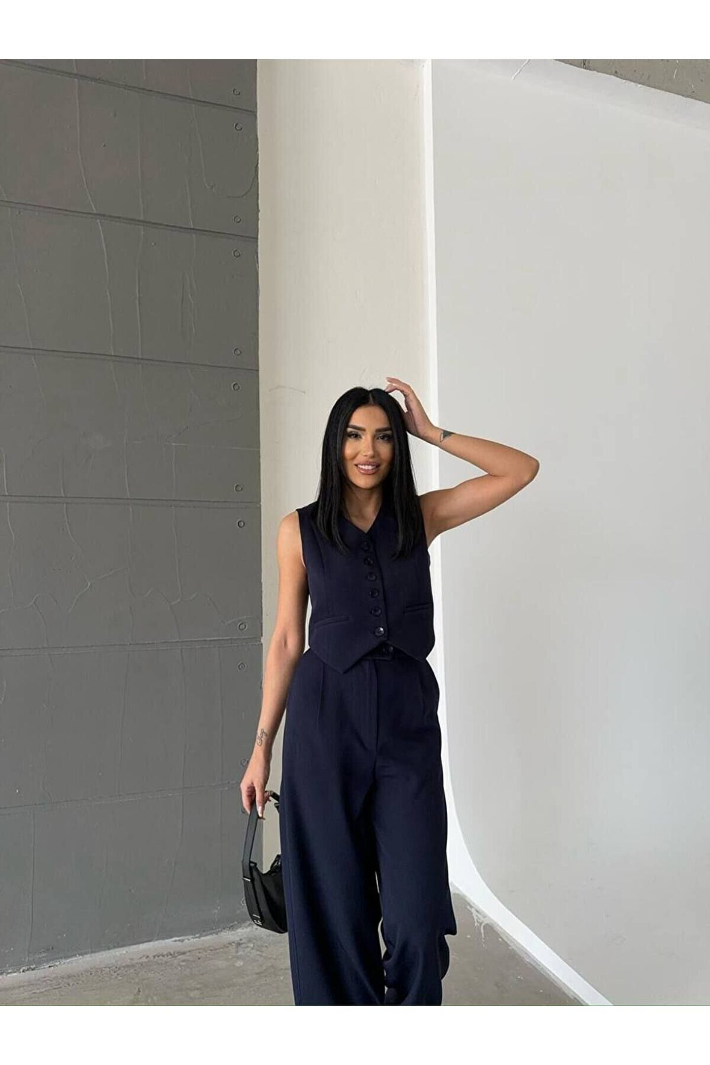 popibutik Atlas Kumaş Yüksel Bel İspanyol Paça Pantolon Yelek siyah Takım