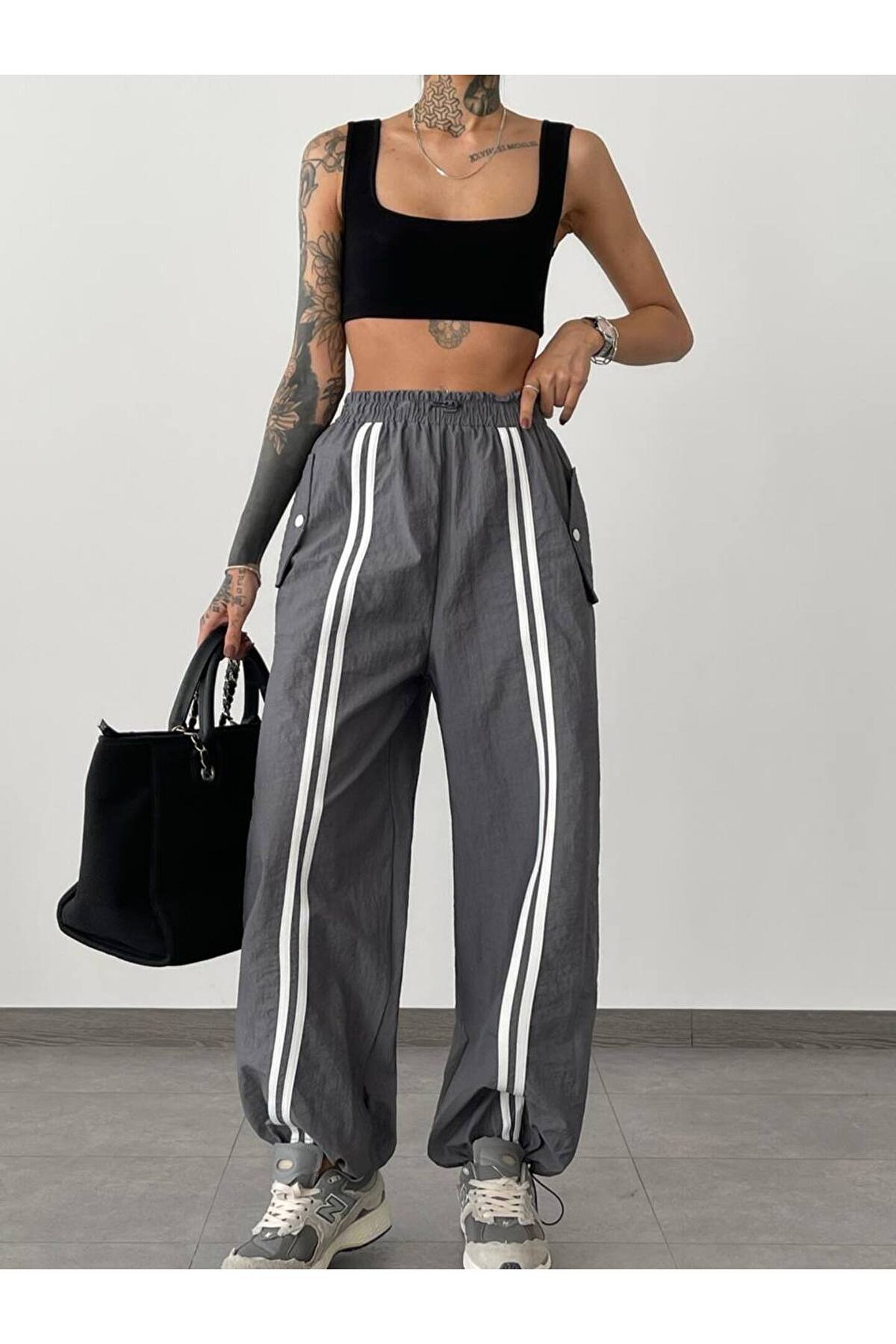 popibutik Cep Detaylı Lastikli Gri Paraşüt Pantolon