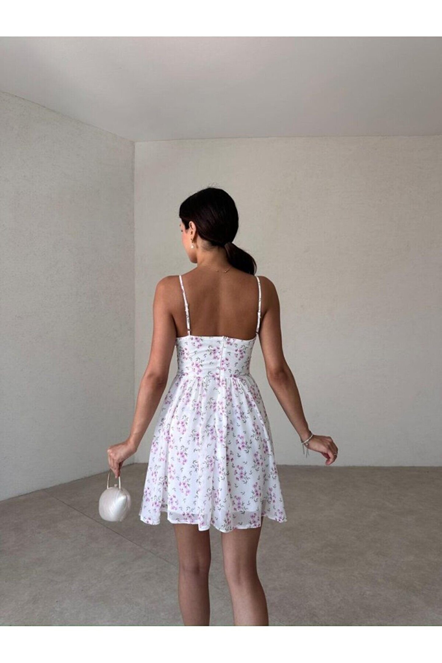 popibutik Çiçek Desenli Mini Beyaz Elbise