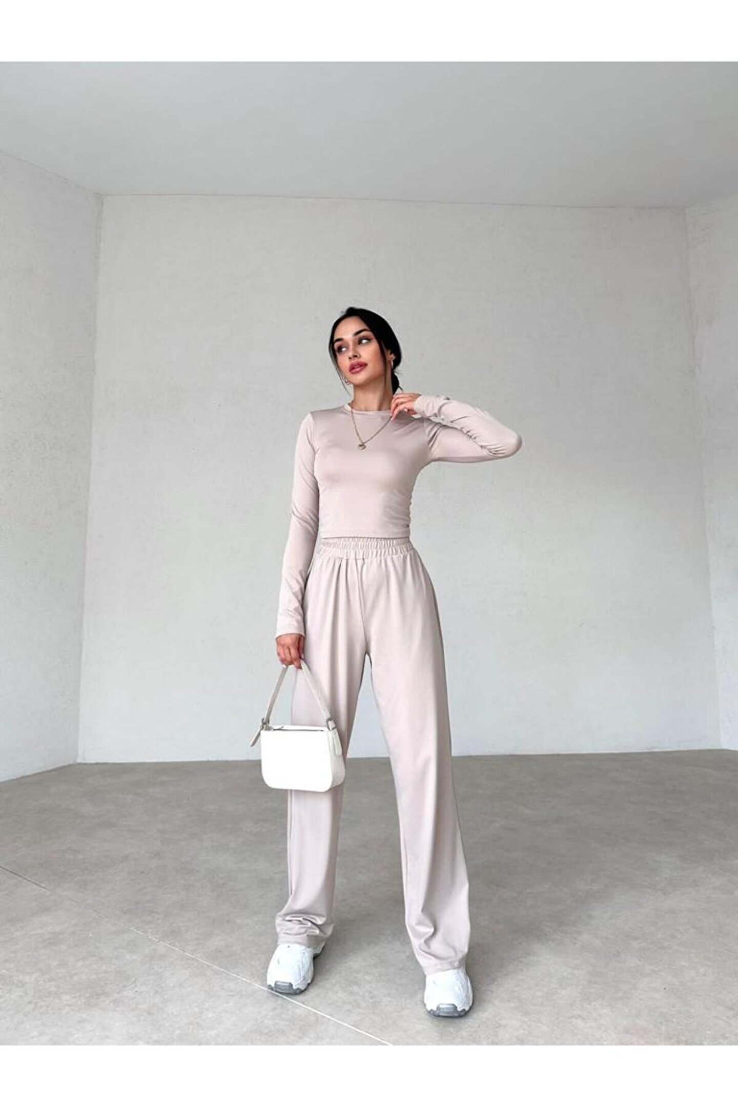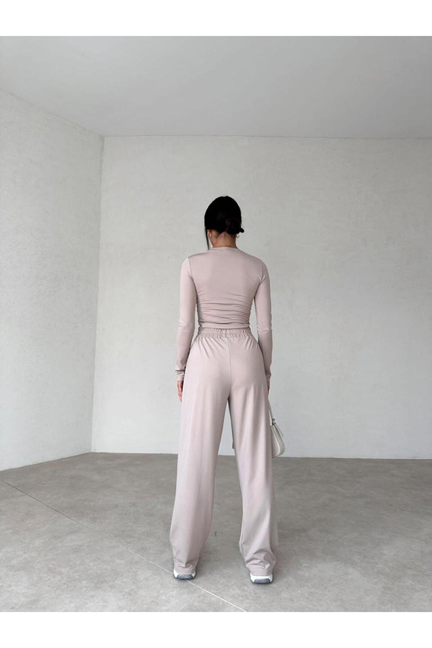 Gençlerin enerjisine ve tarzına uygun, her yaş grubuna hitap eden dalgıç kumaştan üretilmiş ikili takım; Sade ve şık tasarımıyla dikkat çeken düz desenli, zamansız bir görünüm sunar; Slim kalıp sayesinde modern ve şık bir siluet oluştururken, yüksek bel tasarımı vücut hatlarını zarifçe sarar; Uzun kollu üst parça ile mevsim geçişlerinde ideal konfor ve şıklığı bir arada sunar; Regular boy kesimiyle rahat hareket etme özgürlüğü sağlar ve günlük kullanım için idealdir; Örme dokuma tipi, esnek yapısıyla gün boyu rahatlık ve konfor sunarken, dalgıç kumaşın dayanıklılığı ile uzun süreli kullanım vaat eder;