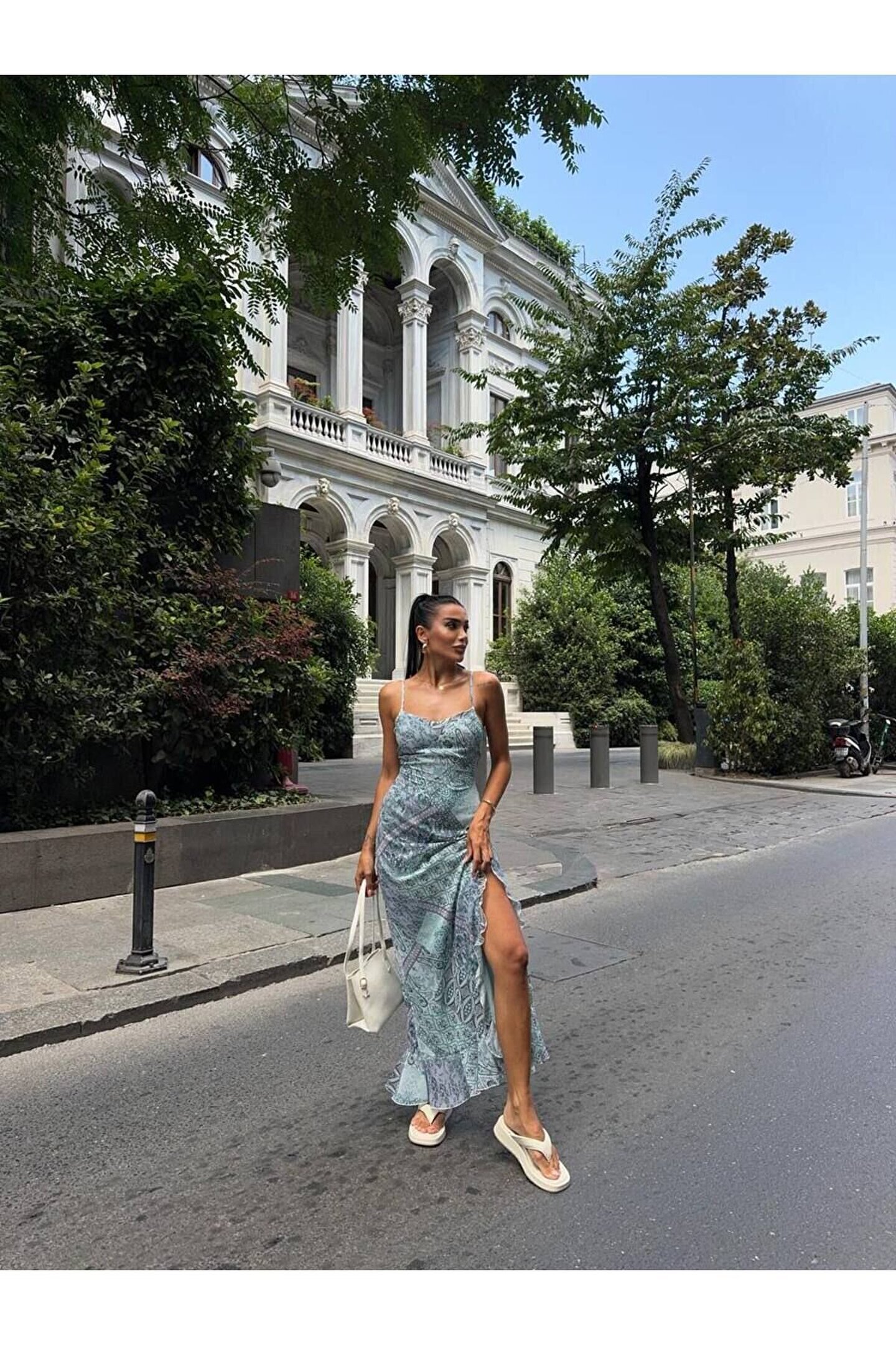 popibutik Desenli İnce Askılı Mavi Uzun Şifon Elbise
