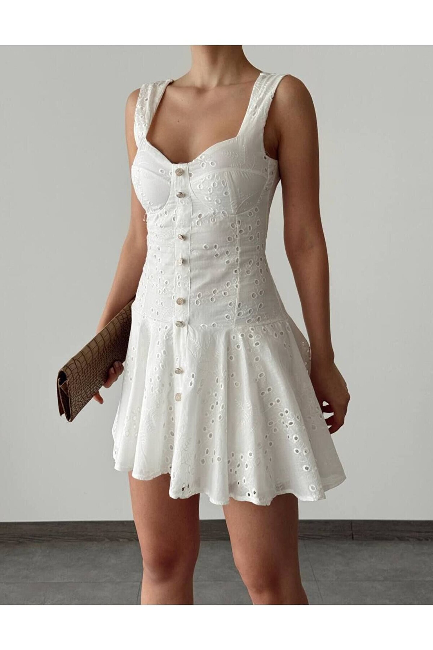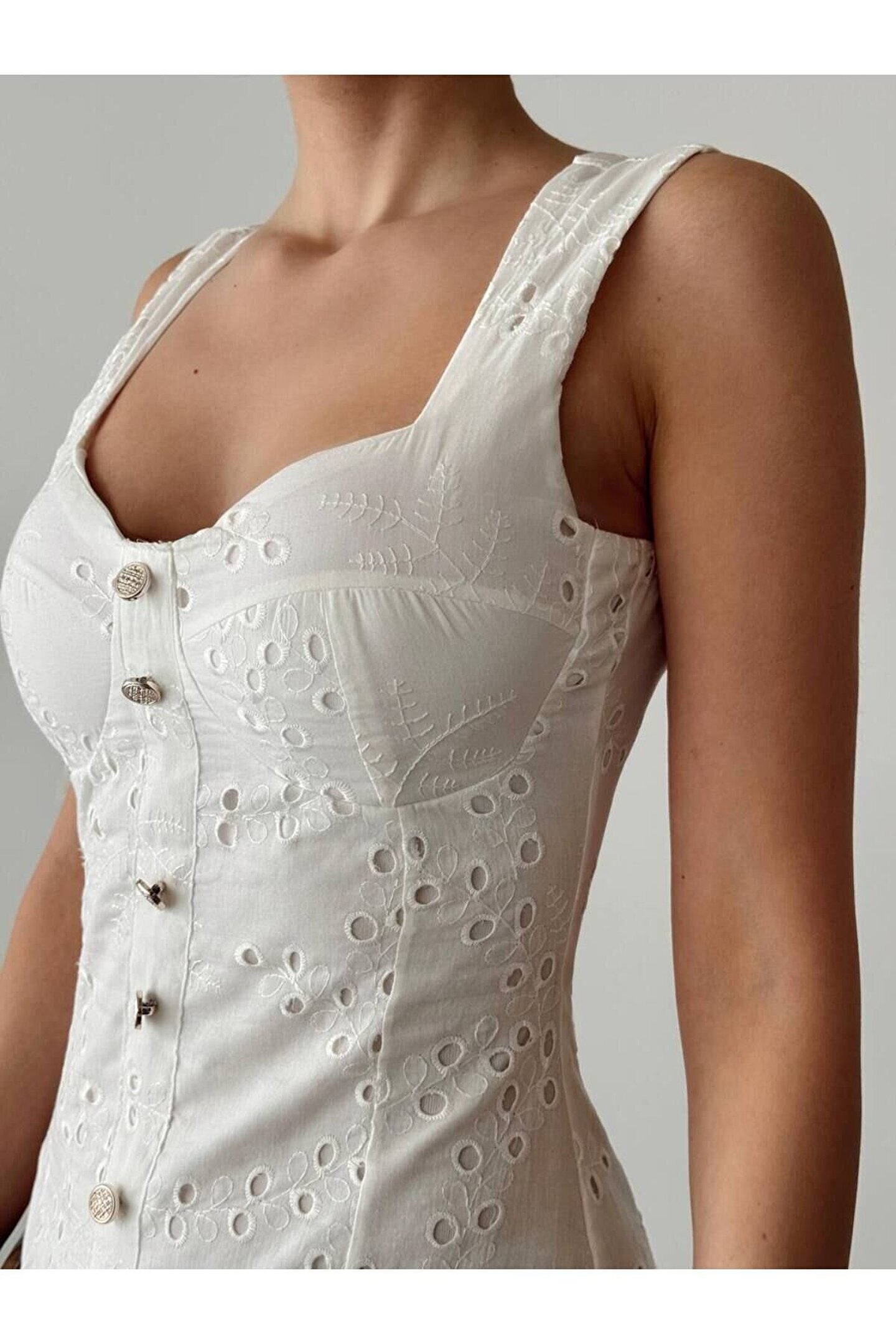 popibutik Düğme Detaylı Askılı Brode Kumaş Mini Beyaz Elbise