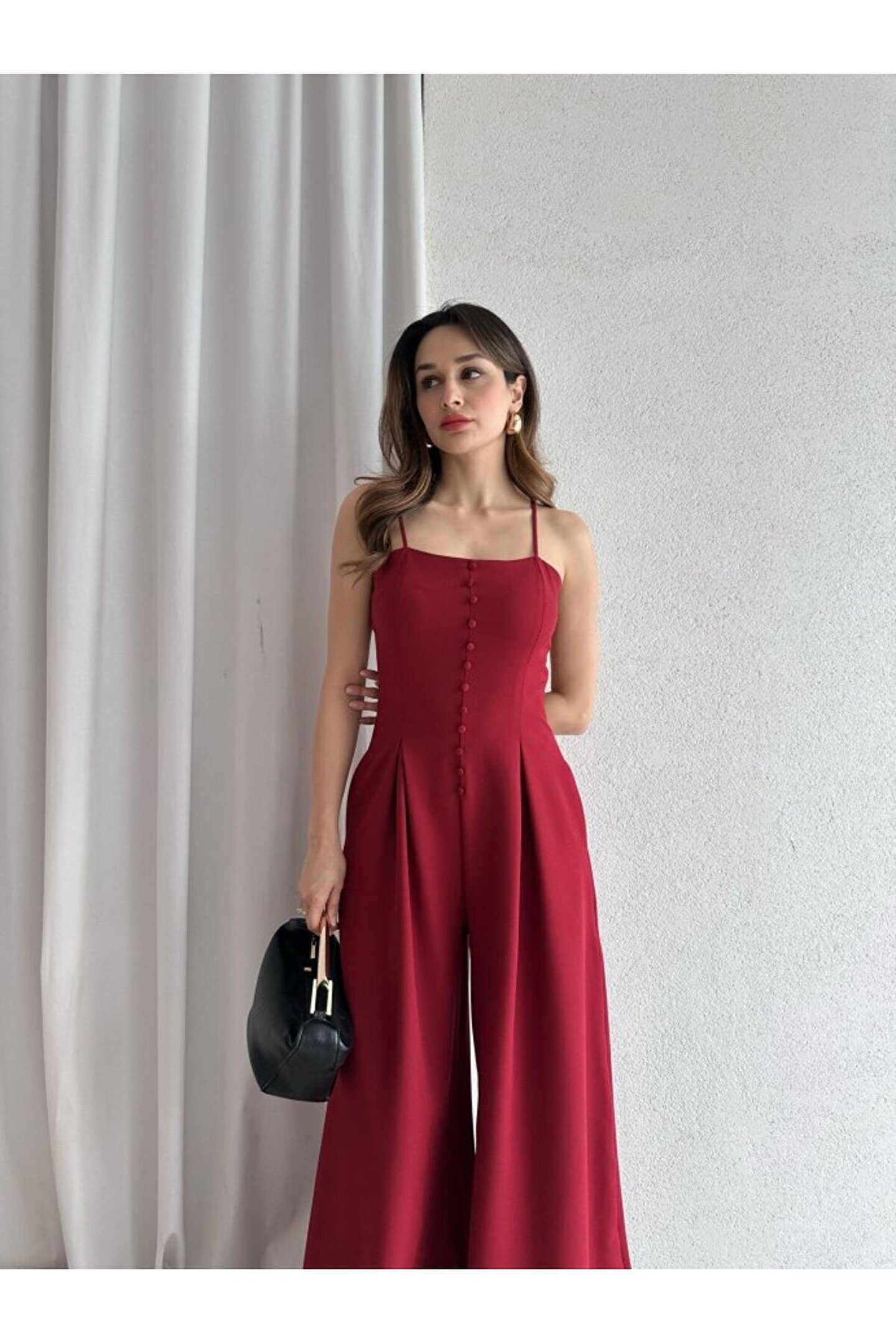 popibutik Kadın Askılı Kare Yaka Düğme Detaylı Tulum