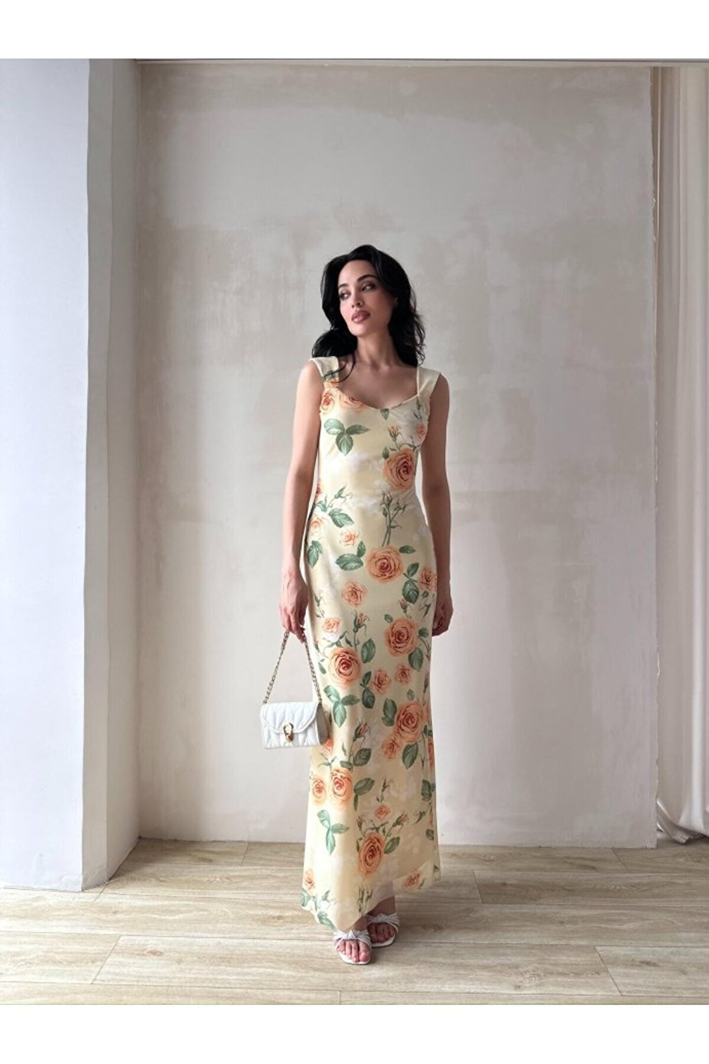 popibutik Kadın Astarlı Çiçek Desenli Uzun Tül Elbise