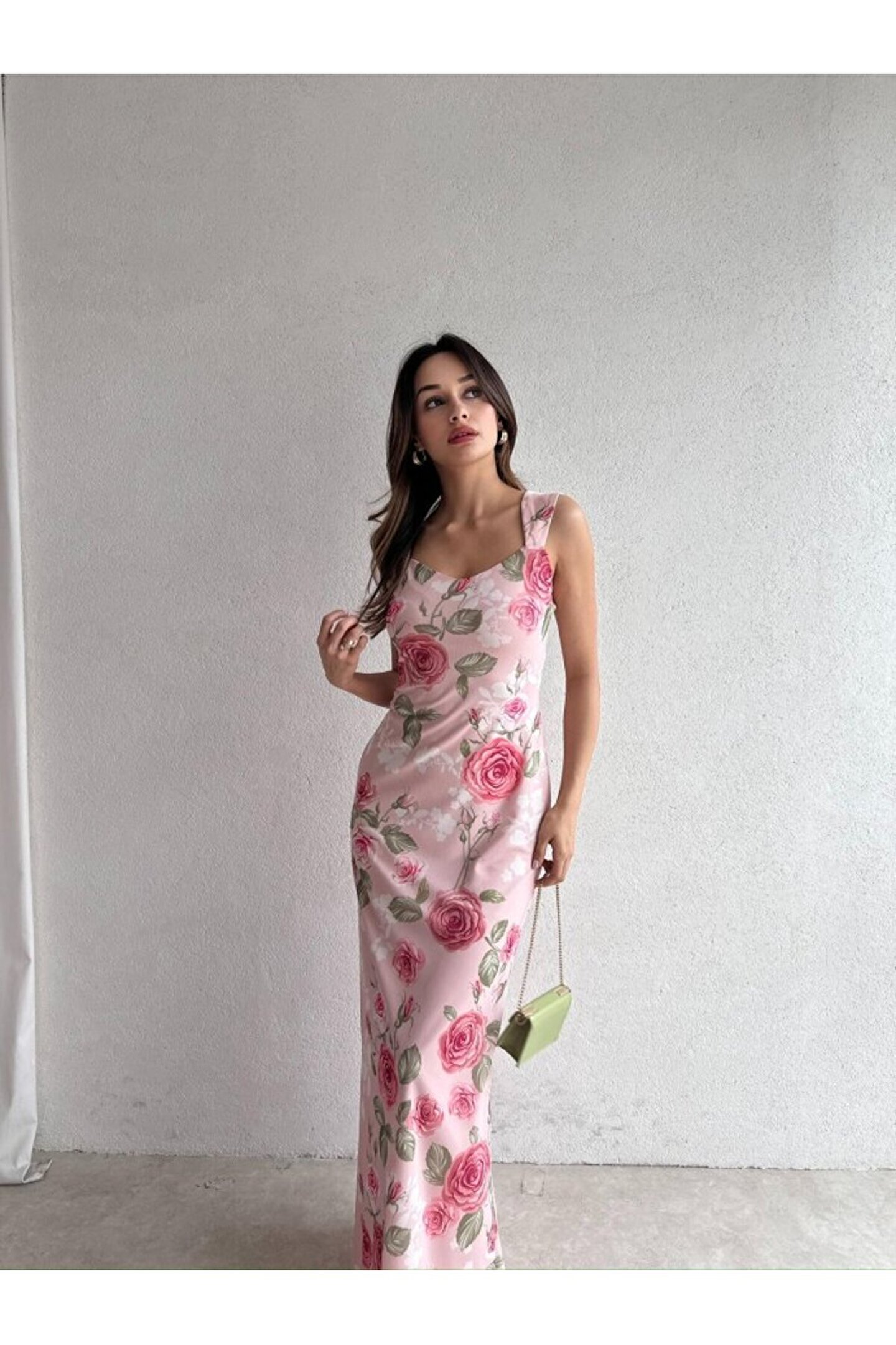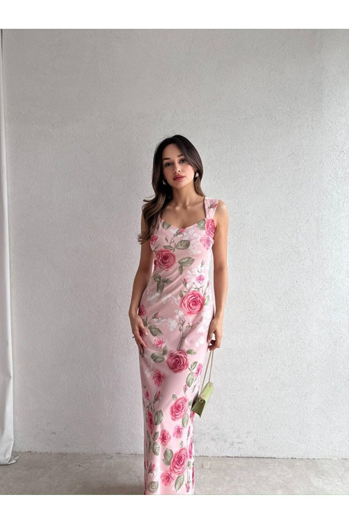 popibutik Kadın Astarlı Çiçek Desenli Uzun Tül Elbise