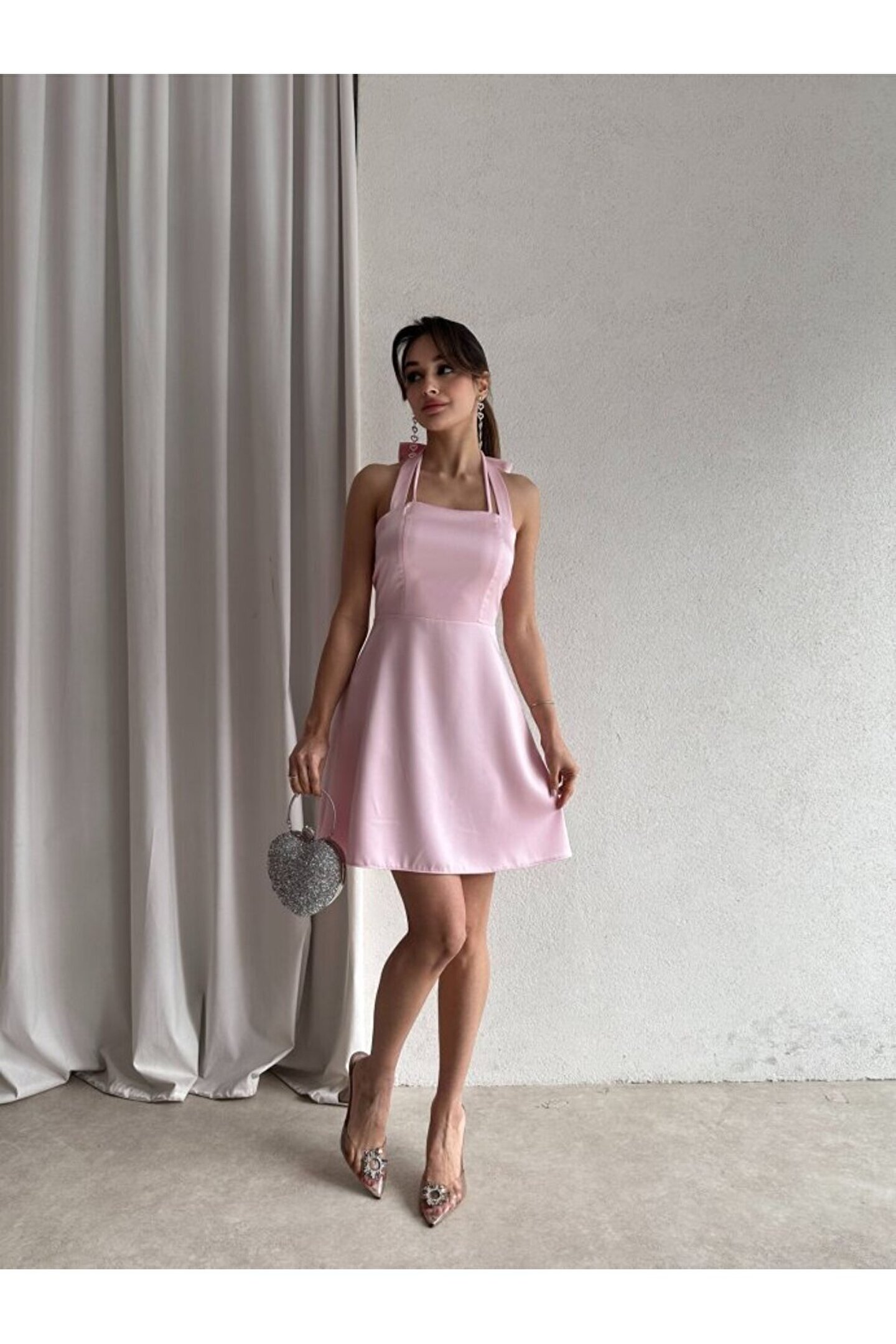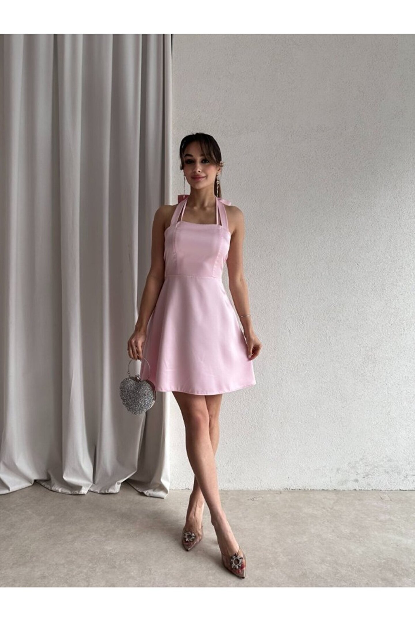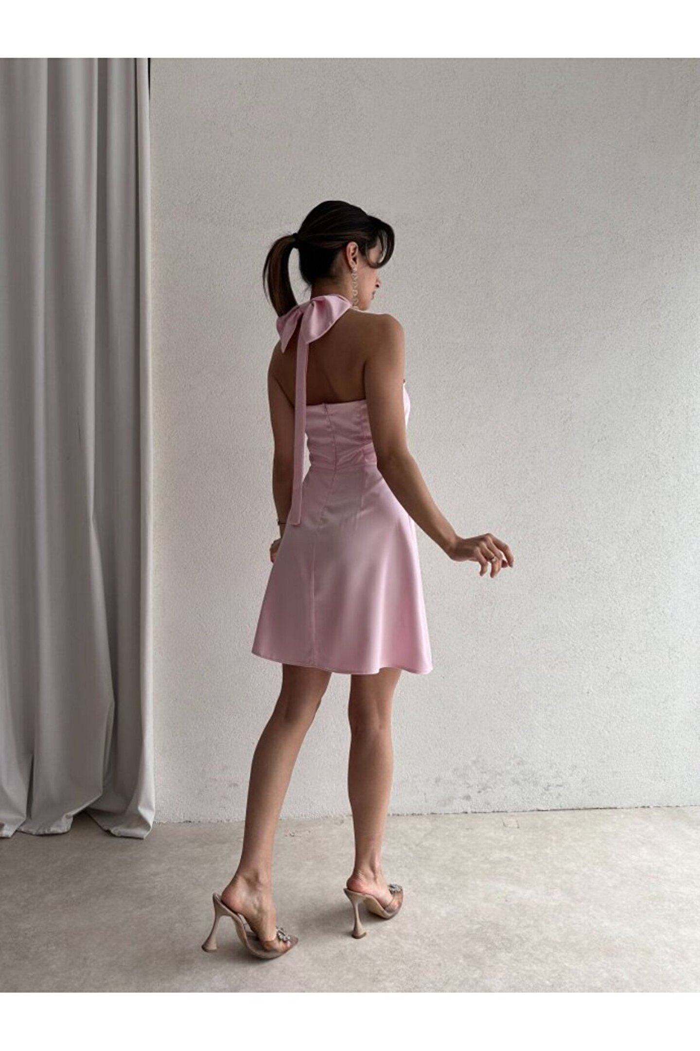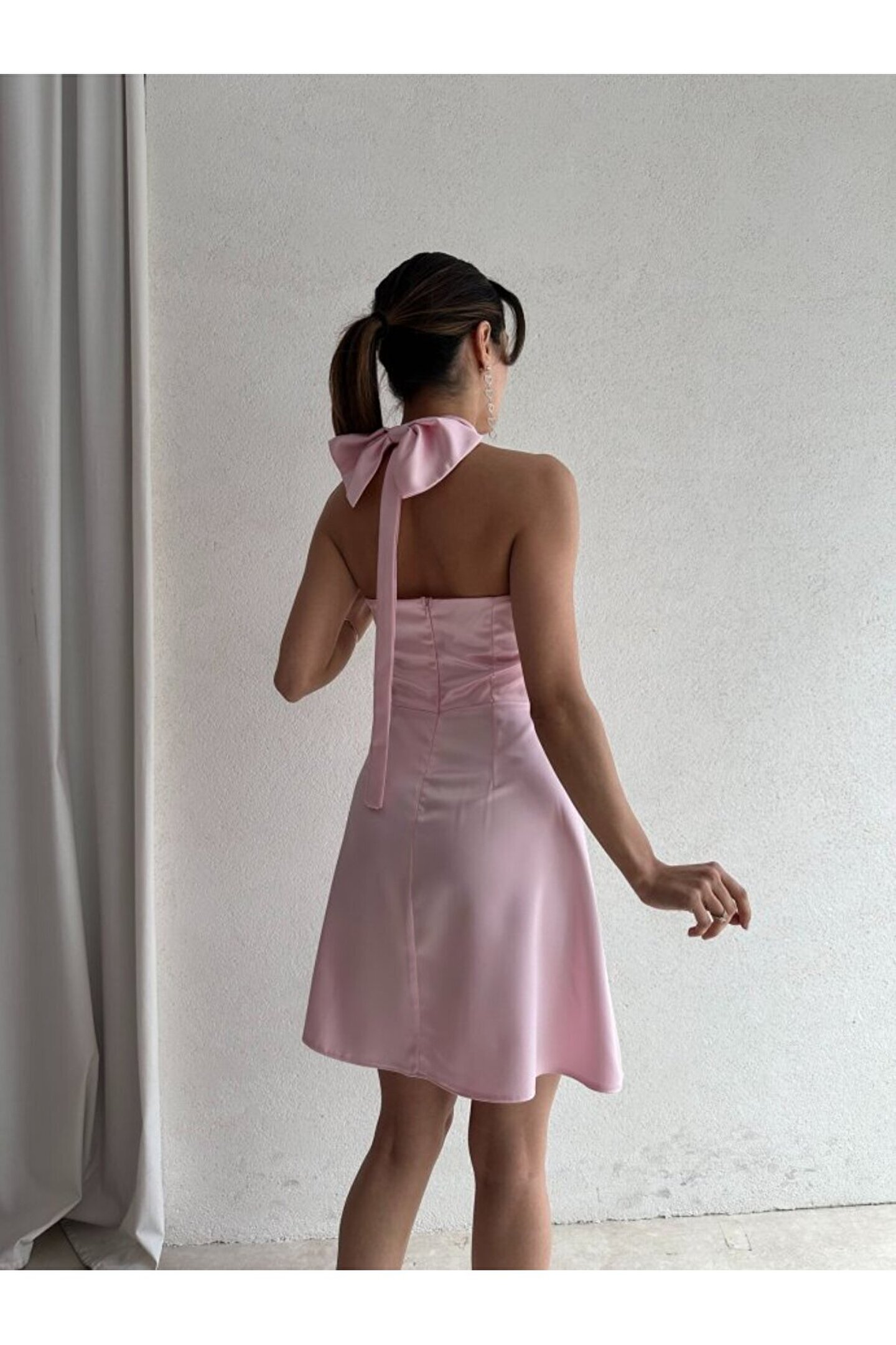 popibutik Kadın Boyundan Bağlamalı Kurdela Detaylı Mini Saten Elbise