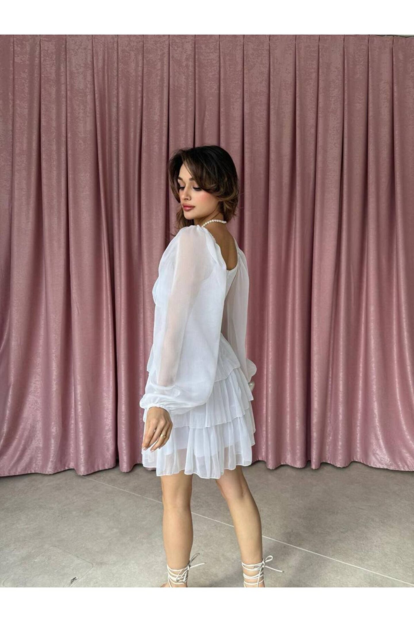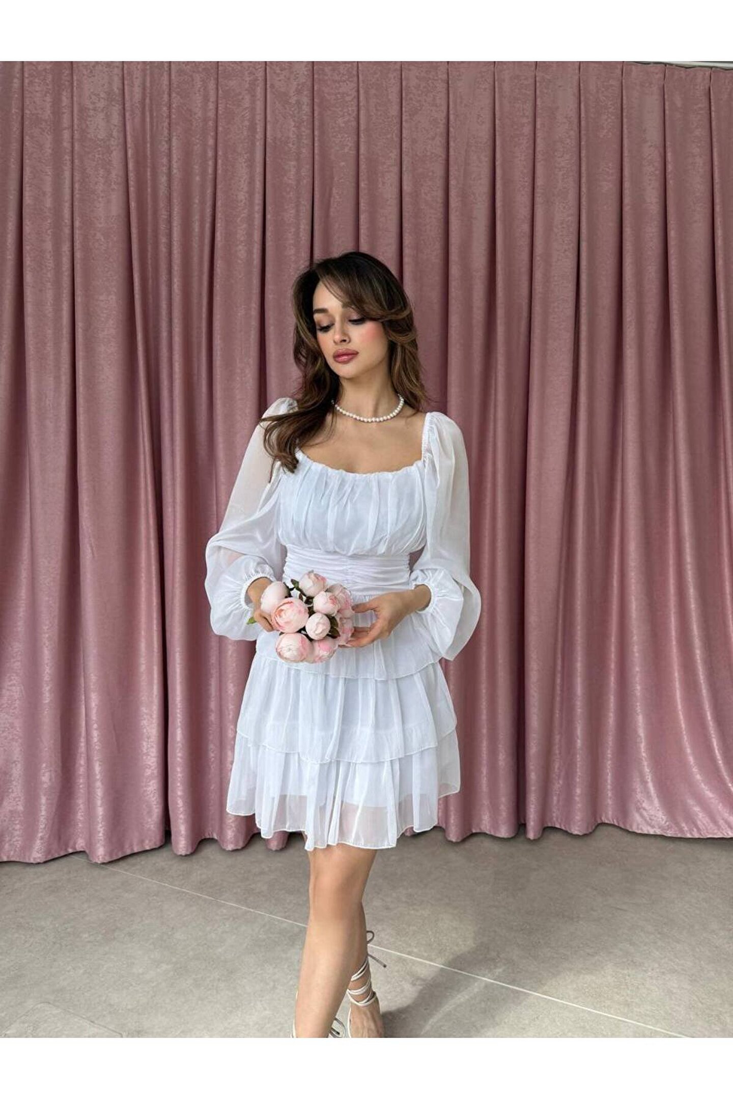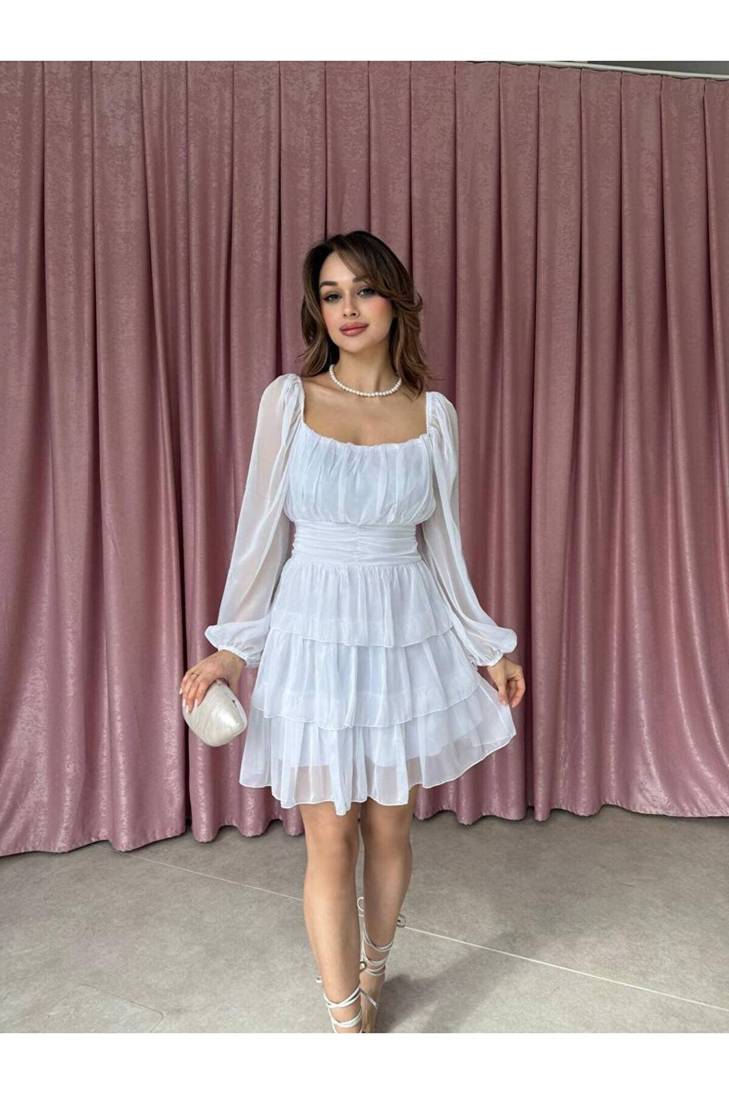 popibutik Kadın Kare Yaka Kat Etekli Transparan Kollu Mini Şifon Elbise