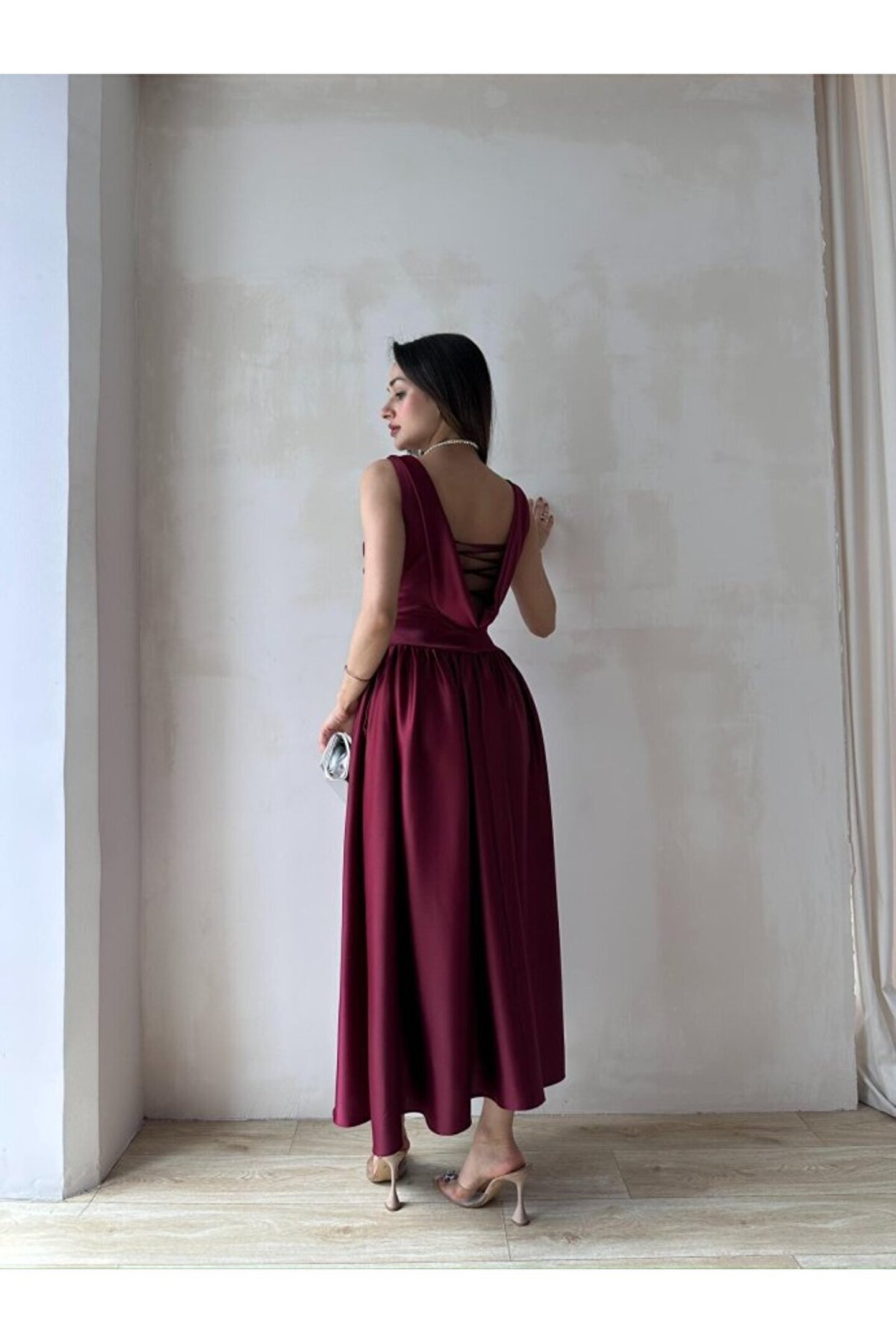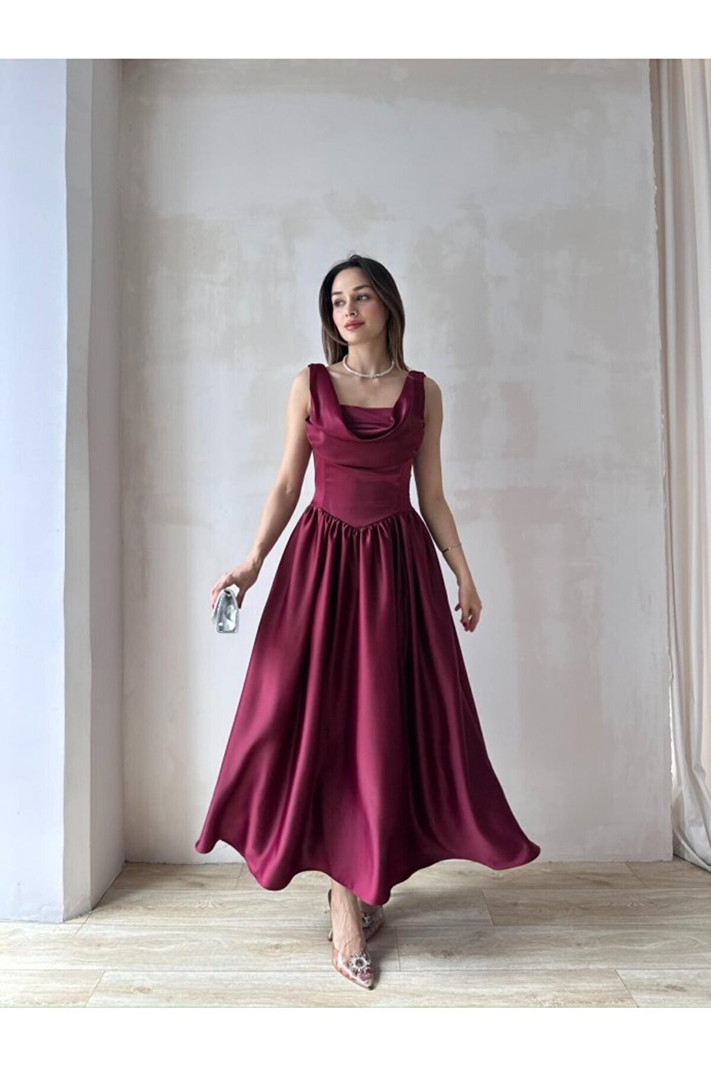 popibutik Kadın Sırt Detaylı Korse Formlu Pileli Uzun Saten Elbise