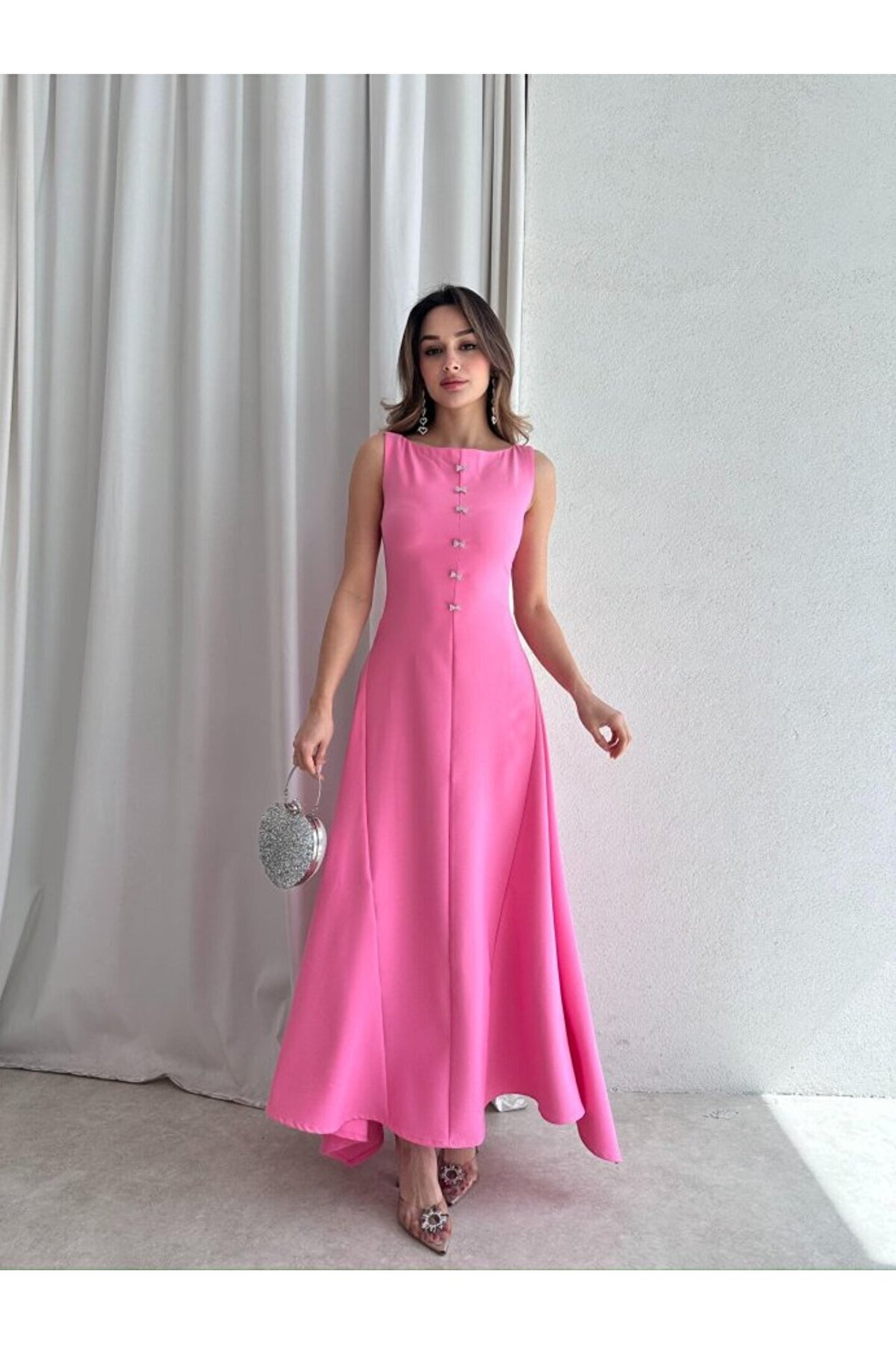 popibutik Kadın Taş Fiyonk Detaylı Uzun Elbise
