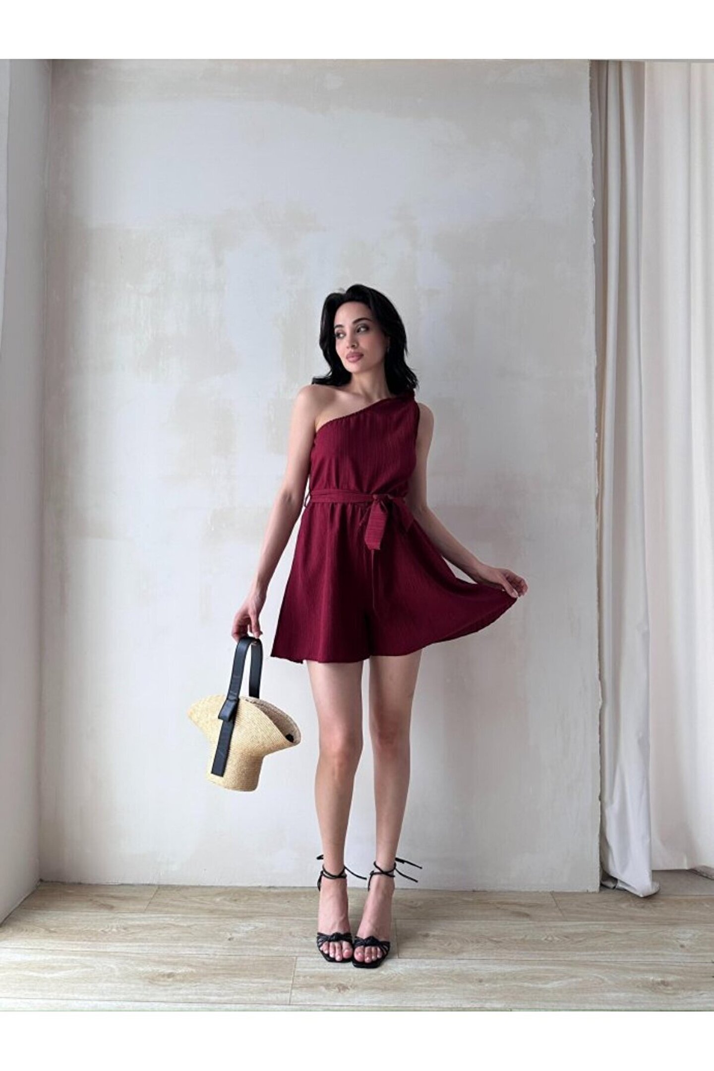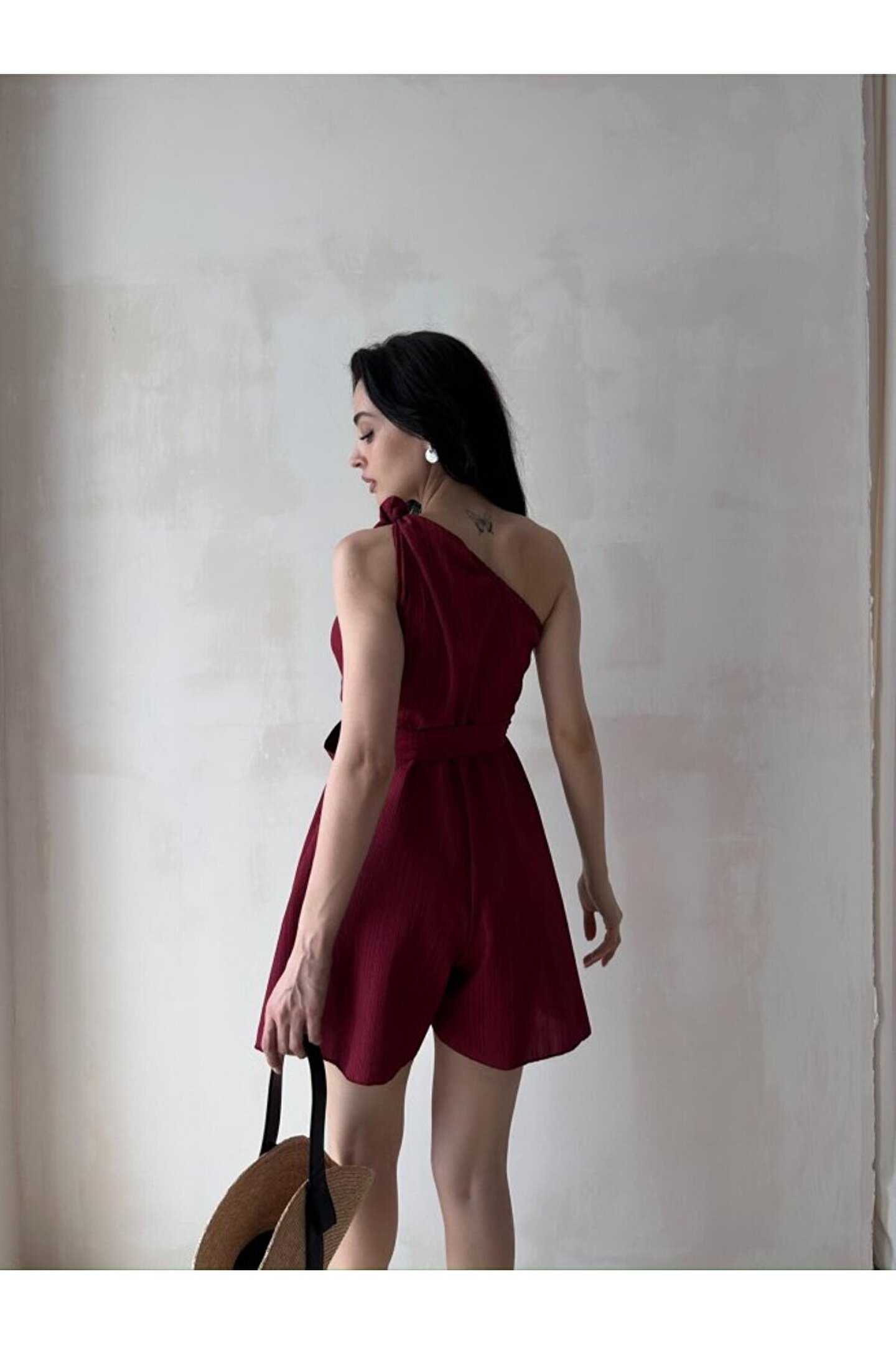 popibutik Kadın Tek Omuz Kuşaklı Mini Tulum