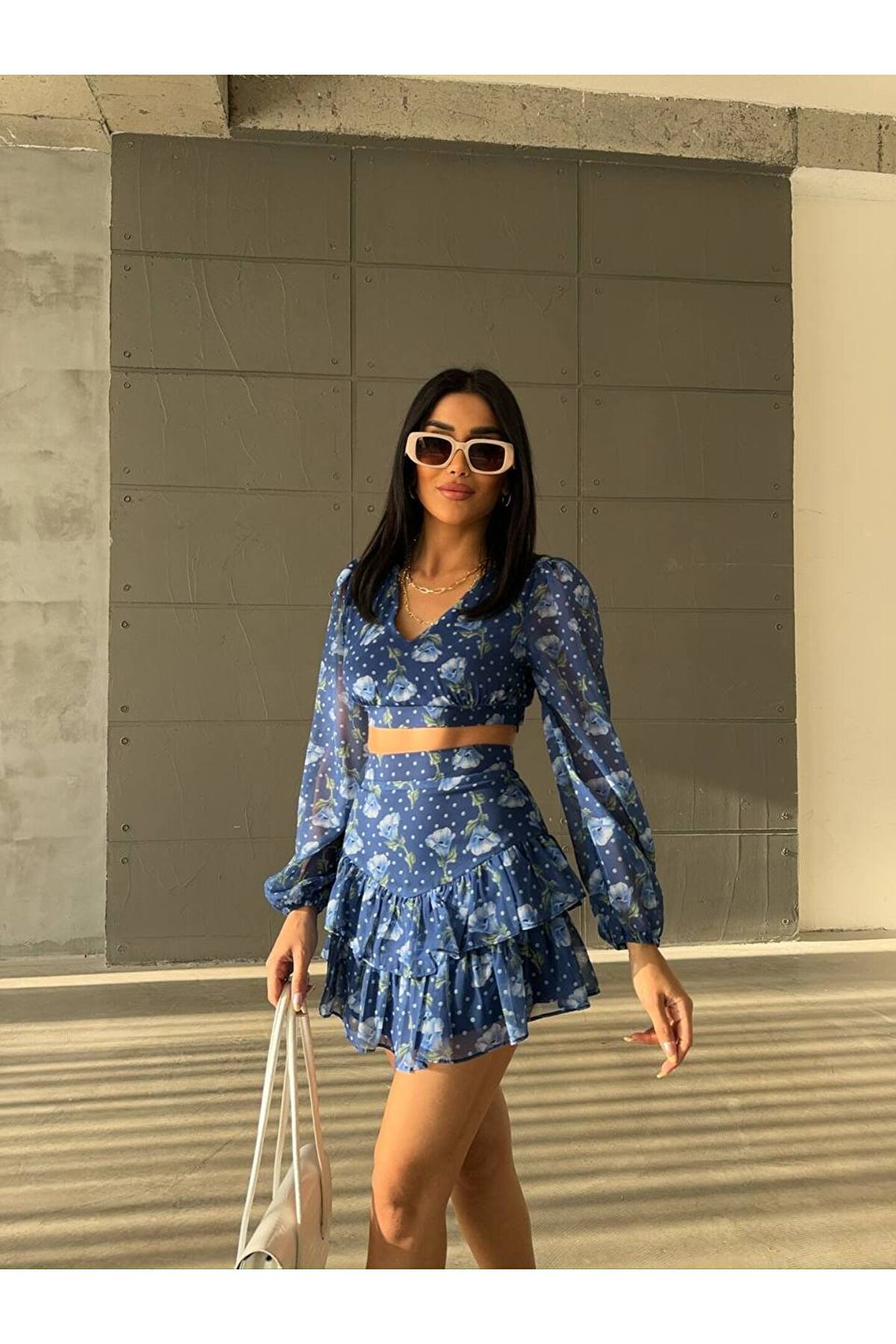 popibutik Kat Etek Gögüs Dekolteli Crop Şifon Kumaş Mavi Takım