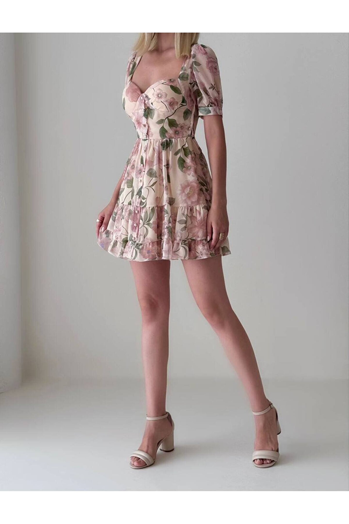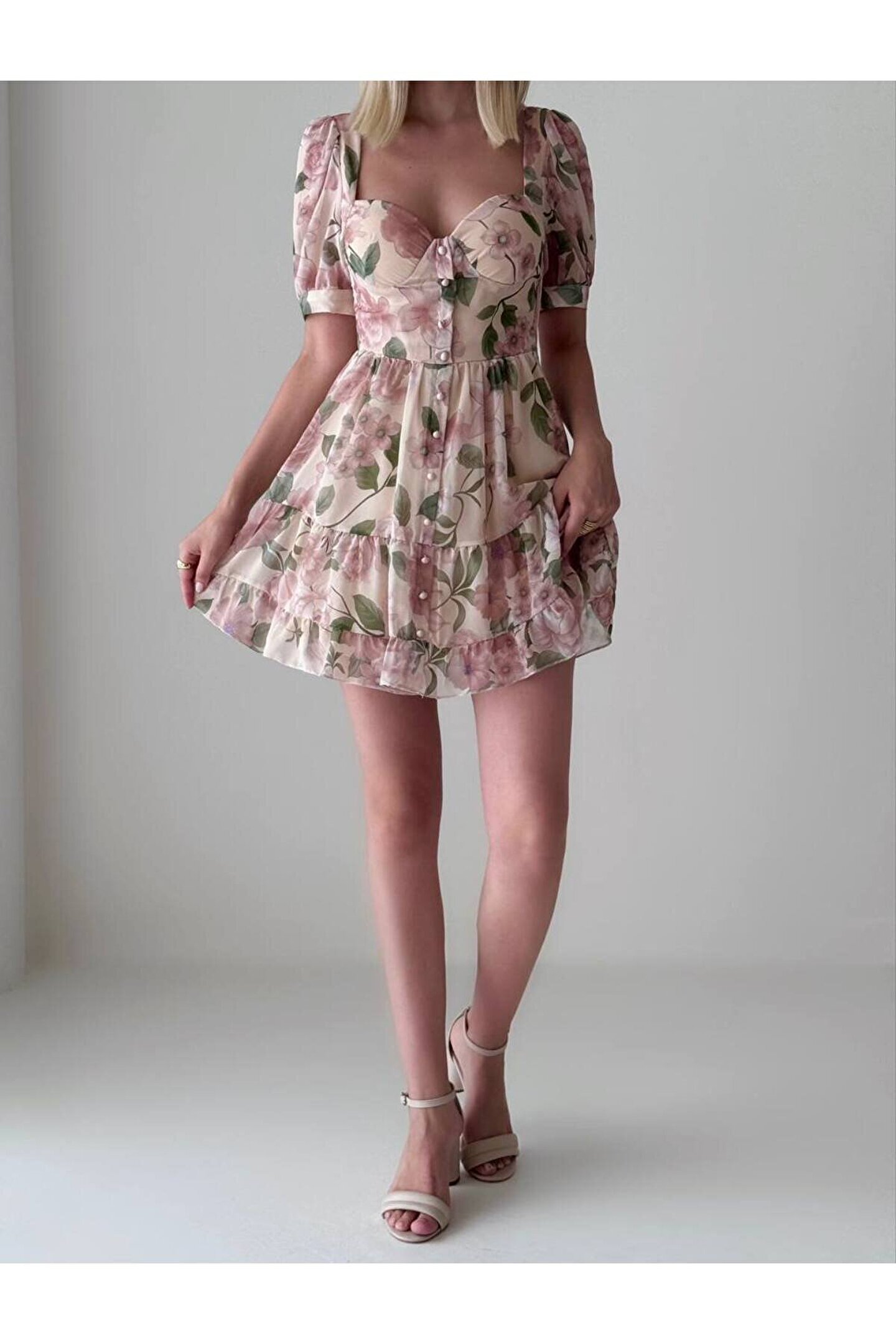 - Hafif ve zarif şifon kumaşı ile yaz aylarının vazgeçilmezi, mini boy elbise; - Belinizi saran bele oturan kalıbı sayesinde şık ve feminen bir siluet sunar; - Kısa kollu tasarımı ile rahat hareket etme özgürlüğü sağlar ve sıcak havalarda serinlik hissi verir; - Düğme detayları ile modern ve şık bir görünüm kazandırırken, genç yaş grubuna hitap eden dinamik bir stil oluşturur; - Şifon materyali sayesinde hafif ve nefes alabilen yapısıyla gün boyu konforlu bir kullanım sunar;