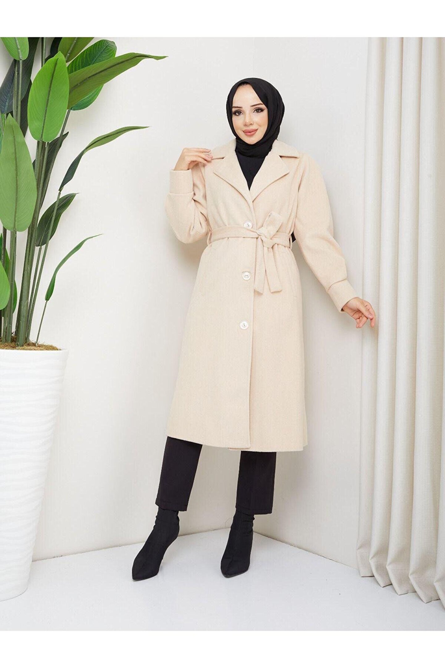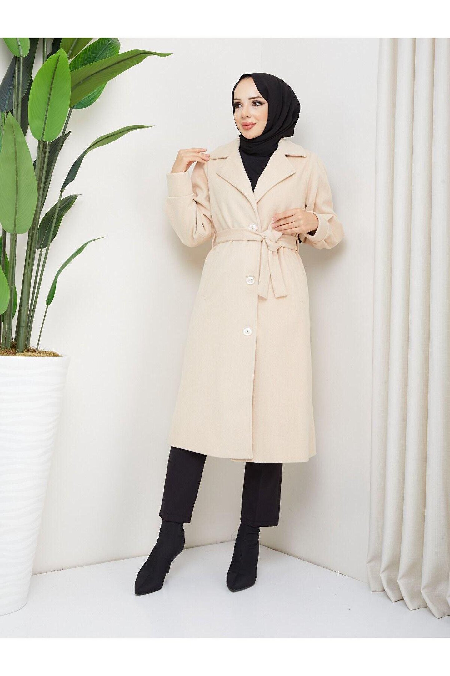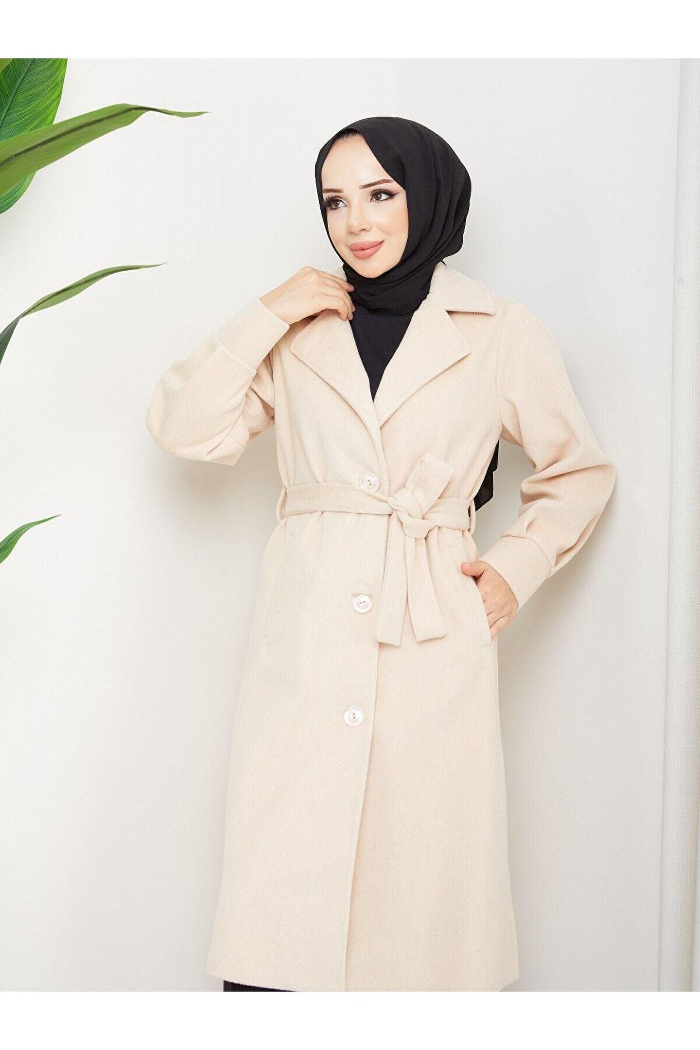 • Kol Detaylı Kaşe Kumaş Kuşaklı Düğmeli Midi Boy Kaban