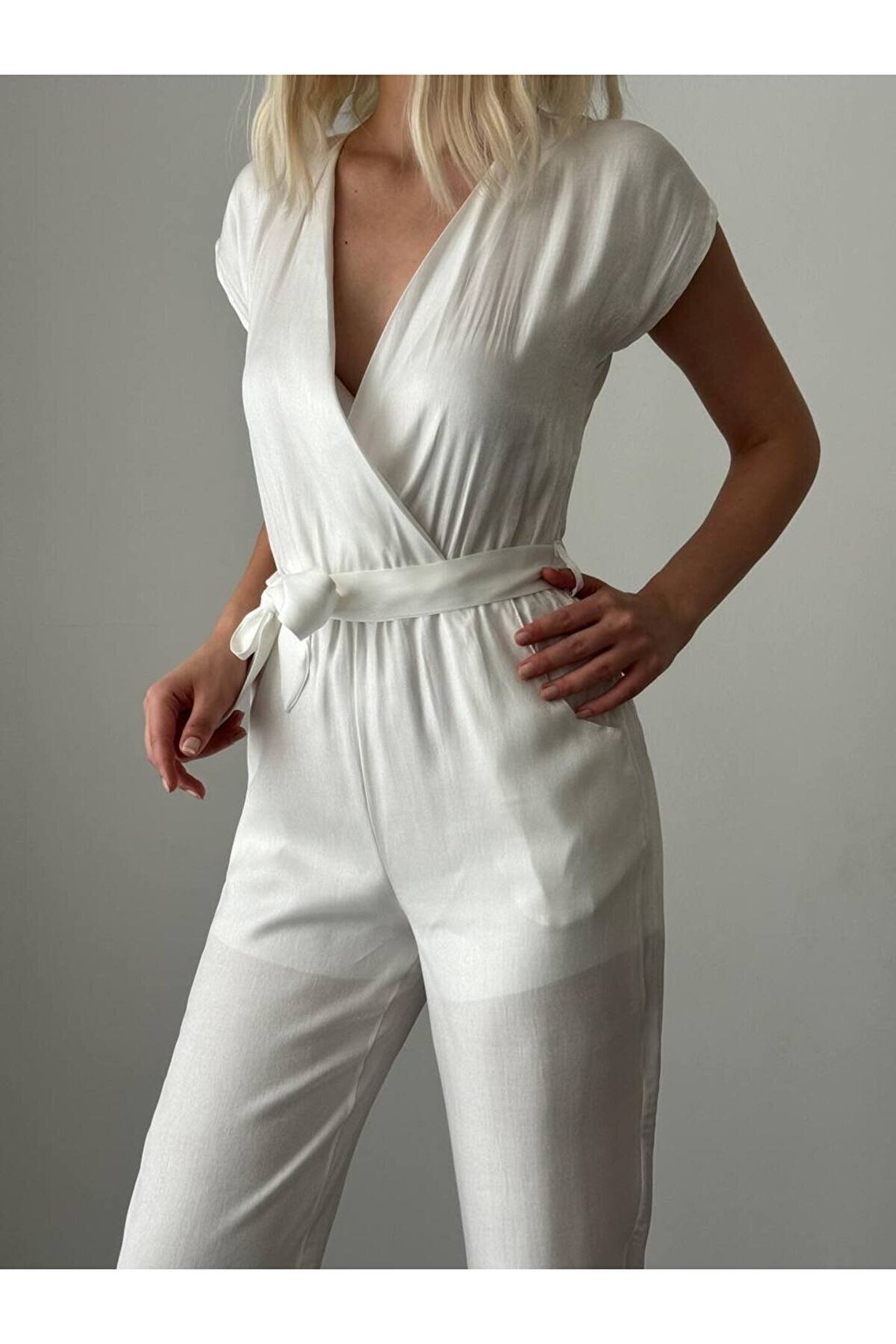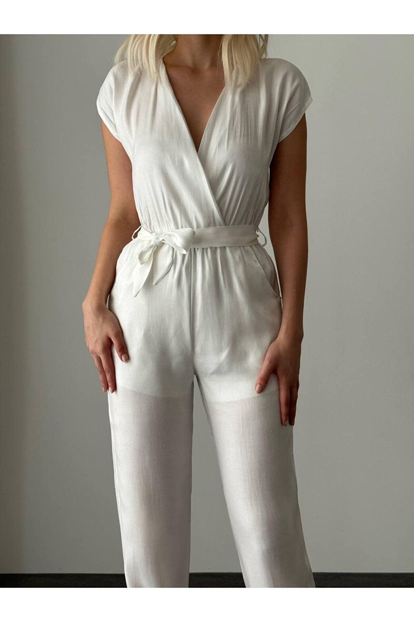 popibutik Lucas Kumaş V Yaka Sıfır Kol Beyaz Tulum
