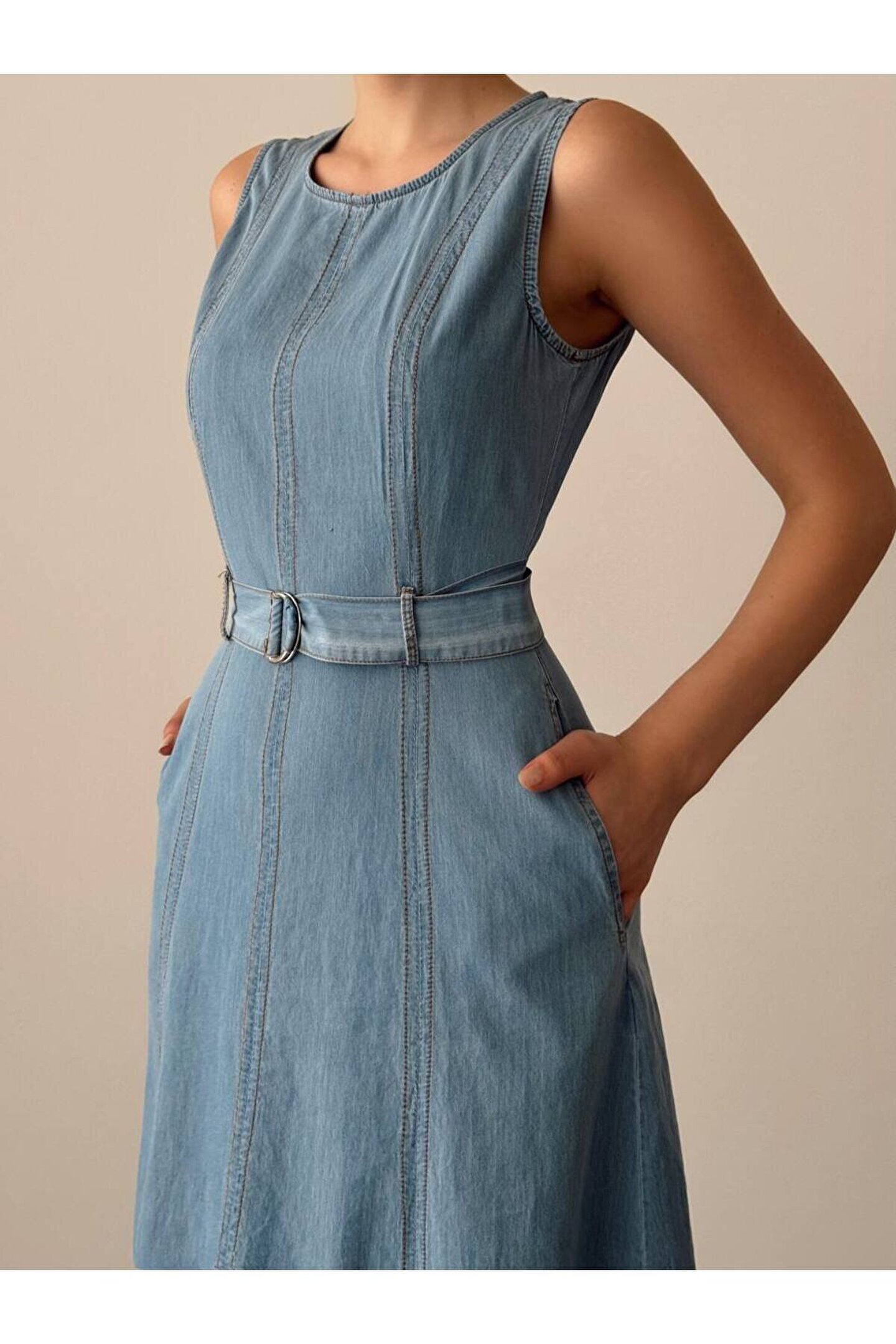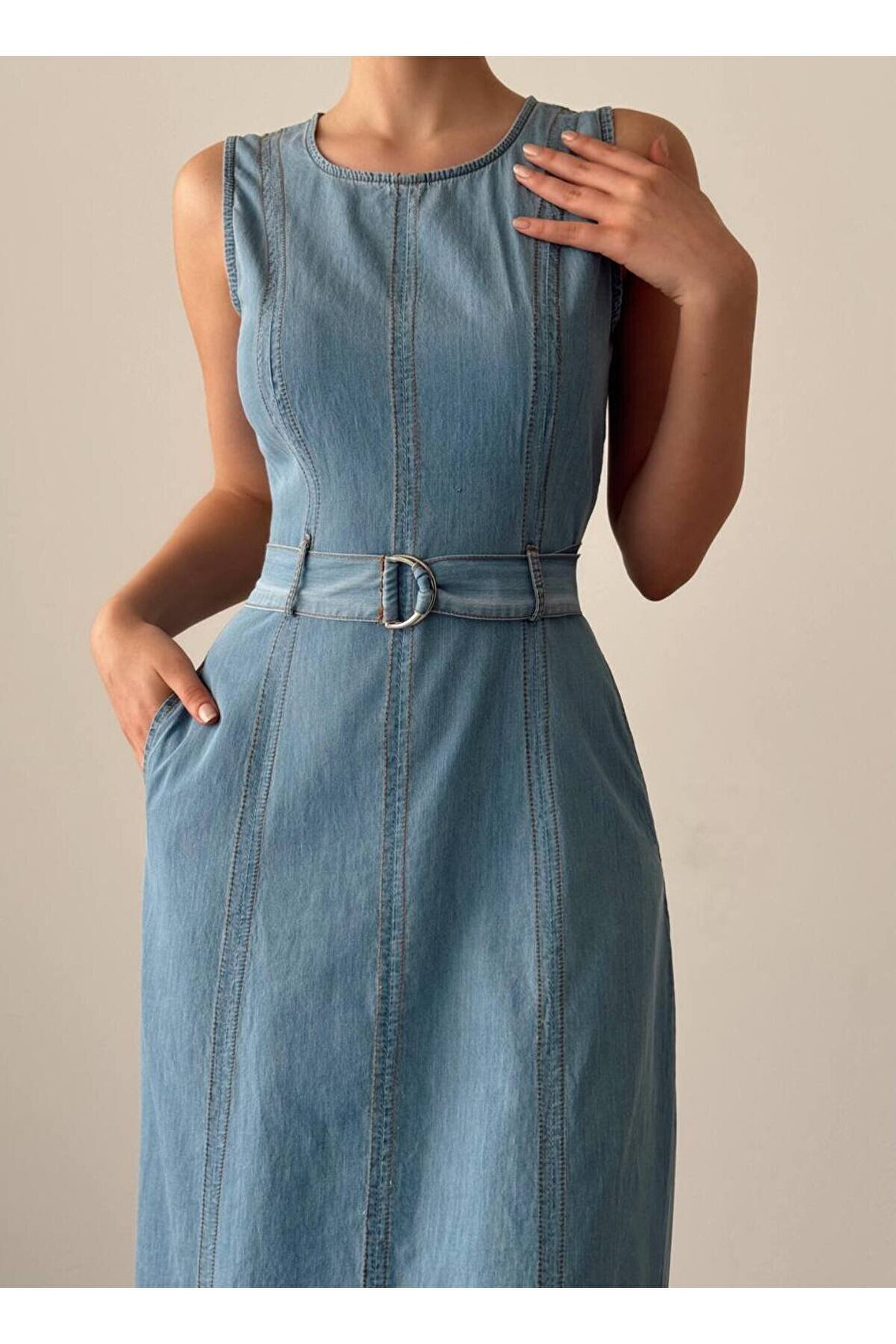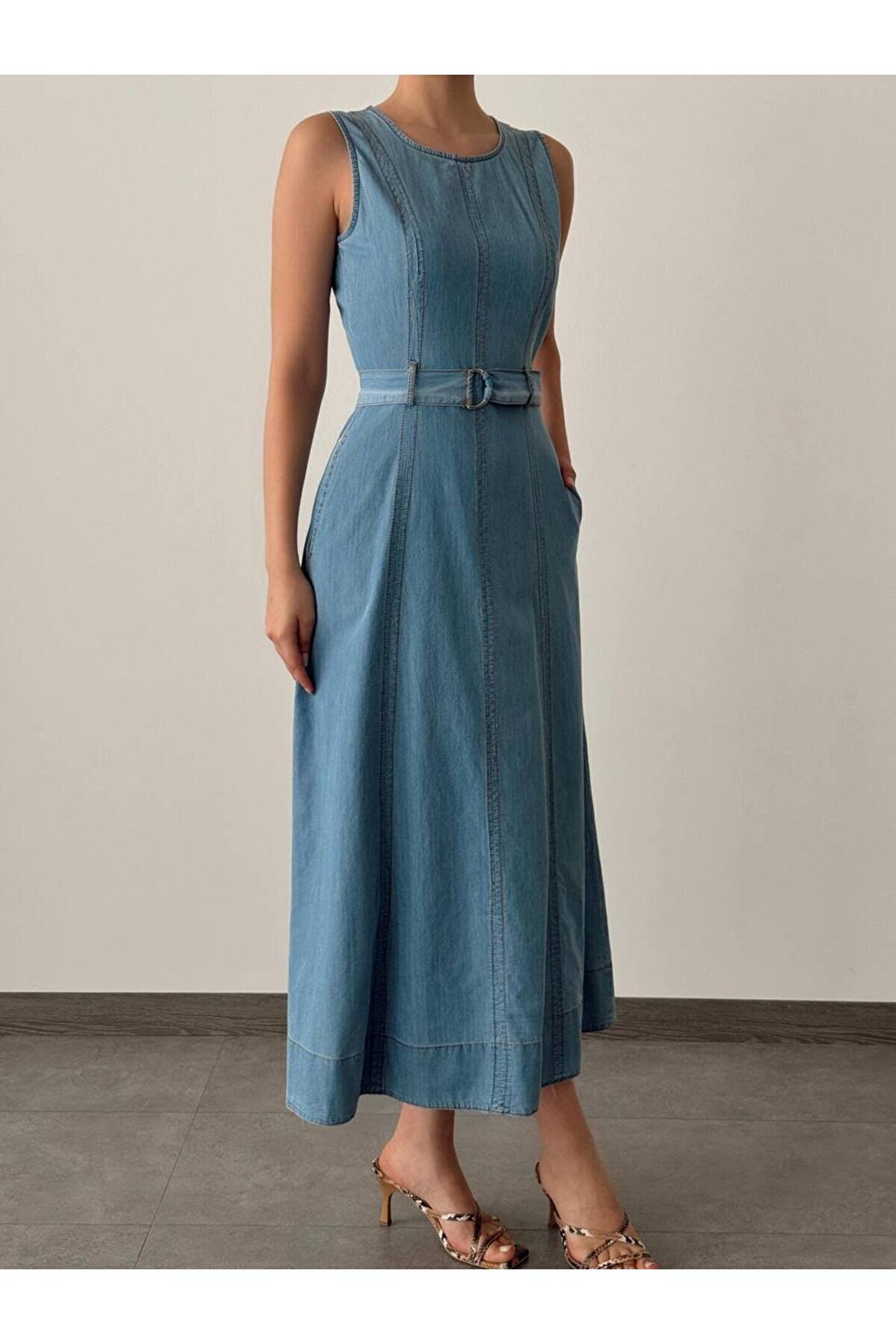 popibutik Sıfır Kol Kemer Detaylı Midi Boy Buz Mavi Elbise