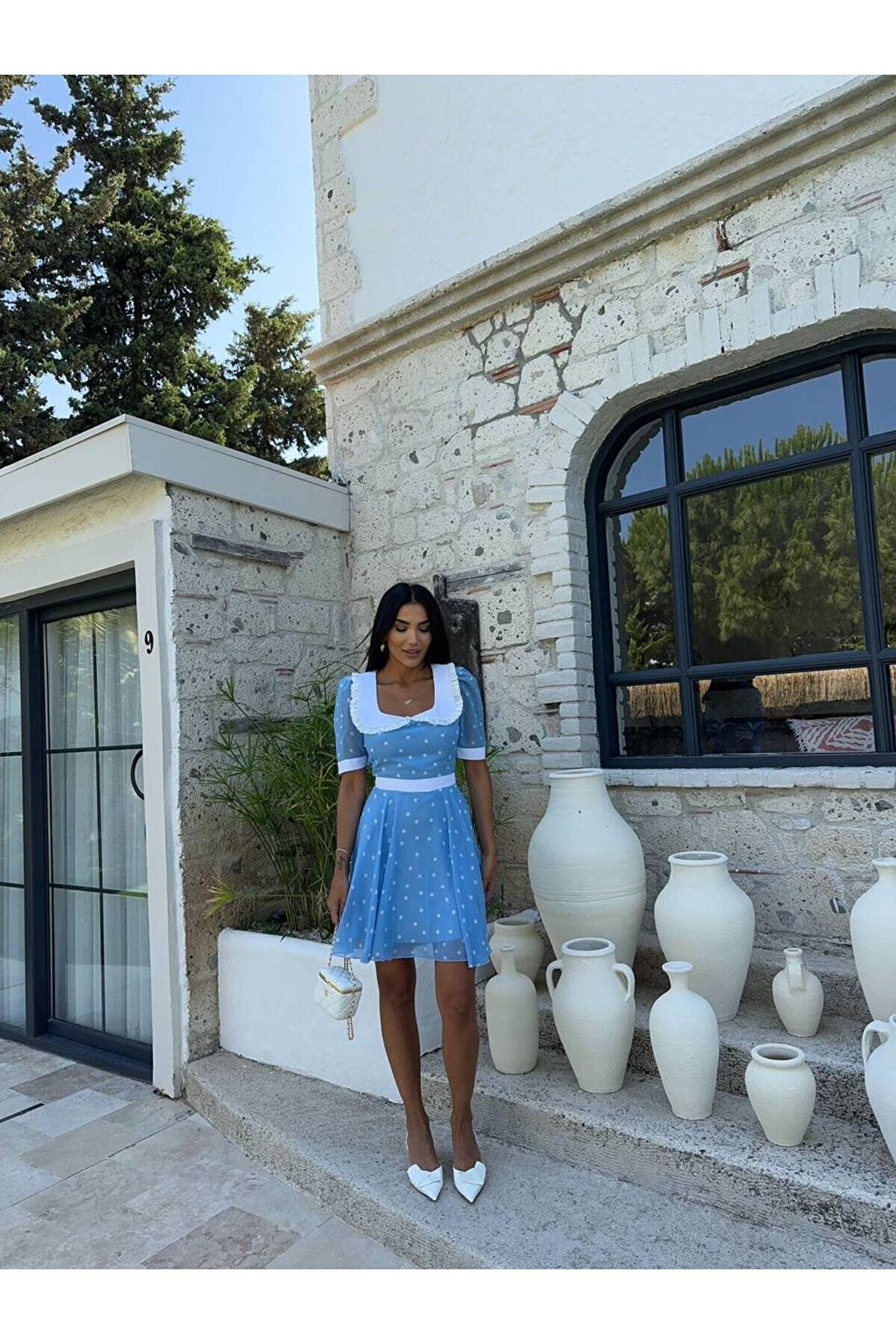 Mini boy kesimi ile genç ve dinamik bir görünüm sunar; Puantiyeli deseniyle şık ve neşeli bir stil oluşturur; Hafif ve zarif şifon kumaşı, yaz aylarında serinlik ve rahatlık sağlar; Bele oturan kalıbı sayesinde vücut hatlarını nazikçe sararak feminen bir siluet çizer; Belirtilmemiş kumaş tipi, esneklik ve konforu bir arada sunarak gün boyu rahat hareket etme imkanı tanır; Bebe yaka detayı ile zarif ve modern bir görünüm kazandırır;