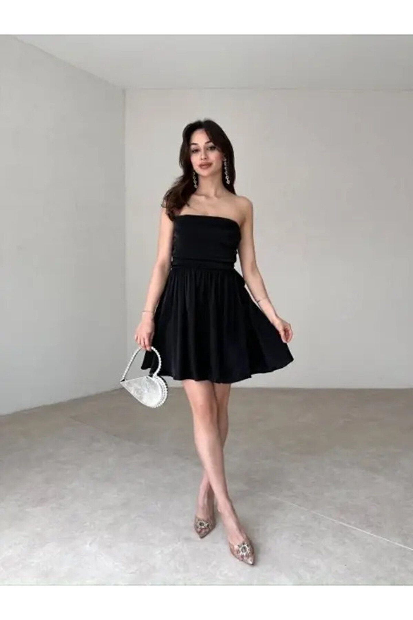 Zarif ve şık tasarımıyla dikkat çeken bu elbise, özel günlerinizde göz alıcı bir görünüm sunar; Mini boyu ile feminen ve modern bir siluet oluştururken, straplez kesimi sayesinde rahat hareket etme özgürlüğü sağlar; Dantel dokuma tipi, elbiseye sofistike bir hava katarken, siyah rengiyle her zaman asil ve şık duruşunu korur; Astarlı yapısı sayesinde konforlu bir kullanım sunarken, tüm yaş gruplarına hitap eden tasarımıyla geniş bir kullanıcı yelpazesine sahiptir; Slim kalıbı vücut hatlarını zarifçe sararak feminen bir duruş sergiler ve genç yaş grubuna özel olarak tasarlanmıştır; Parlak saten kumaşı ile ışıltınızı ön plana çıkarırken, sırt fiyonk detayıyla feminen detaylara yer vererek estetik bir dokunuş sağlar;