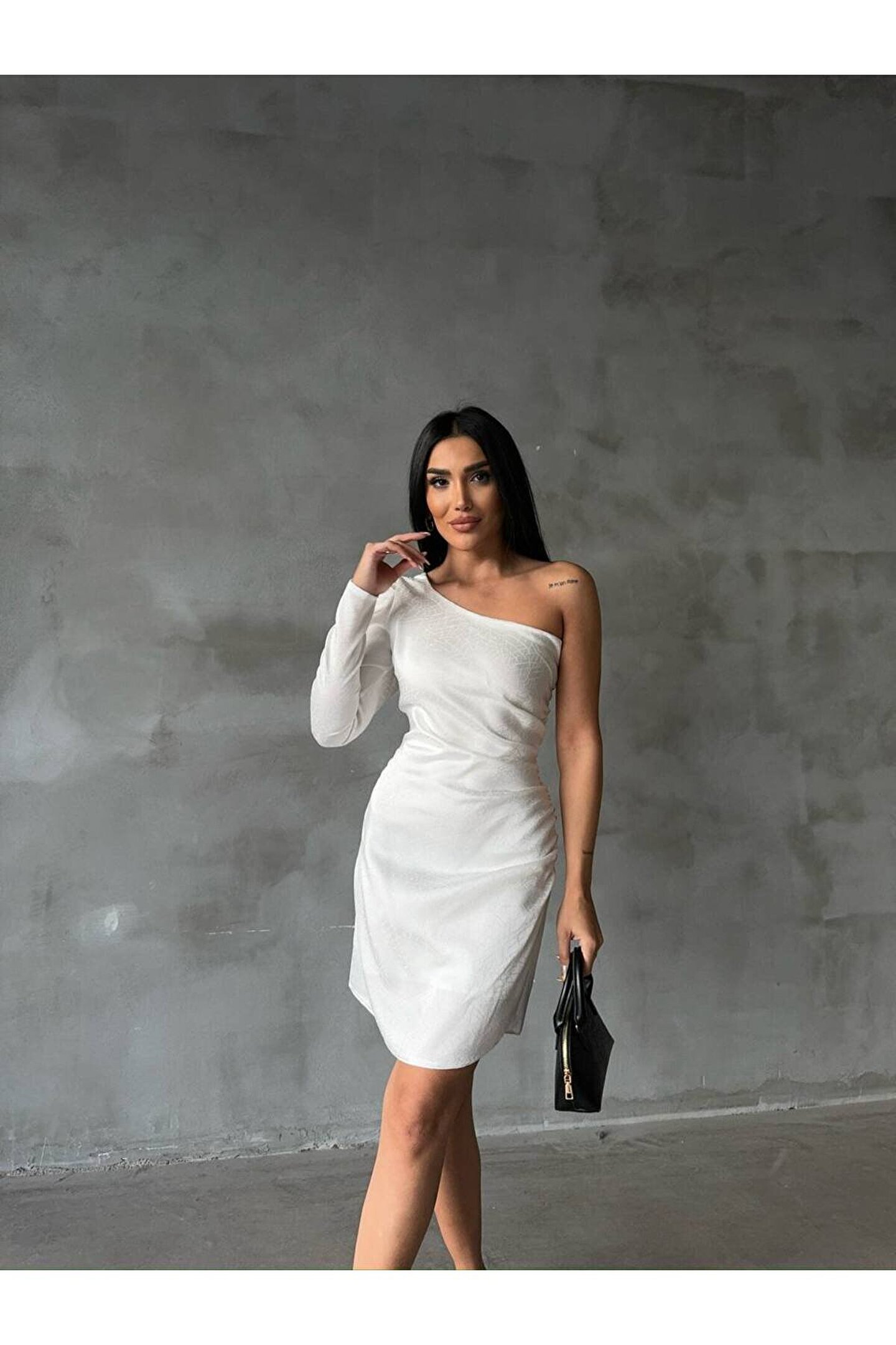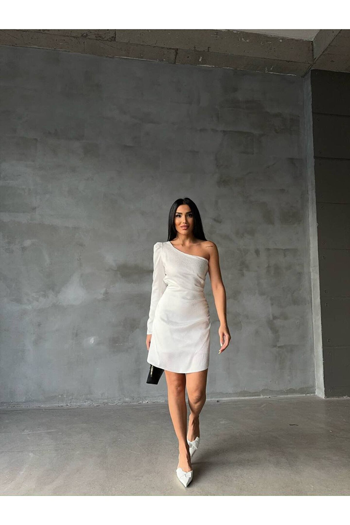 popibutik Tek Omuz Desenli Dantel Beyaz Elbise