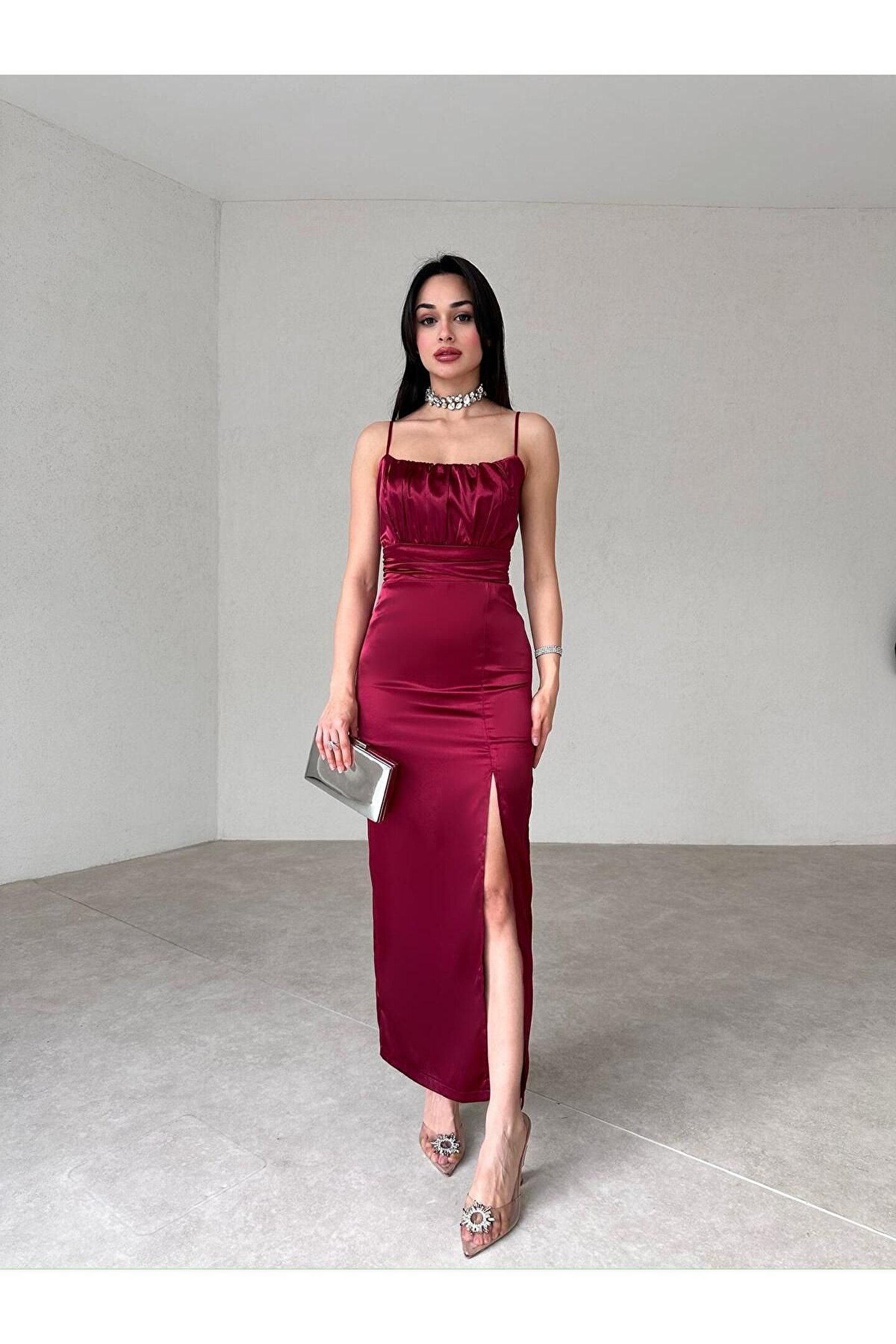 popibutik Yırtmaç Detaylı Askılı Bordo Saten Elbise
