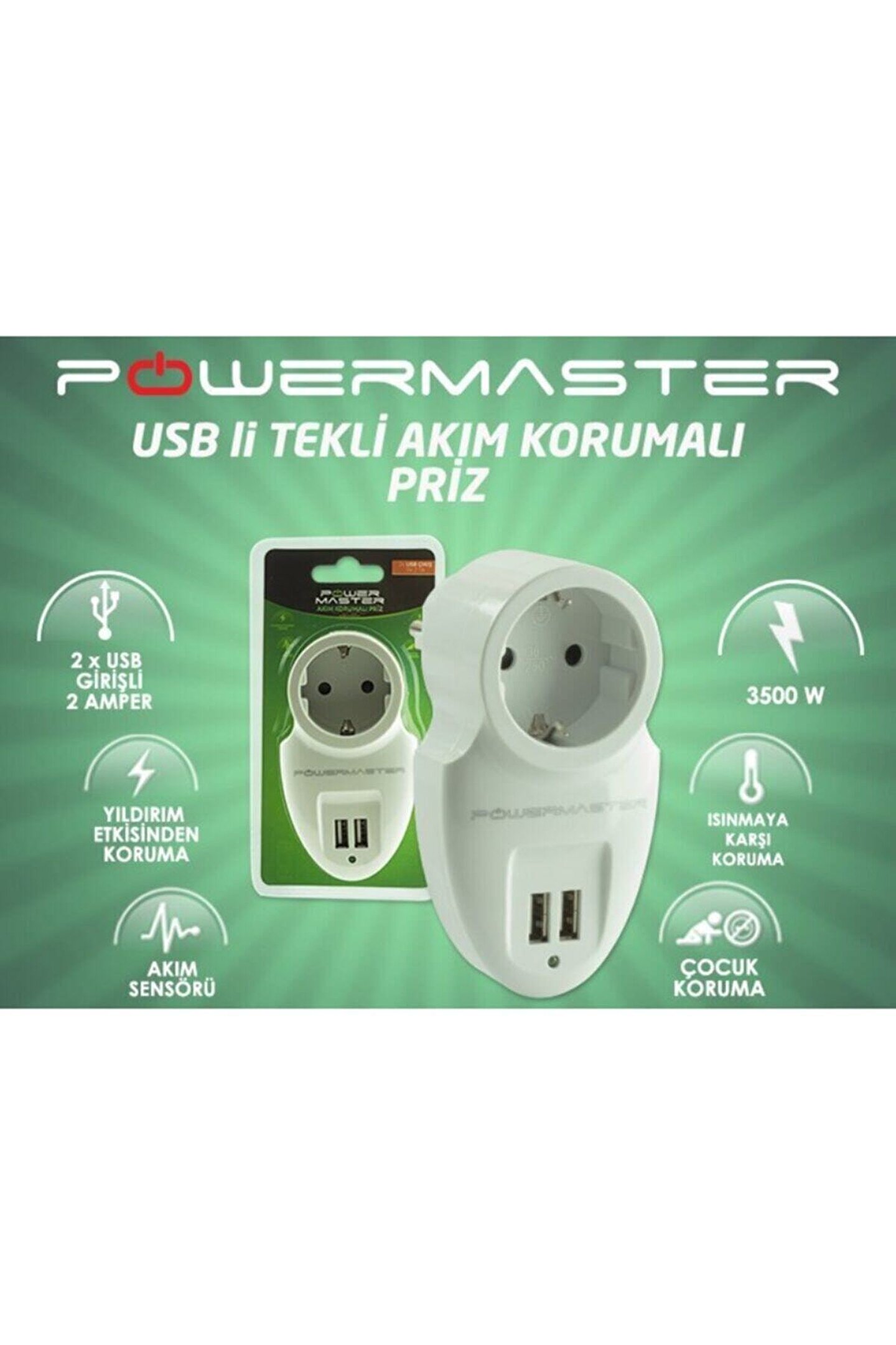 Powermaster Akım Korumalı İki Usb'li Tekli Priz Özellikleri Powermaster akım korumalı priz 2000 watt maksimum güç kaldırma kapasitesine ve yüksek joule değerine sahiptir. Olası yüksek akıma sahip elektrik yüklenmesinde veya yıldırım düşmelerinde prize bağlı cihazlarınızın zarar görmesini engeller. Özel üretilen priz modeli, yüksek watt değerine sahip motorlu cihazlara elektrik karşılayabilecek ve koruyacak donanıma sahiptir. Akım: 16 Amper Boyutlar: 79x155 mm 2x Usb Çıkış: 5V 2.0A Ağırlık: 100 gr Nominal Gerilim: 220 V Maksimum Güç: 3500W Başlıca kullanabileceğiniz cihazlar; Buzdolabı Tv/Led/Lcd Pc/Notebook Çamaşır Makinesi Klima Mikrodalga Fırın Bulaşık Makinesi Genel Özellikler Çocuk Koruması: Üründe yabancı cisimlerin sokulmasını ya da çocukların kullanmasını engelleyici kapaklar mevcuttur. Usb Çıkışları: Telefon, Tablet vb. cihazlarınız için adaptör kullanma gereği duymadan 2 Amper değerinde cihazlarınızı hızlı bir şekilde şarj edebilirsiniz. Led Göstergesi: Ürünün ön panelinde korumanın devrede olduğunu belirten led gösterge mevcuttur. Yıldırım Etkisinden Korunma: Ürün yıldırım düşmesinin zararlı etkilerinden cihazlarınızı koruyacak donanıma sahiptir. Kullanım Şekli Ürünü 220V girişine takınız. Bağlanan cihaz ya da cihazların toplam gücü 2000W üzerinde olmamalıdır. Priz üzerinde bulunan LED göstergesi yandığında koruma devrededir. Kutu İçeriği 1 Adet Powermaster Akım Korumalı İki Usb'li Tekli Priz