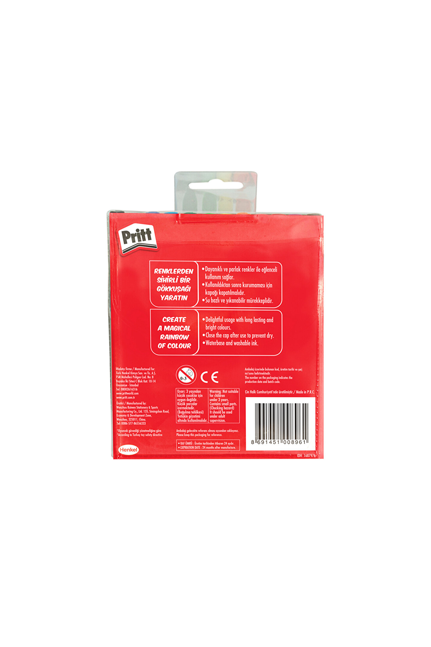 Pritt Keçeli Boya Kalemi 12 Renk;Yaratıcılığı geliştirir – Çocukların sınırsız yaratıcılıkta yazım, çizim ve boyama aktiviteleri için ideal, ilham verici 12 dayanıklı ve parlak renkli kalem.;Kurumayı önler – Özel kapak tasarımı sayesinde hemen kurumaz. Bu dayanıklı kırtasiye malzemesi çocukların hayal dünyalarına uzun süre renk katmaya devam eder.;Çocuk dostu – Çocuklara zararlı hiçbir kimyasal madde içermeyen zararsız formülüyle okulda ve evde el işi faaliyetlerinin vazgeçilmez yardımcısı sağlıklı boya.;Silinebilir – Hem sağlıklı hem pratik. Yaratıcılığın sınırlarını ortadan kaldıran bu renkli kalem seti ile istedikleri gibi boyasınlar. Su ile kolayca temizlenir.;Ambalaj içeriği – Pritt Keçeli Kalemler, yaratıcı aktiviteler için su bazlı zararsız boya, yazım, çizim ve boyama sonrası silinebilir renkli kalem, 12 Renkli Paket;Canlı renkler, eğlenceli bir dünya!;Her çocuk bir sanatçıdır! Pritt Keçeli Kalemler parlak renkleriyle çocukların yaratıcı gücünü ortaya çıkarıyor. 12 farklı renk, hayal dünyalarını renklendiriyor. Üstelik sağlıklarına hiç zarar vermeden! Bu pratik ve eğlenceli boya kalemleriyle evde ve okulda resim faaliyetleri bir partiye dönüşecek.;Çocuklar için zararlı hiçbir kimyasal madde içermeyen bu zararsız boya, çocukların güvenle vakit geçirebilecekleri bir oyun arkadaşıdır. Su bazlı formülü sayesinde çocuk dostu bu renkli kalemlerle diledikleri kadar resim yapacaklar! Üstelik özel kapak tasarımı sayesinde uzun süre dayanır, hemen kurumaz. ;Bu hem sağlıklı hem pratik kırtasiye malzemesini, çocuklar kadar büyükler de sevecek. Bırakın istedikleri gibi boyasınlar! En eğlenceli boyama partilerinden sonra bile sadece suyla silerek temizlenir. ;Ürünün Başlıca Faydaları:;Canlı renkleriyle çocukların eğlenceli bir dünya yaratmasını sağlar;Su bazlı formülü ile çocuk sağlığına zararsızdır;Uygulamadan sonra su ile silinebilir;Özel kapak tasarımı sayesinde hemen kurumaz;12 Renkli Paket