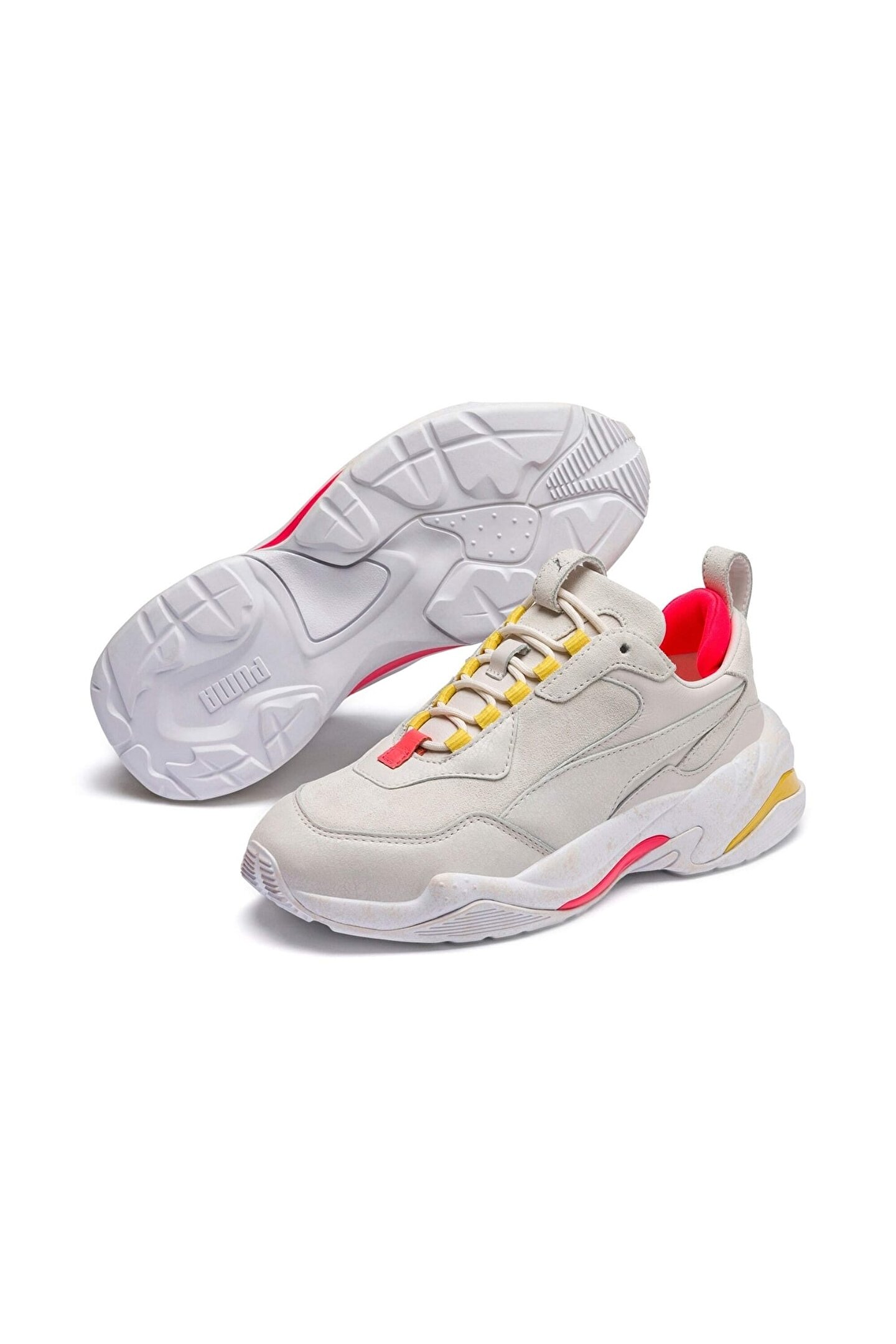 369978_02; ÜRÜN HİKAYESİ Thunder Distressed Kadın Ayakkabı'nın yapılandırılmış likra ve sentetik panelden oluşan süet dış yüzeyi modele endüstriyel bir hava veriyor; Bu estetiğin bir parçası olarak yıpranmış görünümlü bir orta taban kullanılırken, IMEVA yastıklama özellikliği rahat bir yürüyüş sağlıyor; Modelde kavrayış sunan kauçuk dış taban bulunuyor; Dil şeridinde yer alan ve hemen göze çarpmayan PUMA Cat Logosu ise görünümü minimalist bir düzeyde tutuyor; ÖZELLİKLER + FAYDALAR IMEVA: PUMA'nın tüy gibi hafif ve rahat bir performans hissi sağlayan orta taban teknolojisi DETAYLAR Likra ve sentetik parçalı süet dış yüzey Kavrayış sağlayan kauçuk dış taban Ayağı iyi kavrayan bağcık tasarımı PUMA CELL koleksiyonundan alınan ilham Ortada ve yanlarda klasik PUMA Formstrip deseni Dil şeridinde PUMA Cat Logosu;