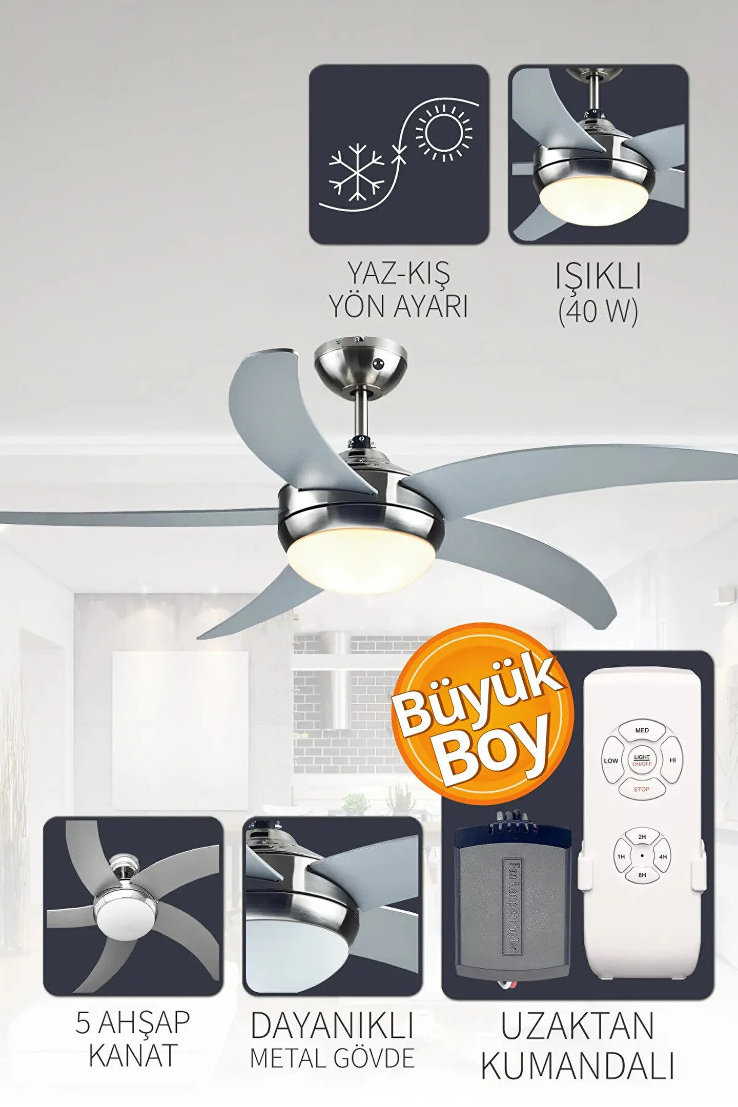 Uzaktan kumanda özelliği sayesinde, tavan vantilatörünüzü rahatça kontrol edebilir ve istediğiniz hızda kullanabilirsiniz.; ; Aydınlatma özelliği ile hem serinlik hem de aydınlatma ihtiyacınızı tek bir cihazda karşılar.; ; 132 cm çapındaki geniş kanat yapısı, odanızın havasını etkili bir şekilde dolaştırır.; ; 2 yıl garanti süresi ile satın alma sonrası güvenli bir kullanım sunar.; ; Ahşap materyal kullanımı, doğal bir görünüm ve dayanıklılık sağlar.; ; 5 kanat tasarımı, daha geniş bir hava akışı sağlayarak konforlu bir ortam yaratır.; ; Beyaz renk seçeneği ile mekanınıza modern ve şık bir dokunuş katar.; ; Yetkili servis ile tamir edilebilirlik özelliği, olası teknik sorunlarda profesyonel destek almanızı sağlar.