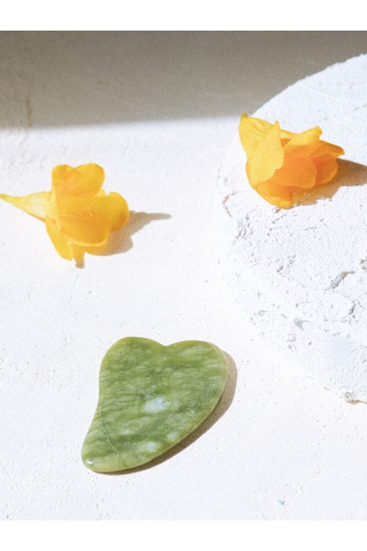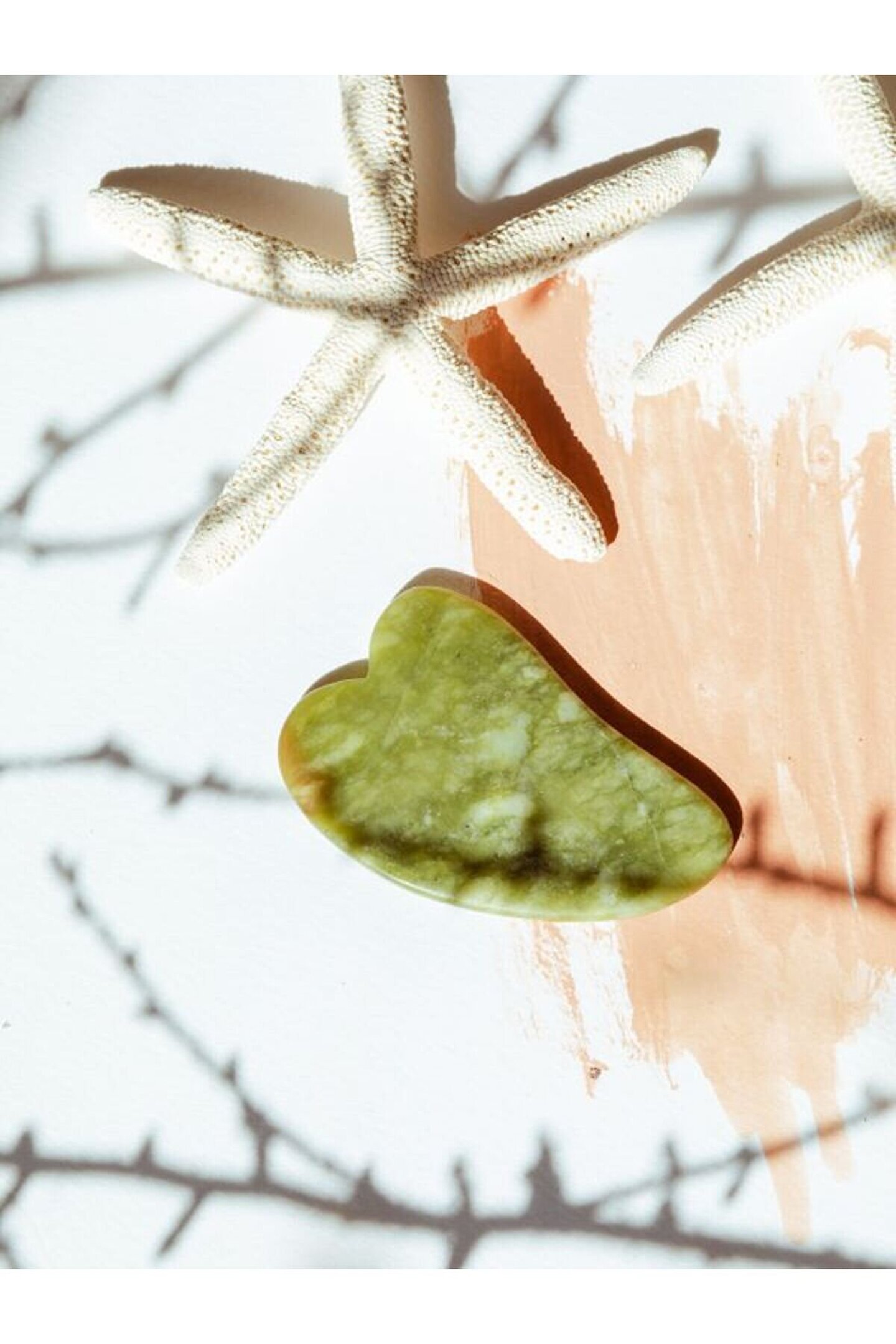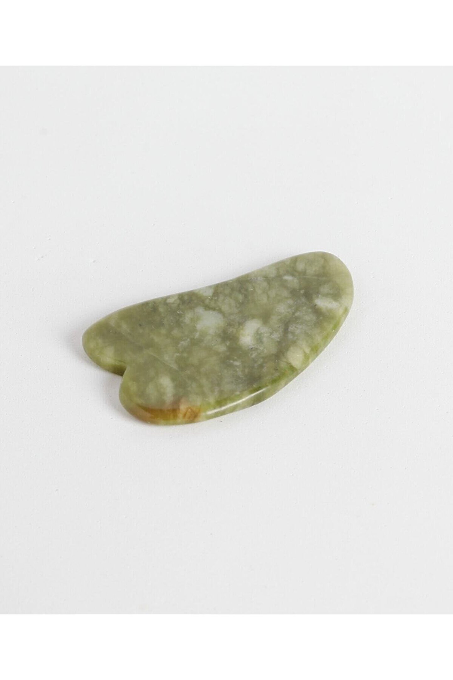 %100 Yeşim (Jade) taşıdır. ; Gua Sha, genellikle yeşim taşı ve rose kuvars gibi değerli taşlardan yapılan yuvarlak hatlara sahip vücut masaj aletleridir. ; 'Gua' ovmak anlamına gelir ve 'sha', kullanımdan sonra cilt yüzeyinde kalan kızarıklığın bir tanımıdır. ; Gua Sha masaj aletini vücutta kullanarak cilt yüzeyinde kan dolaşımı hızlandırılmasına yardımcı olur. ; Gua Sha, sırt, omuz, boyun ve bacak ağrılarını gidermeye yardımcı olmak için de kullanılabilir. ; Gua Sha tüm vücuda uygulanabilir. ; Kalp şeklindeki Jade (Yeşim) Gua Sha, Uygulanan bölgede "lifting” etkisi sağlar. ; Lenfatik dolaşımı hızlandırır ve kan dolaşımını artırır. ; Oksijenin cilt katmanlarına derinlemesine nüfuz etmesini teşvik eder. ; Ciltte sıkışmış toksinlerin salınmasına ve kolajen üretiminin uyarılmasına yardımcı olur. ; Düzenli kullanımda kırışıklıkların görünümünü azaltır ve cildin elastikiyetini arttırır. ; Genel cilt görünümünüze ışıltı ve parlaklık sağlar. ; Kullanımı Root Aromaterapi %100 doğal Sabit Yağ serisinden cilt tipinize uygun bir yağı cildinize uyguladıktan sonra çene hattı, yanak, elmacık kemiklerin, boyun, alın, kaş ve göz altlarına 2-3 dk boyunca uygulayın. ; Çene ve yanak bölgesi için çene hattından kulak memesi hizasına doğru uygulayın. ; Göz altı için nazikçe gözünüzün iç köşesinden dışa doğru hareket ettirin. ; Çift Başlıklı Facial Roller ve Gua Shanın rahatlatıcı ve sıkılaştırıcı etkisini artırmak için buzdolabında saklayınız. ; Çift Başlıklı Facial Roller ve Gua Sha, genel cilt görünümünüze etkisini arttırmak için Root Aromaterapi %100 doğal Sabit Yağ serimizi kullanabilirsiniz. ; Doğal taş roller ve gua shalar cildinize uyguladığınız yağ, serum ve krem gibi cilt bakım ürünlerinin emilimini arttırır. ; Temizlik Ürün yüzeyini kimyasal ve tahriş edici maddeler içermeyen sabunlu su ile nemlendirilmiş bir bez ile nazikçe siliniz. ; Not: Asla yüksek sıcaklıktaki su ile temizlemeyin. ; Ürünü direkt su içine daldırmayın.;