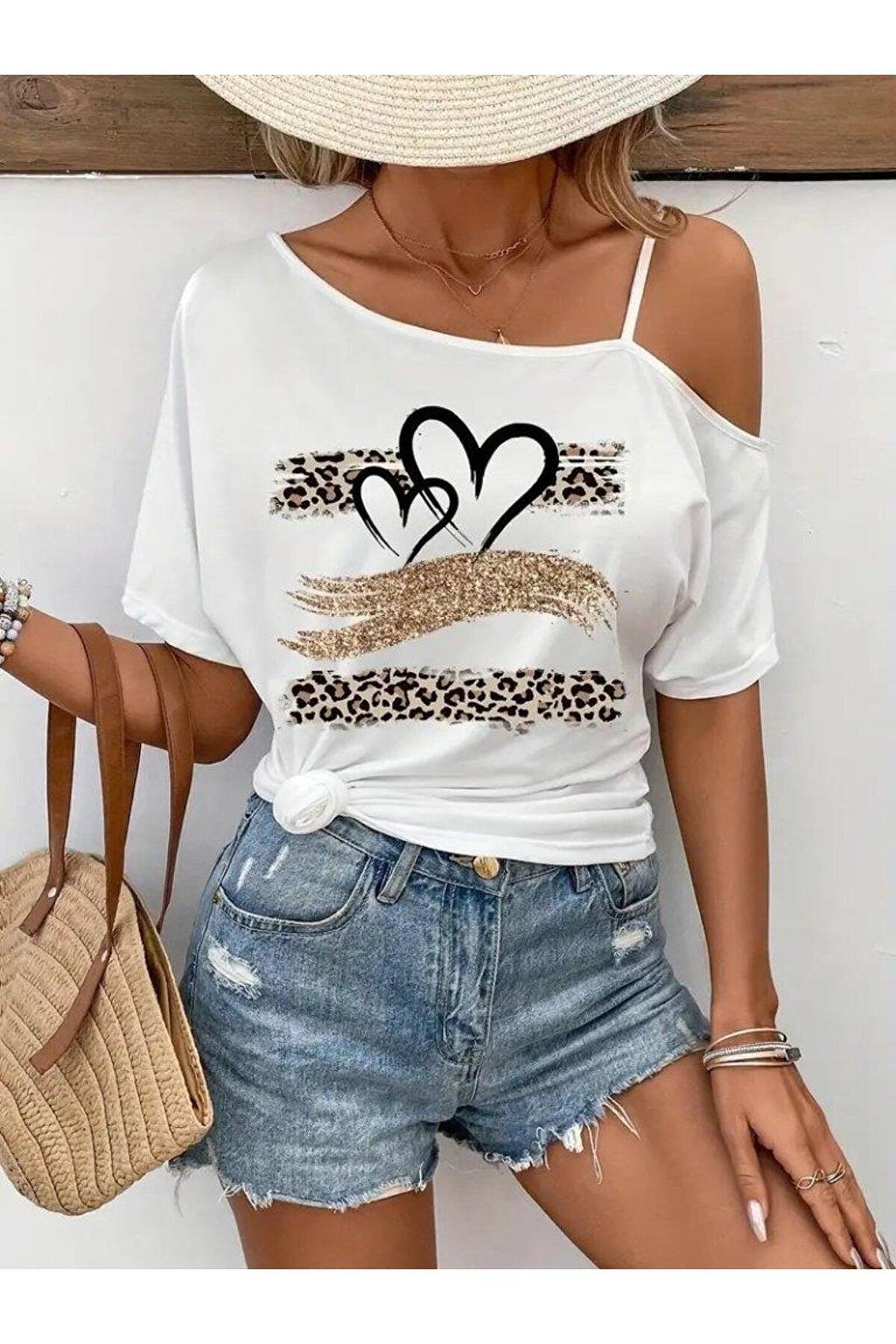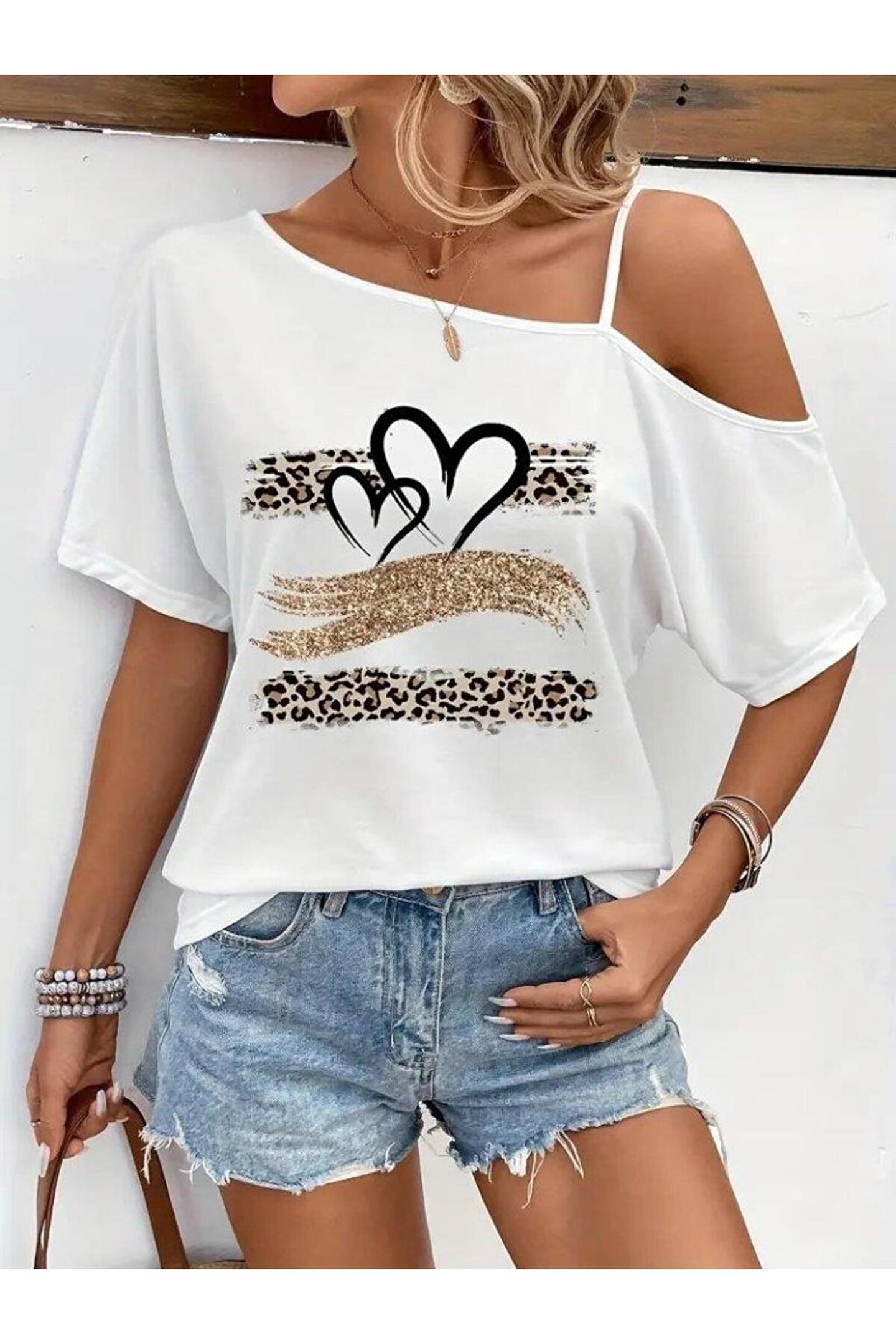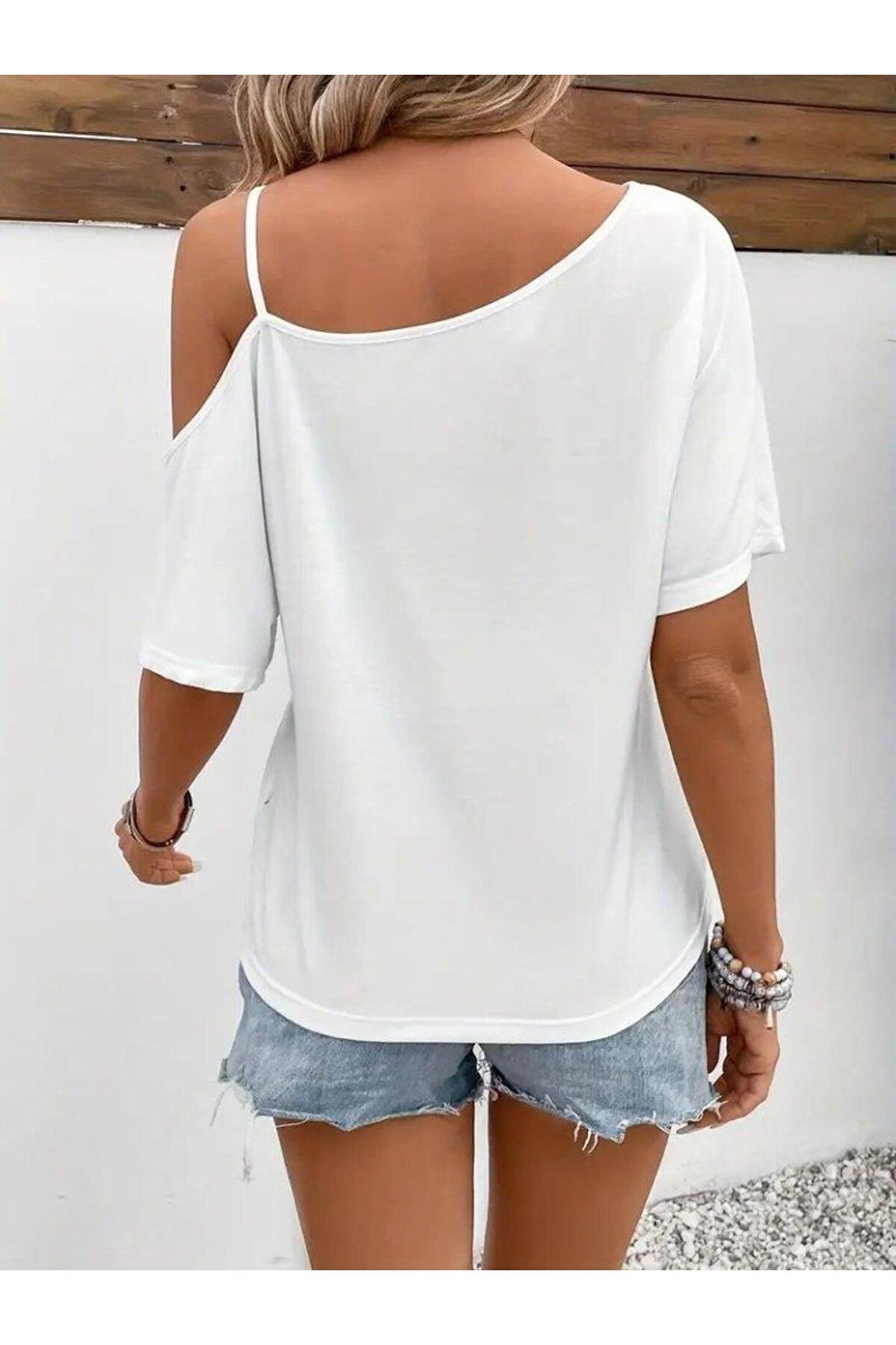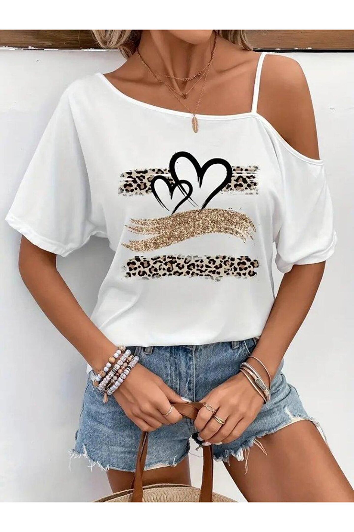 Kadın Tek Omuzu Açık Ip Askılı Baskılı Viskon Bluz
