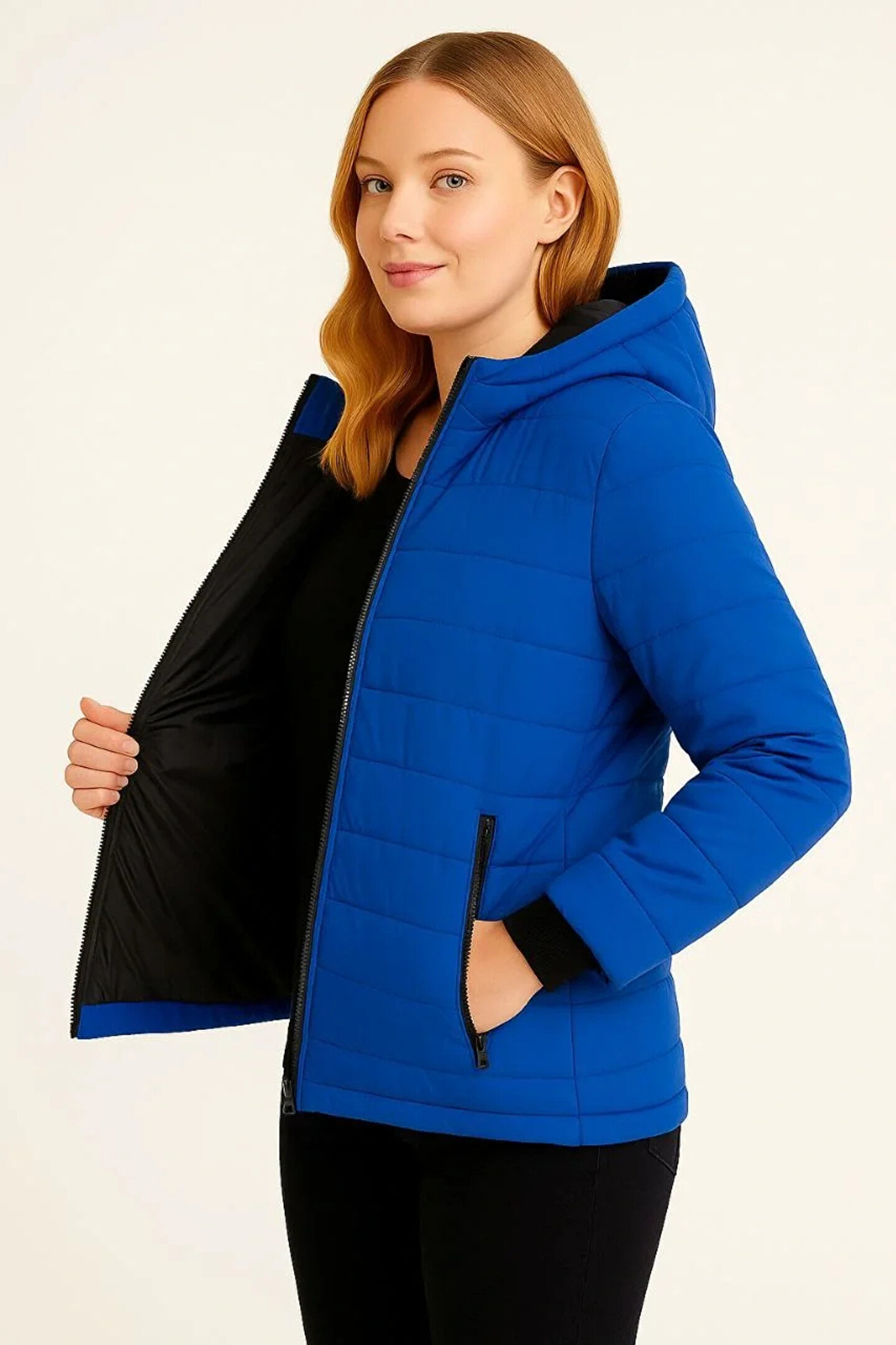 ruum fashions Kadın Şişme Kapüşonlu Fermuarlı Mont Su itici Kapitone Astarlı Kumaş Cepli Kışlık Rahat Kalıp - Saks