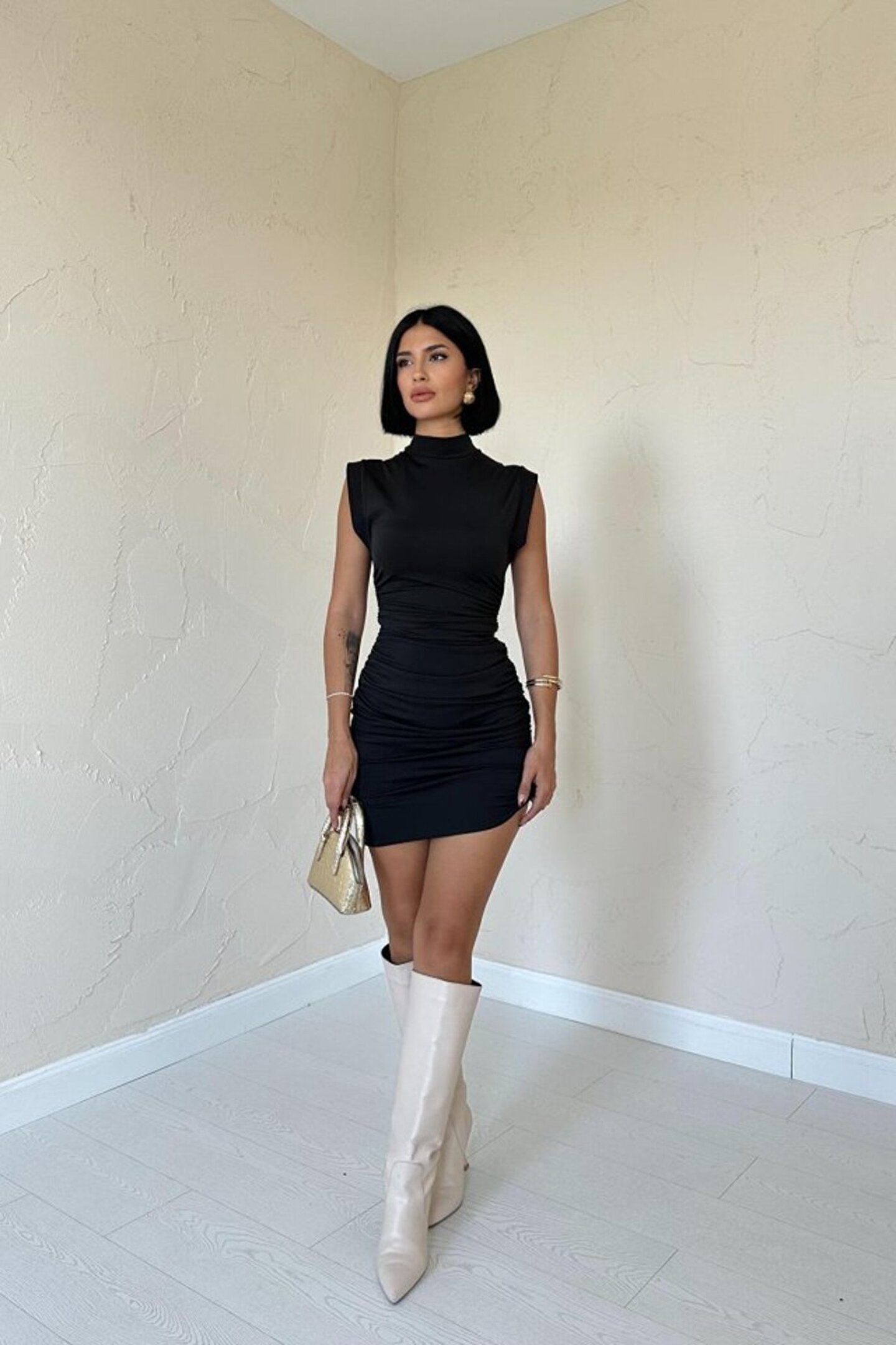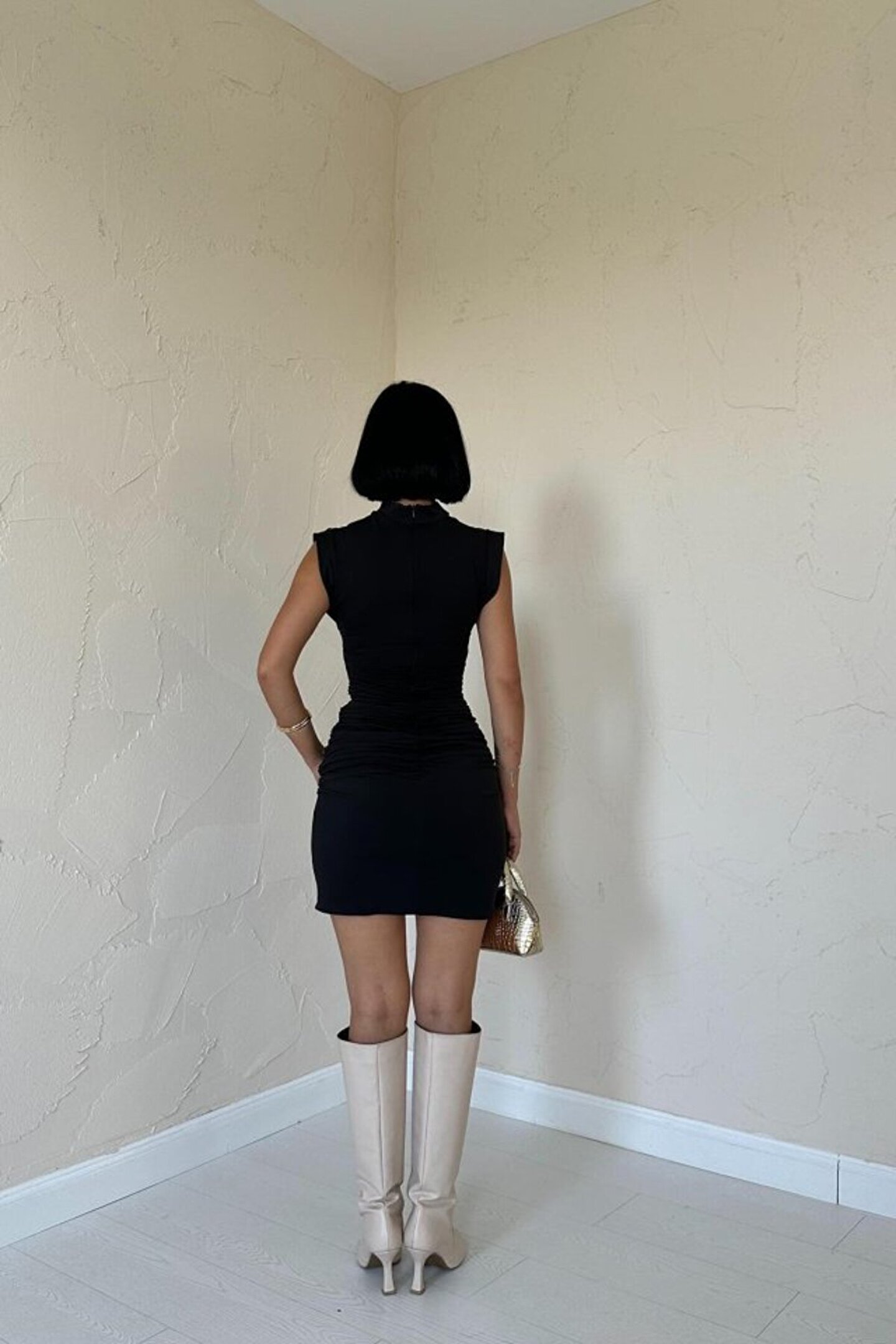 Siyah Büzgülü Kolsuz Elbise