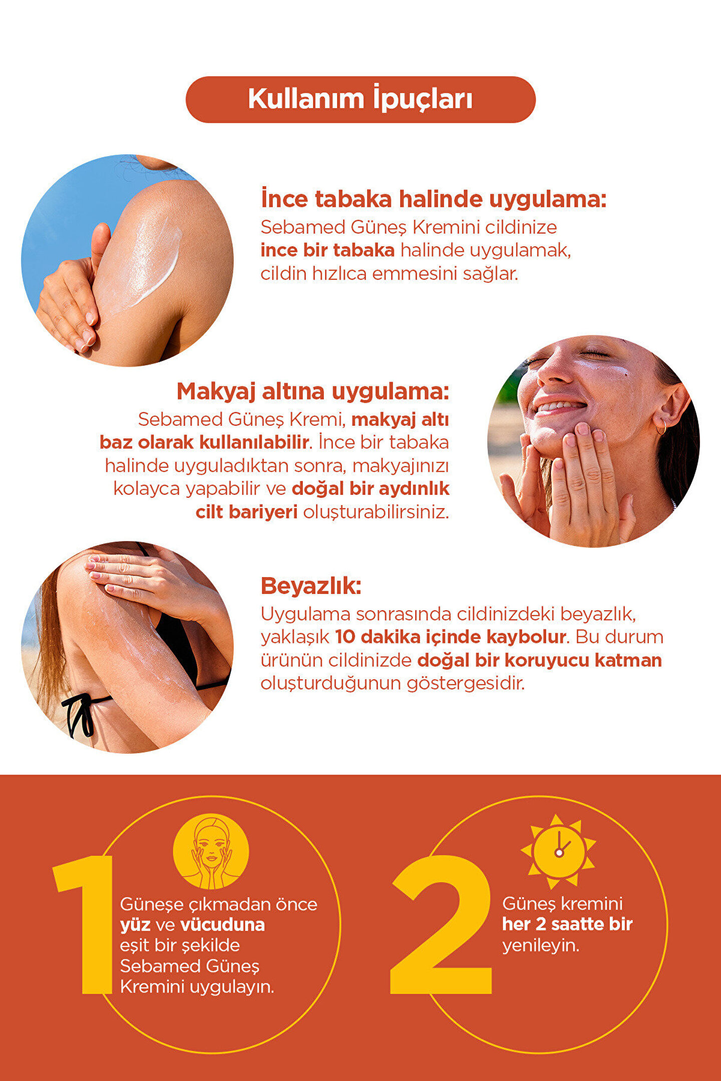 - Sun Care 50+ SPF UVA / UVB Filtresi ve E Vitamini Üçlü Yüksek Koruma Çok Yönlü Güneş Kremi 50 ml;- Sebamed Çok Yönlü Koruyucu Güneş Kremi 50 ML 50 SPF, yüksek etkili UVA/UVB filtre sistemi, E vitamini ile birlikte, cildinizi güneşin zararlı ışınlarına ve tahrişe karşı korumaya yardımcı olur.;- İnülin ve Lesitin ile yoğun nemlendirme sağlar.;- Provitamin B5 ile cildi canlandırır.;- Hassas ciltler için uygundur.;- Suya dayanıklı formülü sayesinde deniz kenarında, spor yaparken ve günlük yaşamda kullanım için uygundur.;- Güneş Koruma ürünlerini, güneşe çıkmadan 20 dakika önce kullanınız.;- Cilde eşit miktarda dağıtarak ve nazik bir şekilde masaj yaparak uygulayınız.;- Ürünü bol miktarda uygulayınız, az miktarda sürersiniz koruma etkisi azalacaktır.;- Özellikle terledikten, yüzdükten veya havluyla kuruladıktan sonra korumanın devam etmesi için uygulamayı tekrarlayınız.