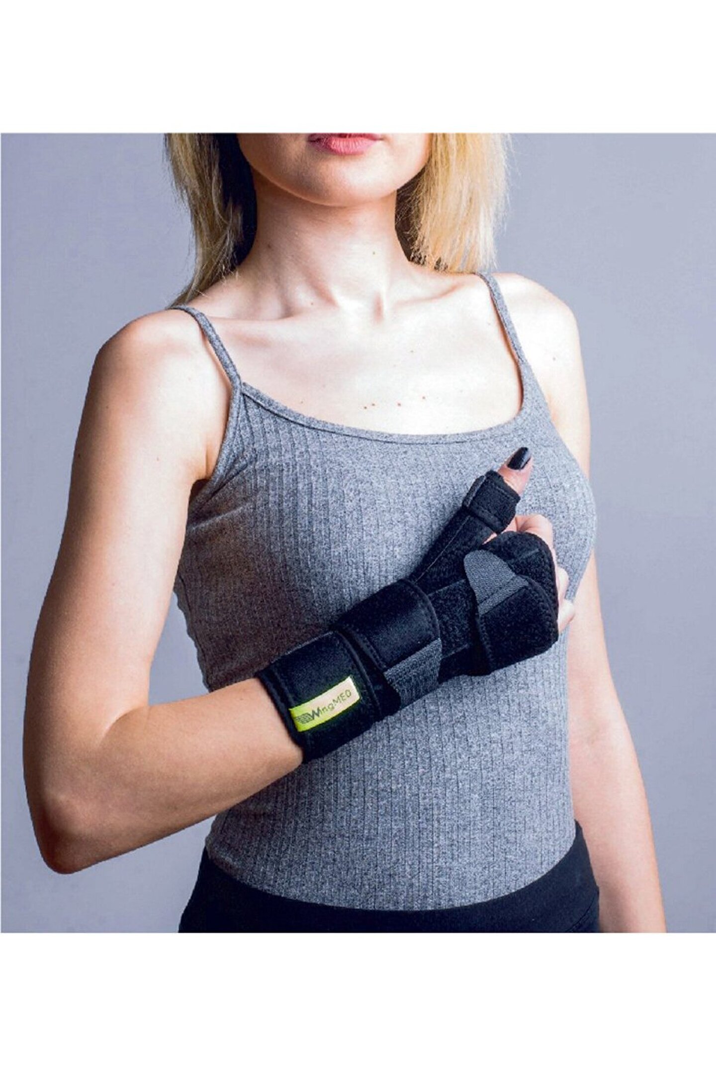 Başparmak Destekli El Bilek Ateli Açıklama Bileğin ve başparmağın nötral pozisyonda immobilizasyonunu sağlayan bir atel çeşididir. İçerisinde bileğin alt tarafında ve başparmak yanında birer alüminyum destek mevcuttur. Bileğin altındaki desteğin yeri değiştirilerek 2 elde de kullanımı mümkündür. ÜRÜN BEDEN ÖZELLİKLERİ Standart Bedendir