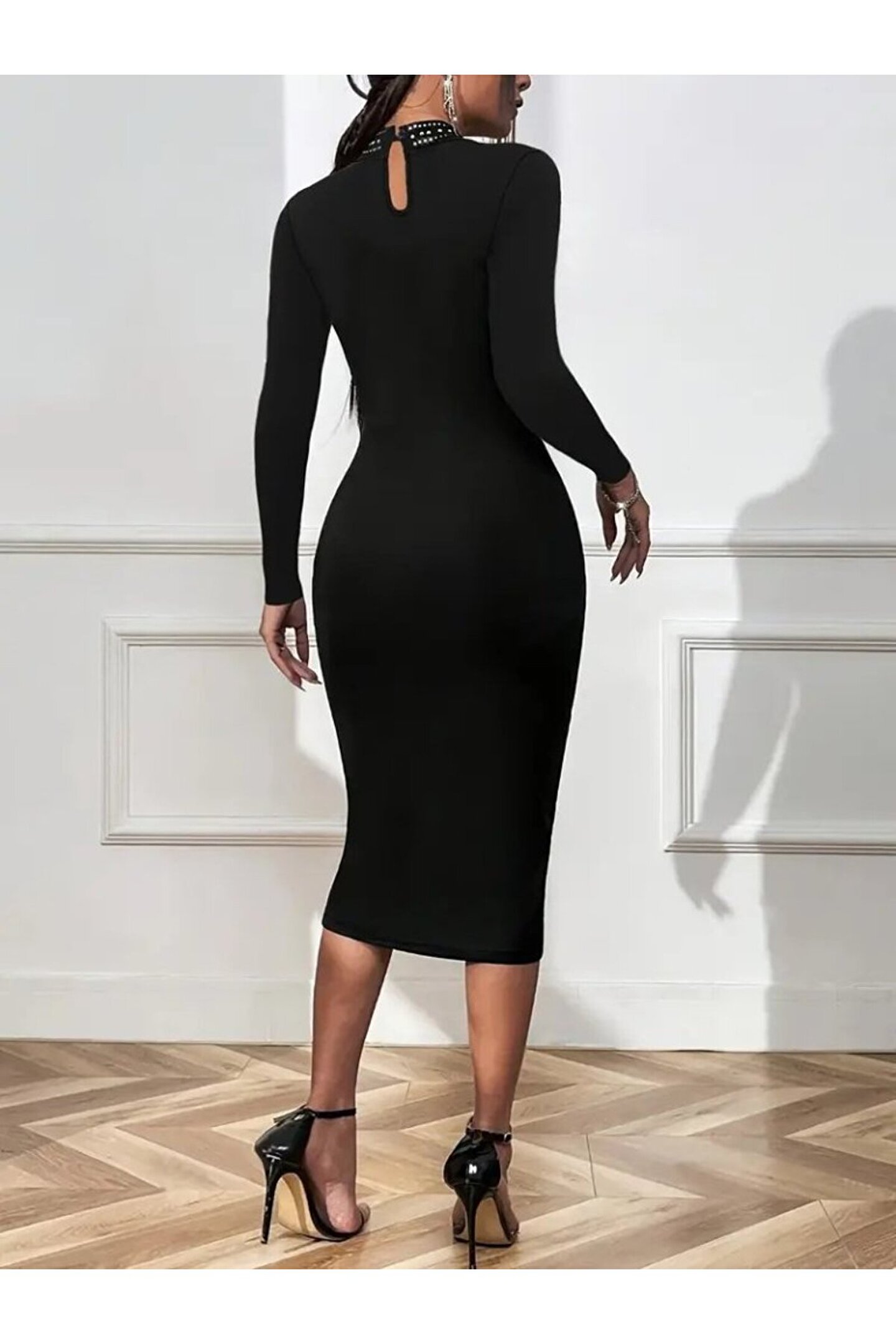 Kadın Uzun Kollu Balıkçı Yaka Taşlı Damla Detay Midi Ithal Krep Elbise