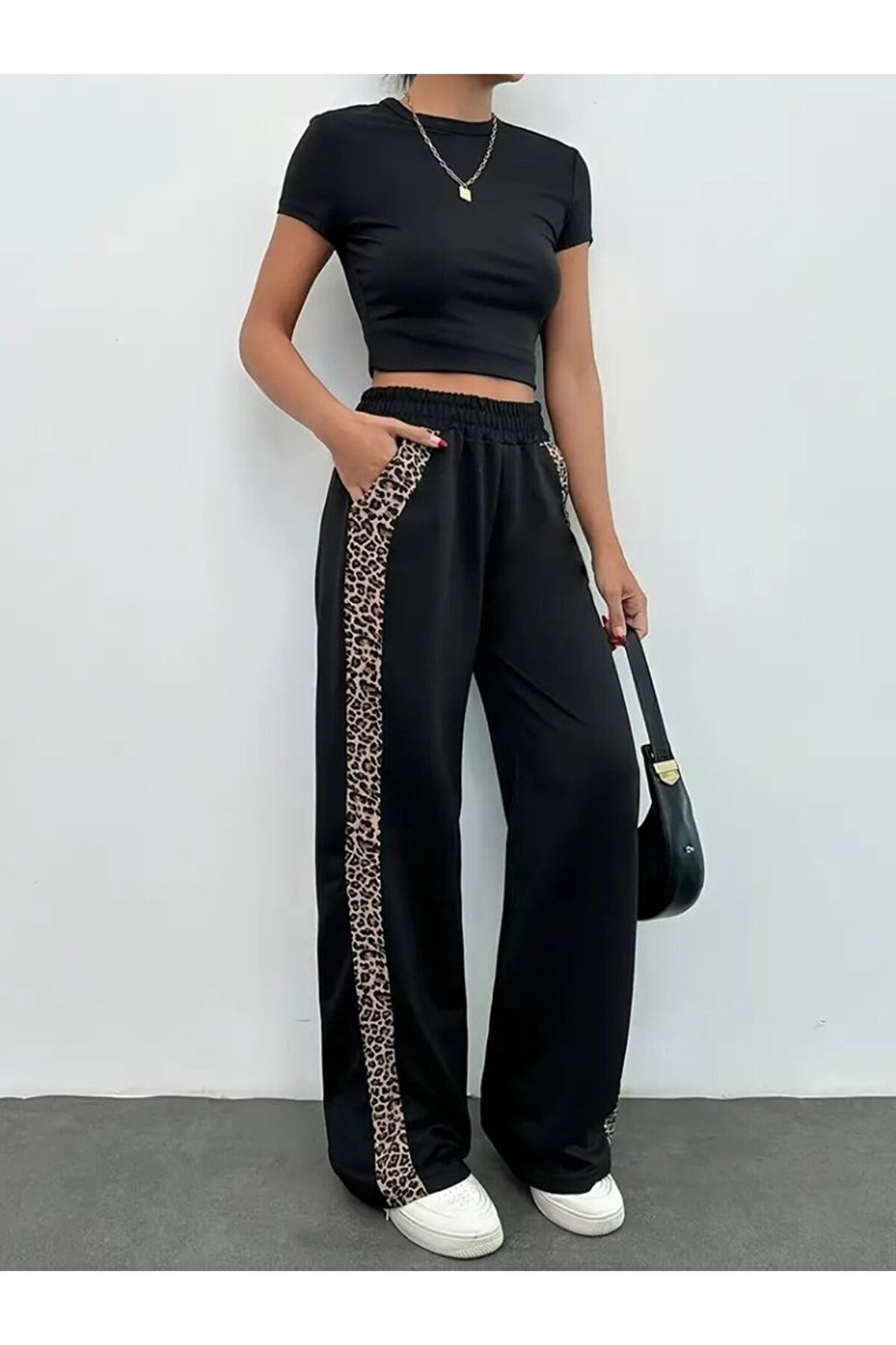 Kadın Yüksek Bel Bağcıklı Yanları Leopar Desenli Viskon Iki Iplik Pantolon