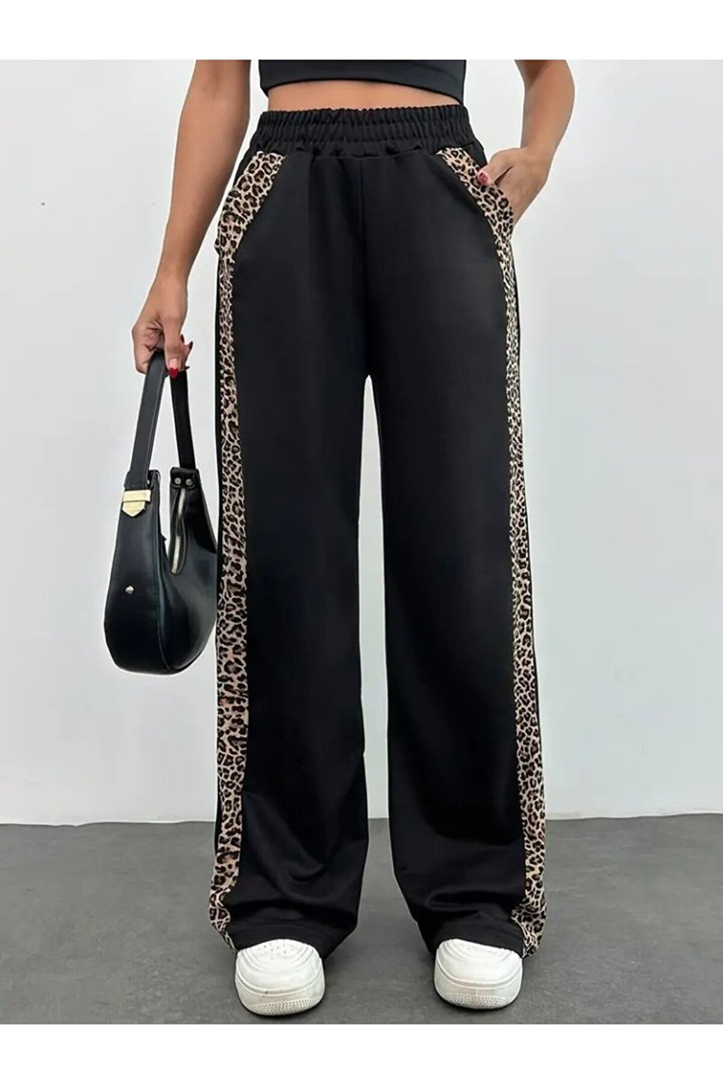 Serero EQURİ Kadın Yüksek Bel Bağcıklı Yanları Leopar Desenli Viskon Iki Iplik Pantolon