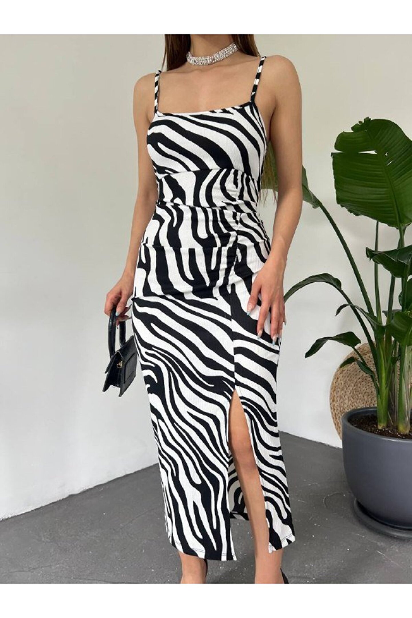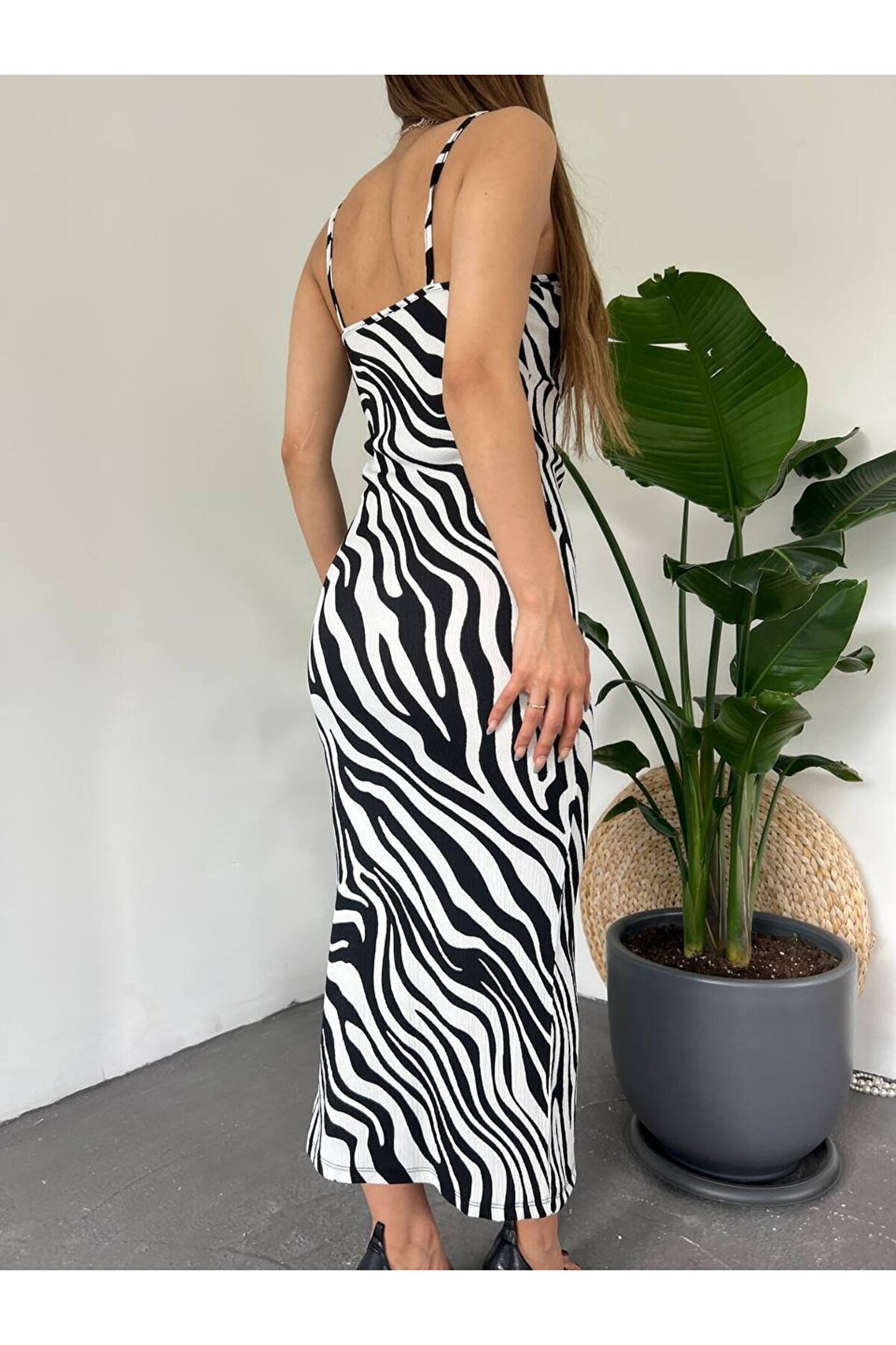 Kadın Zebra Baskılı Omuz Askılı Sırt Dekolteli Yırtmaç Detay Elbise